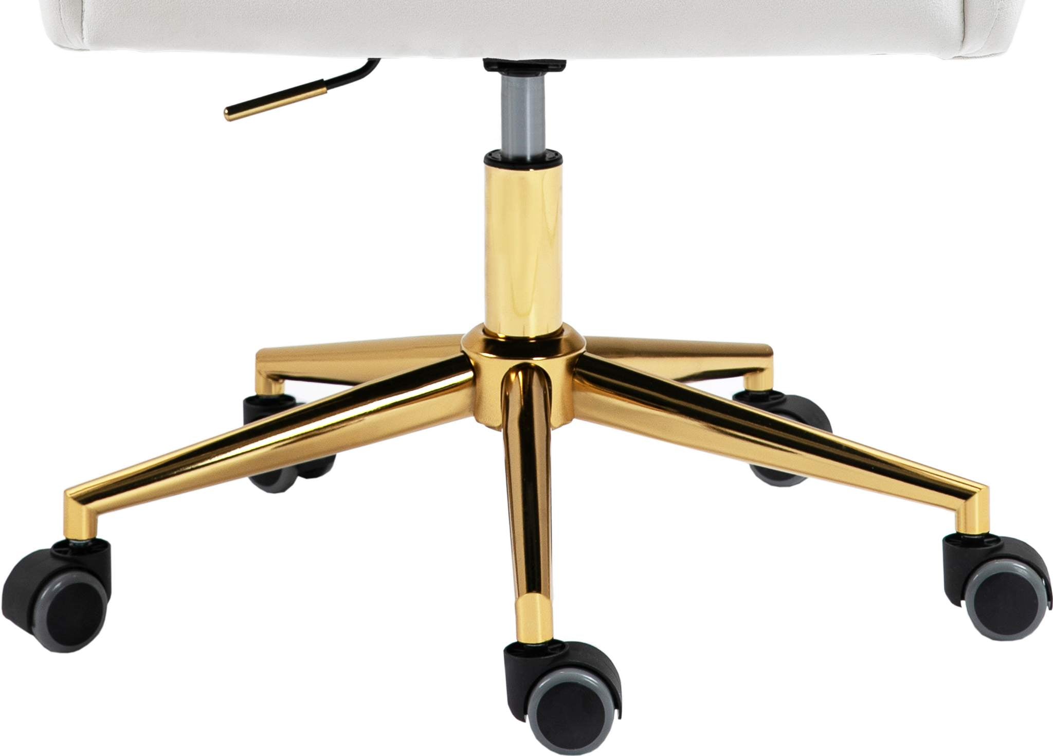Bring functional beauty to the limelight whenyou'rere seated in the comforting confines of this Karina Velvet Office Chair. This chair isn't just another handsome face for your office, althoughyou'rell fall for its soft cream velvet upholstery and rich gold base. This contemporary chair is just as utilitarian as it is attractive, with its swiveling design and five-star base with casters to make it easy to maneuver around your workstation. The chair is also adjustable, so it's easy to get comfortable and find your favorite sitting position.