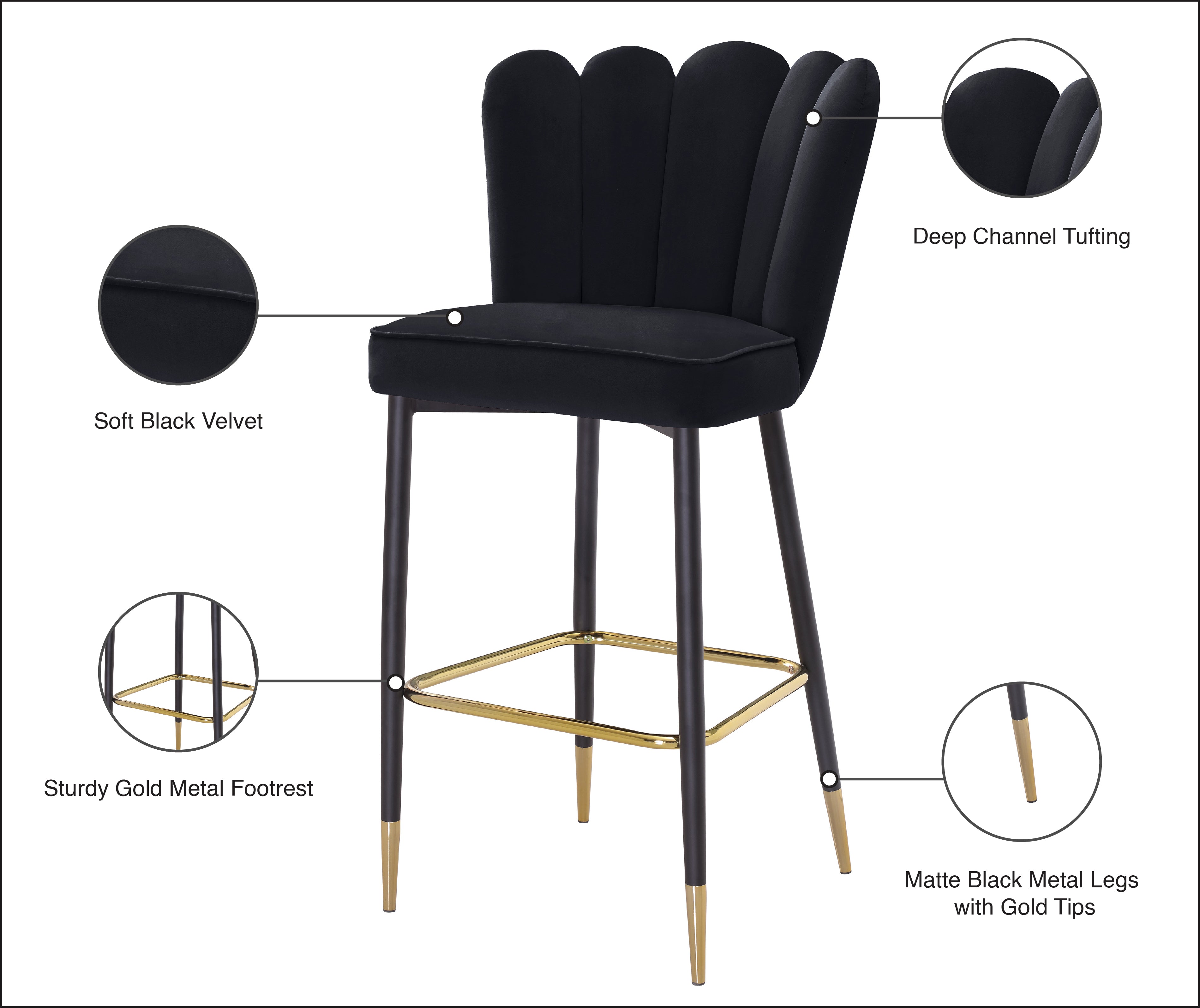 Fall fast and hard for the beautiful look of this Lily Bar Stool from Meridian Furniture. This lovely stool features a striking black velvet fan-style back with deep tufting that helps the padding inside stay full and aloft for added comfort. The cushioned seat and back are upholstered to the hilt for maximum luxury and beauty. Black metal legs with a matte finish and gold tips add contemporary appeal to this handsome stool whether used at the bar or kitchen counter.