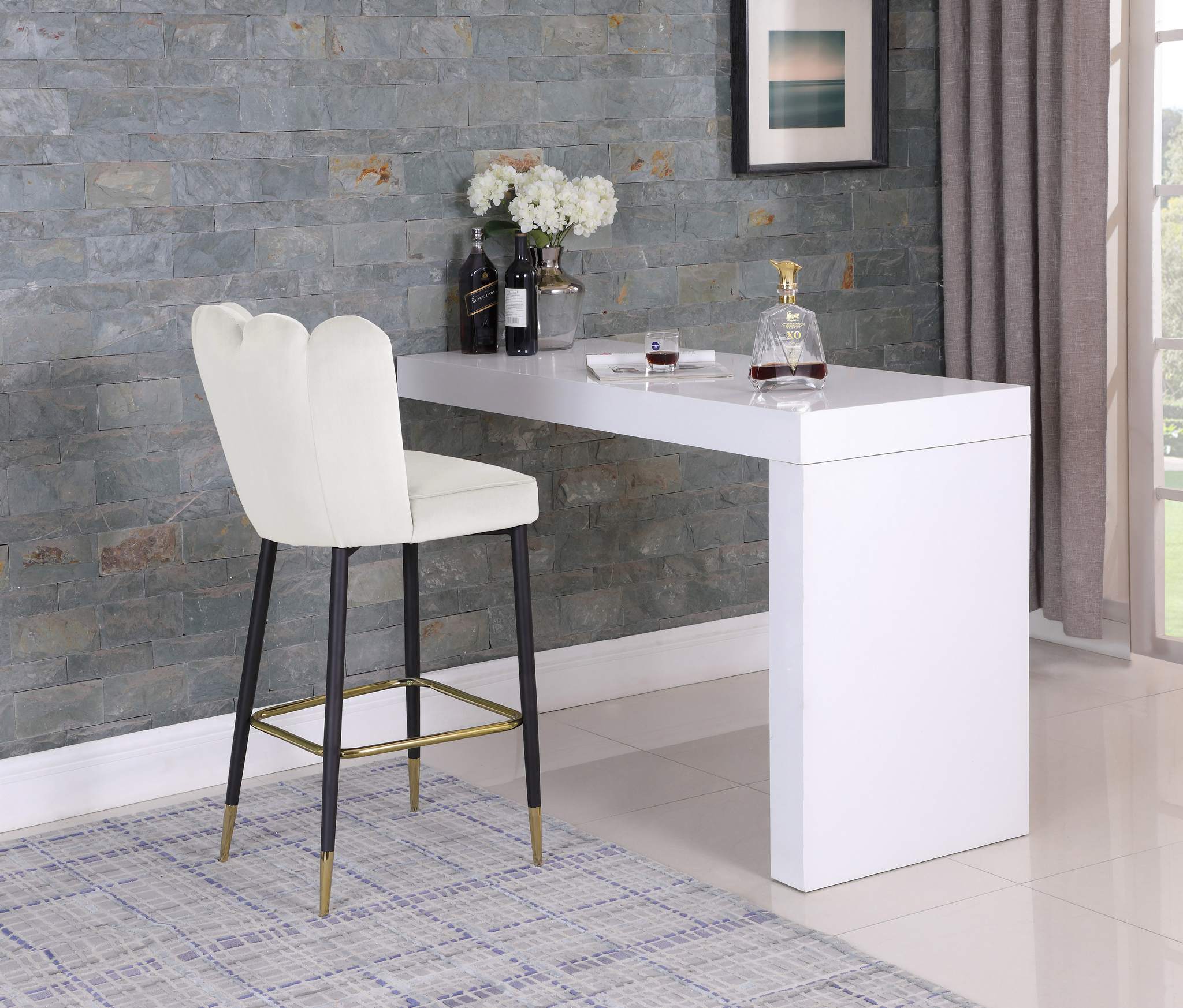 Fall fast and hard for the beautiful look of this Lily Bar Stool from Meridian Furniture. This lovely stool features a striking cream velvet fan-style back with deep tufting that helps the padding inside stay full and aloft for added comfort. The cushioned seat and back are upholstered to the hilt for maximum luxury and beauty. Black metal legs with a matte finish and gold tips add contemporary appeal to this handsome stool whether used at the bar or kitchen counter.