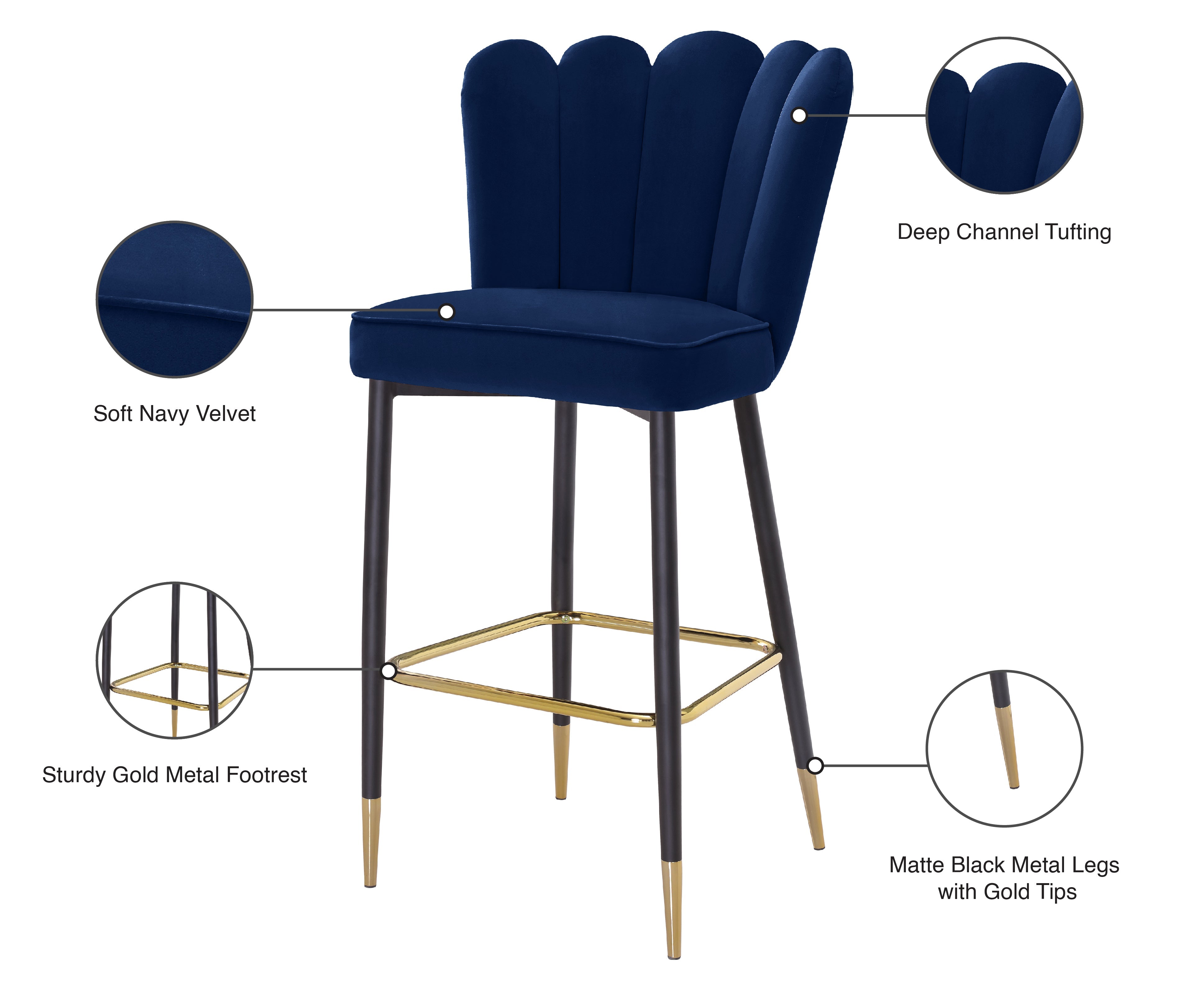 Fall fast and hard for the beautiful look of this Lily Bar Stool from Meridian Furniture. This lovely stool features a striking navy velvet fan-style back with deep tufting that helps the padding inside stay full and aloft for added comfort. The cushioned seat and back are upholstered to the hilt for maximum luxury and beauty. Black metal legs with a matte finish and gold tips add contemporary appeal to this handsome stool whether used at the bar or kitchen counter.