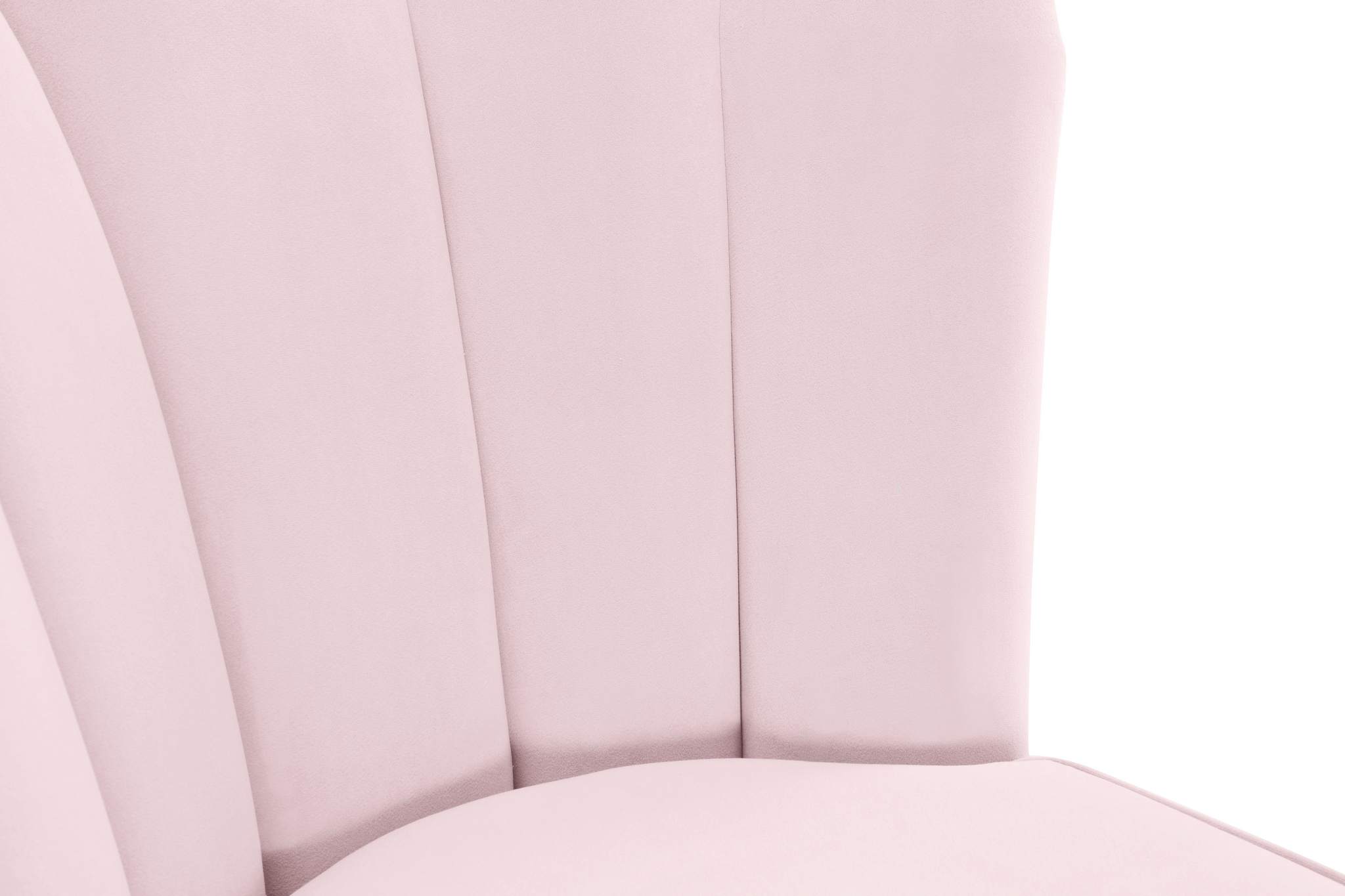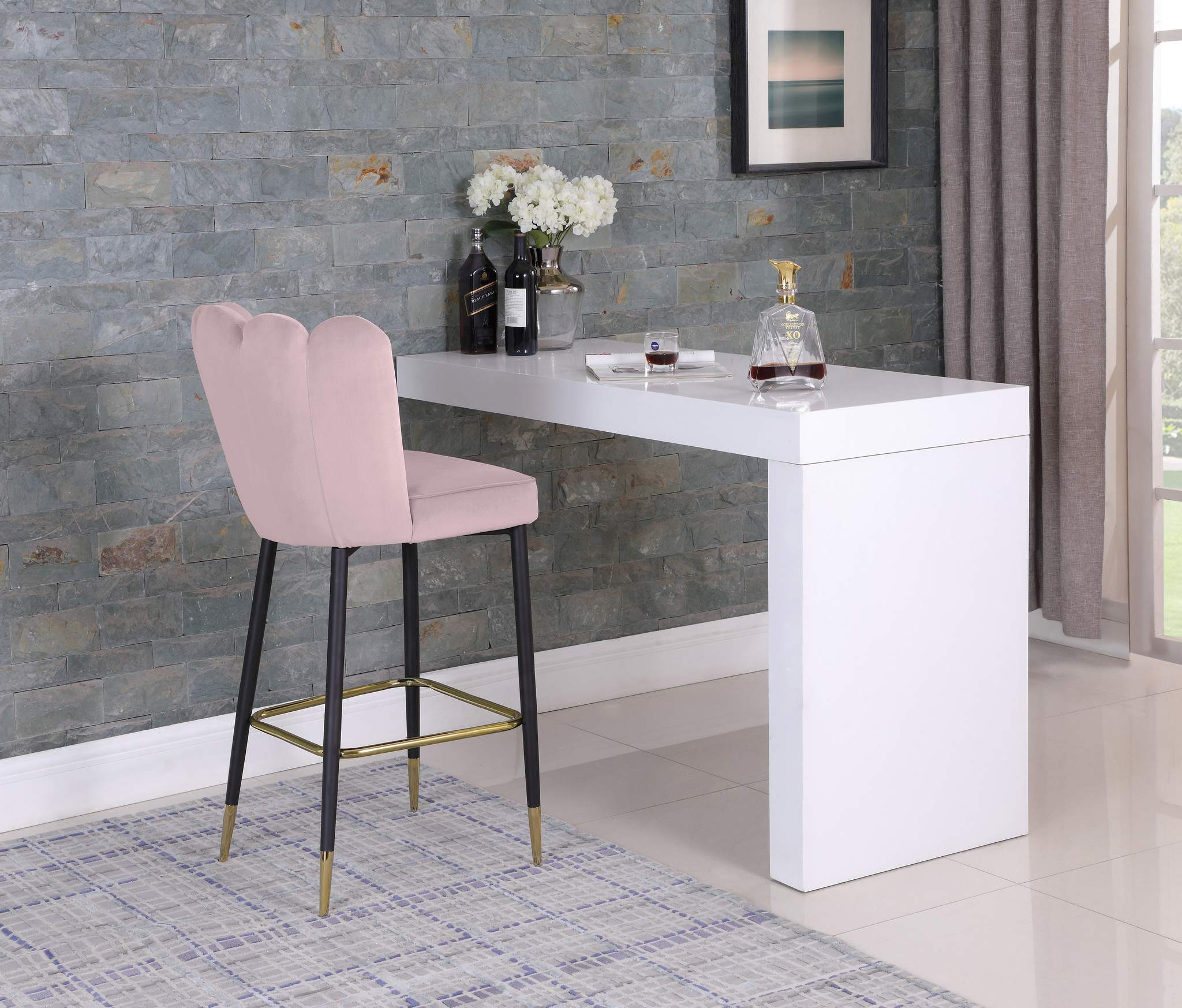 Fall fast and hard for the beautiful look of this Lily Bar Stool from Meridian Furniture. This lovely stool features a striking pink velvet fan-style back with deep tufting that helps the padding inside stay full and aloft for added comfort. The cushioned seat and back are upholstered to the hilt for maximum luxury and beauty. Black metal legs with a matte finish and gold tips add contemporary appeal to this handsome stool whether used at the bar or kitchen counter.