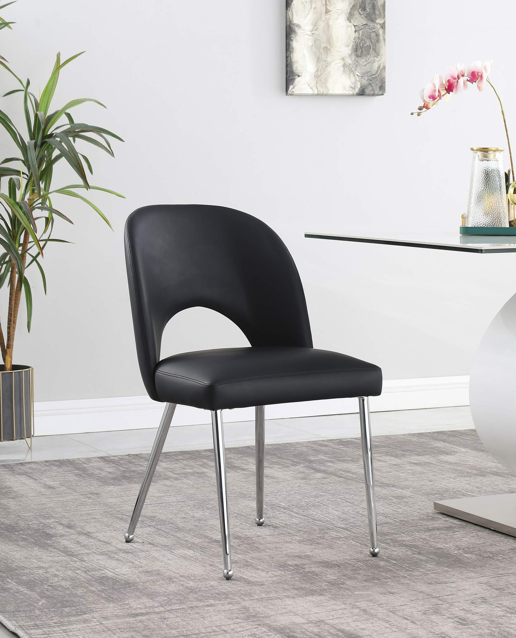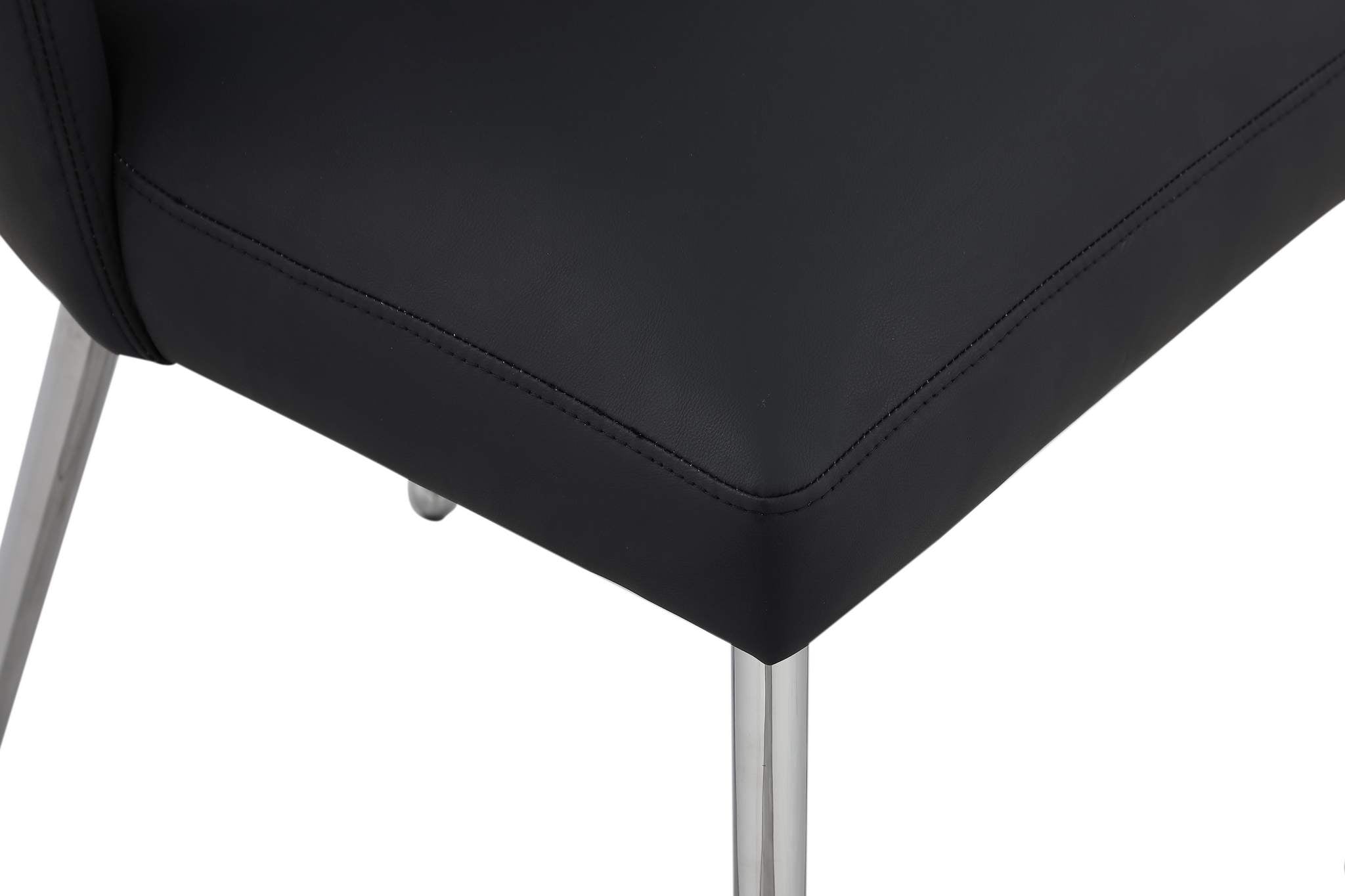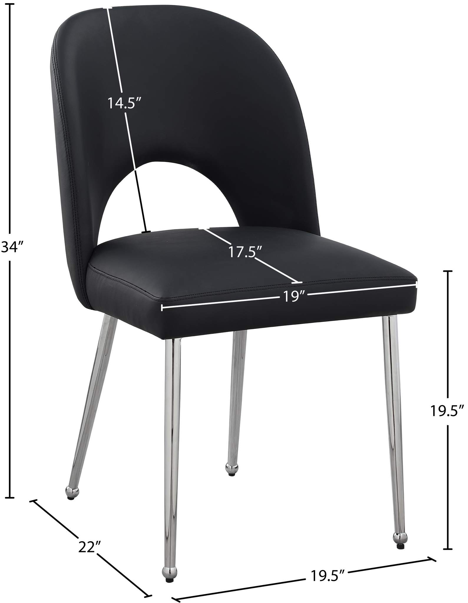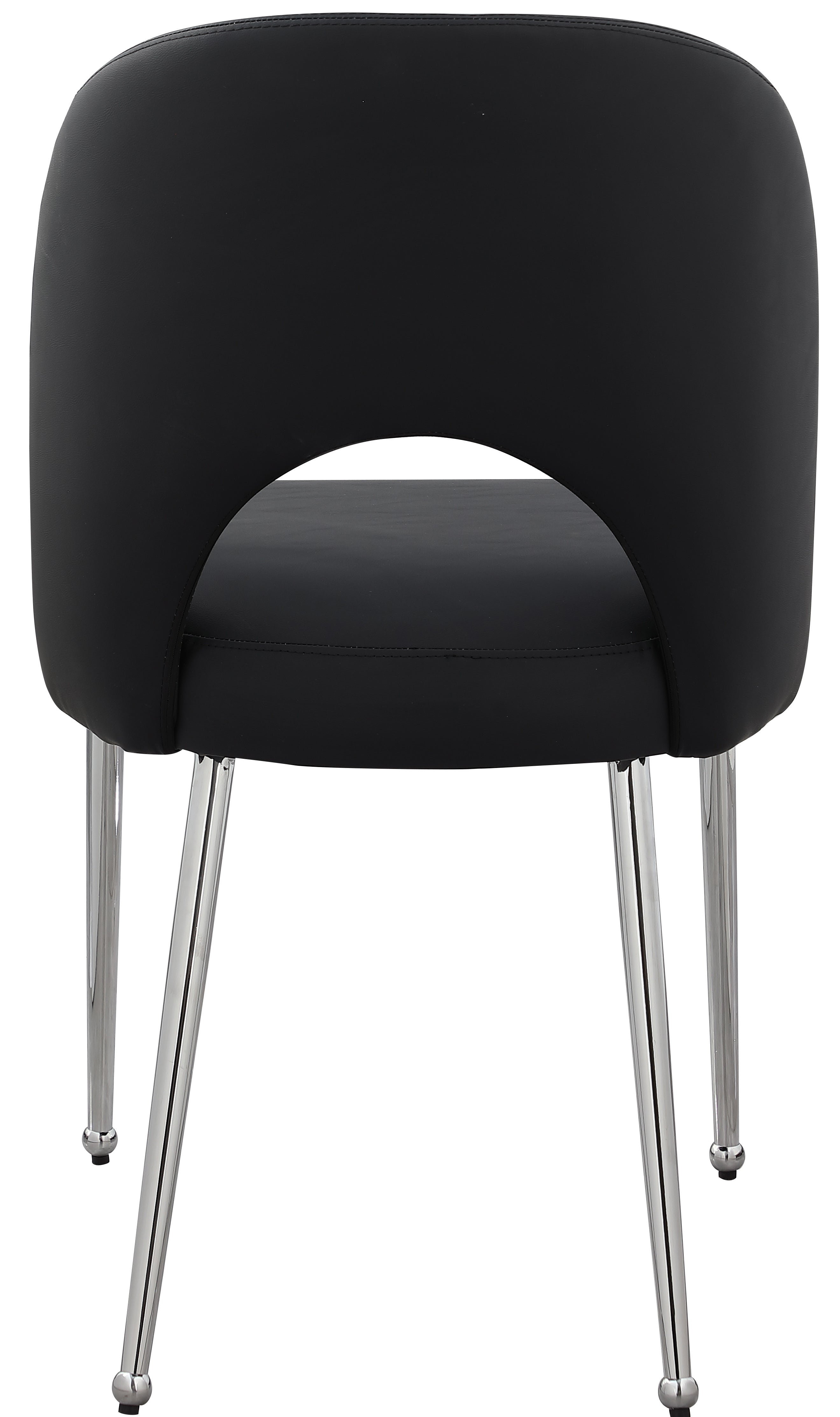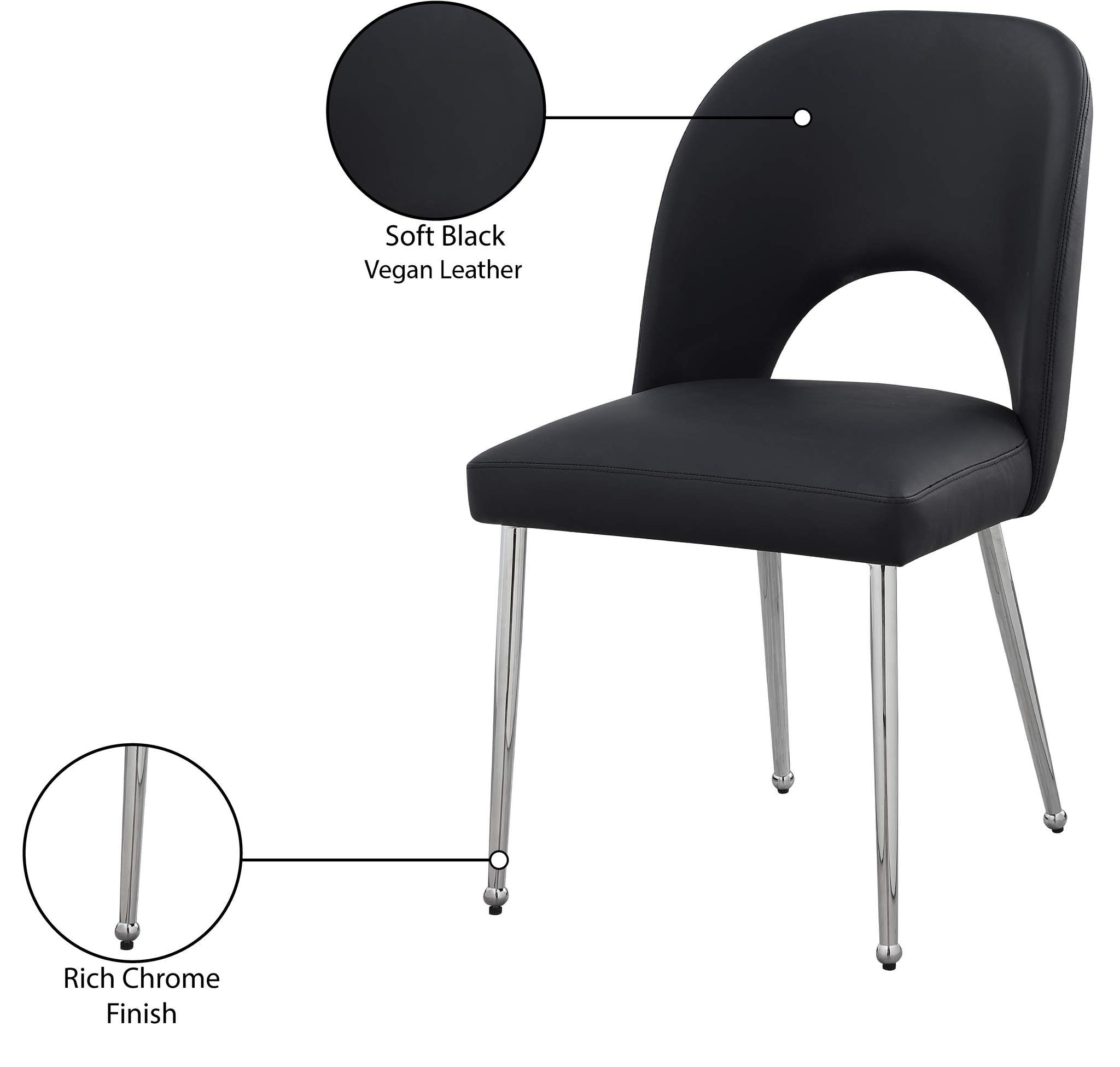 Give your dining area a modern makeover with this Logan black vegan leather dining chair. Featuring soft black vegan leather upholstery, this dining chair is both luxurious and comfortable. Its rich chrome finish complements its black seat and backrest, making it the perfect addition for any contemporary home. Its unique curved, open-back backrest provides ample physical support for your spine, and its plush seat cushion provides a cozy place to sit. This chair is just the right height to sit at any dining table or breakfast bar.