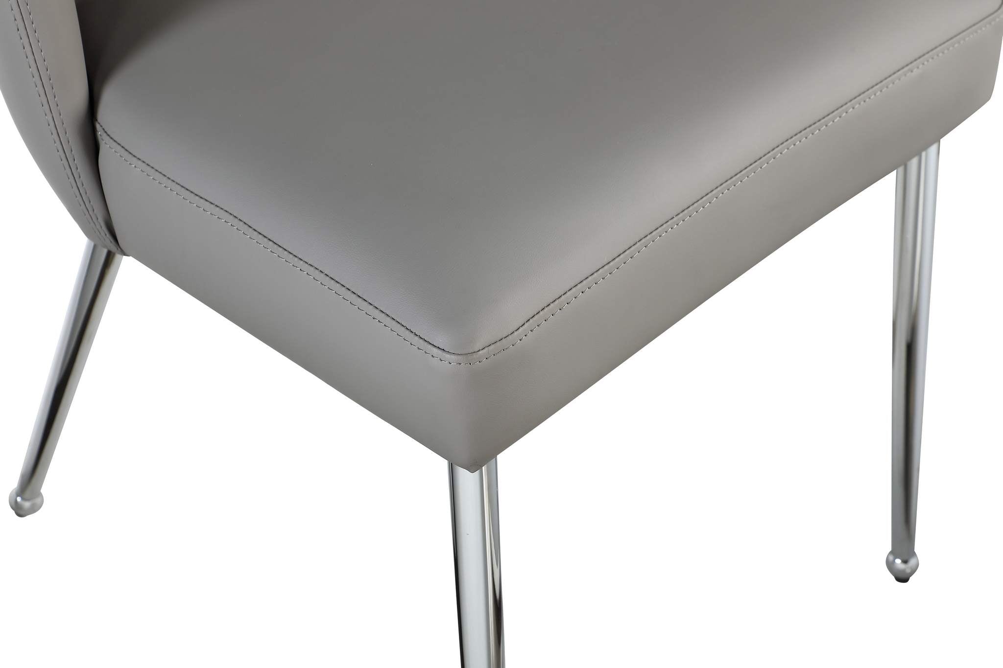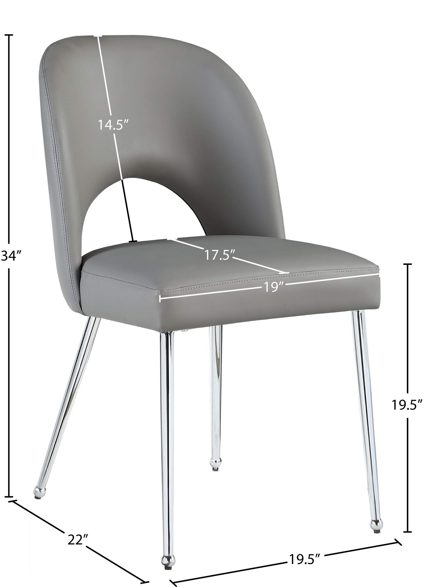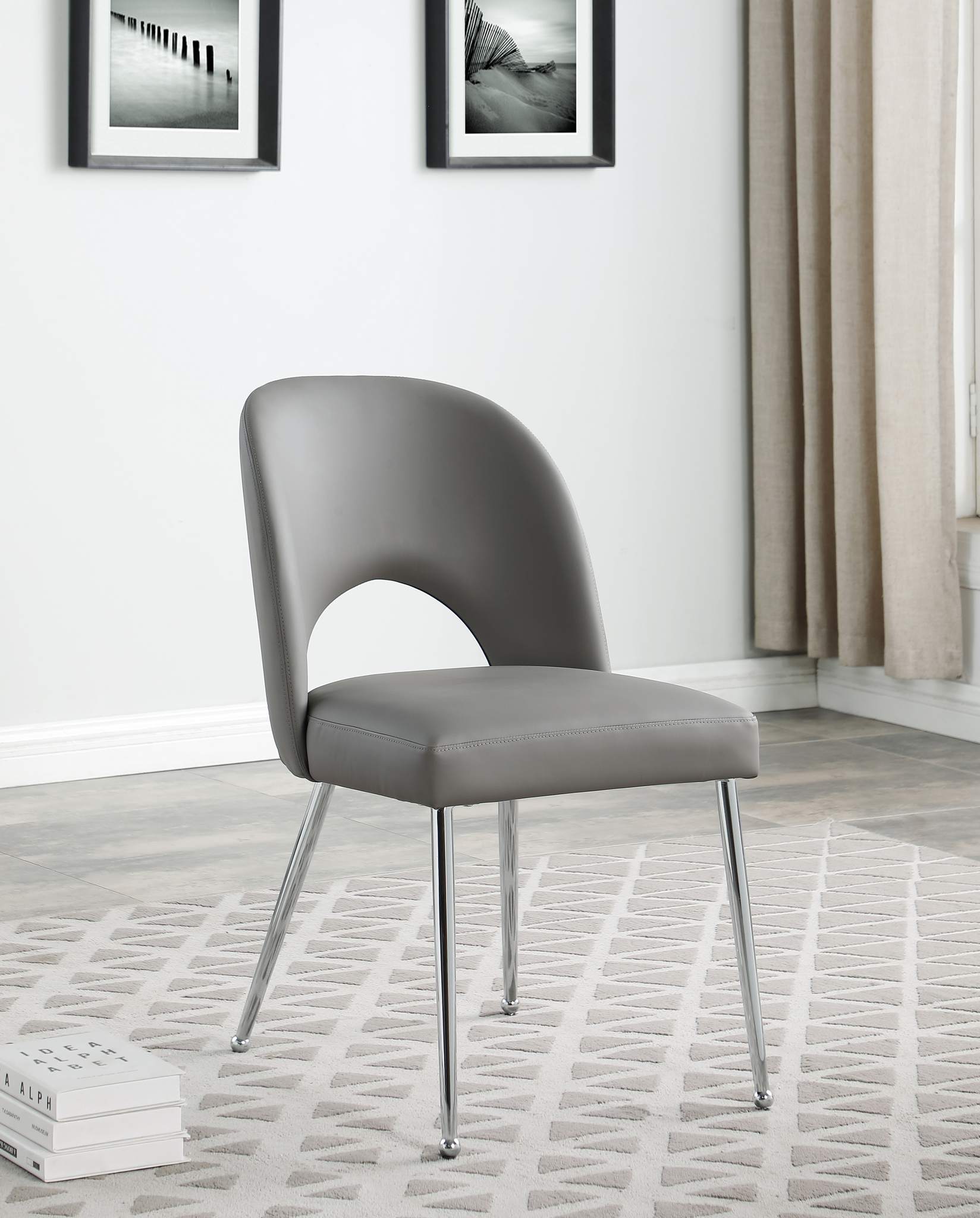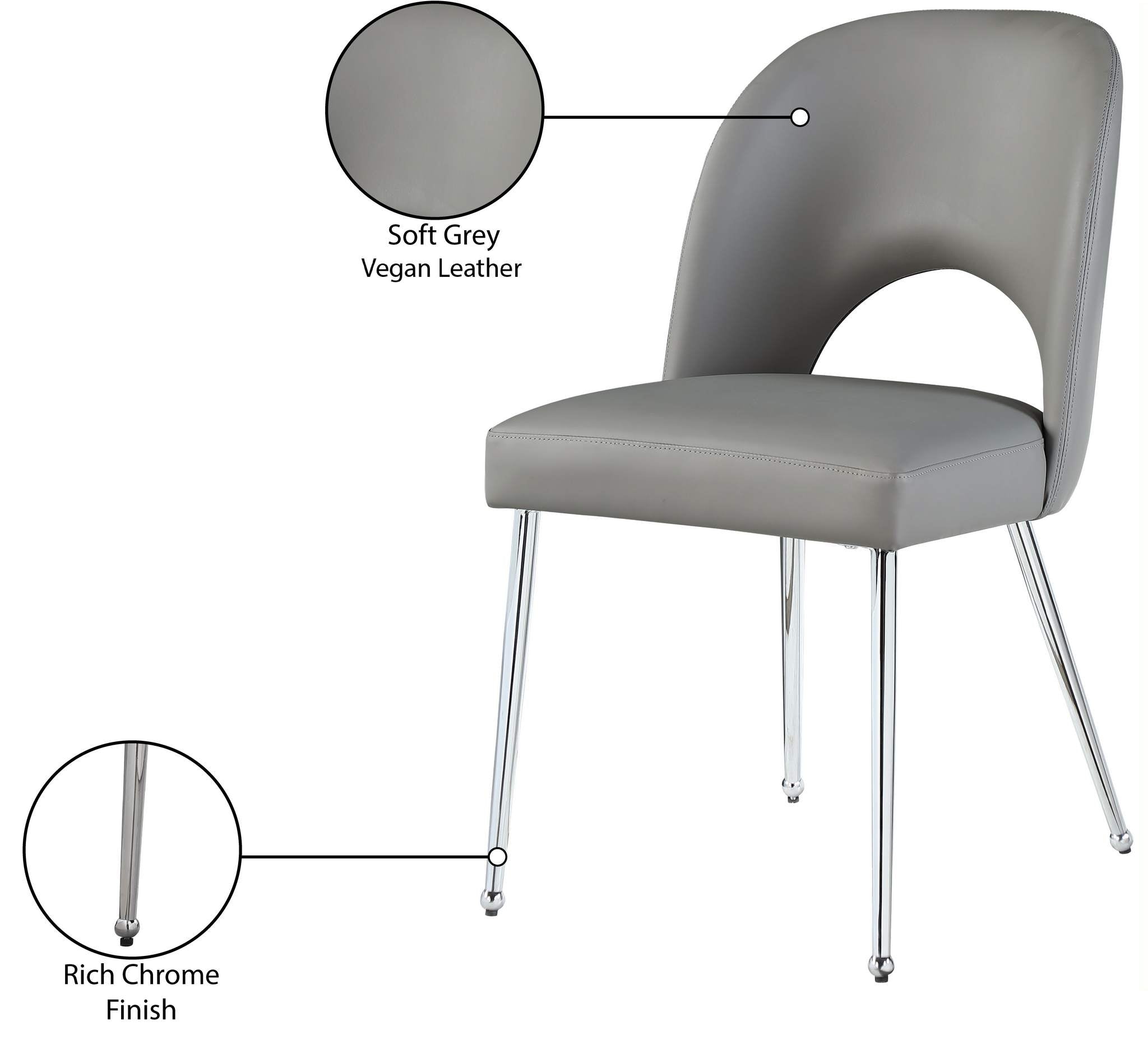 Give your dining area a modern makeover with this Logan grey vegan leather dining chair. Featuring soft grey vegan leather upholstery, this dining chair is both luxurious and comfortable. Its rich chrome finish complements its grey seat and backrest, making it the perfect addition for any contemporary home. Its unique curved, open-back backrest provides ample physical support for your spine, and its plush seat cushion provides a cozy place to sit. This chair is just the right height to sit at any dining table.