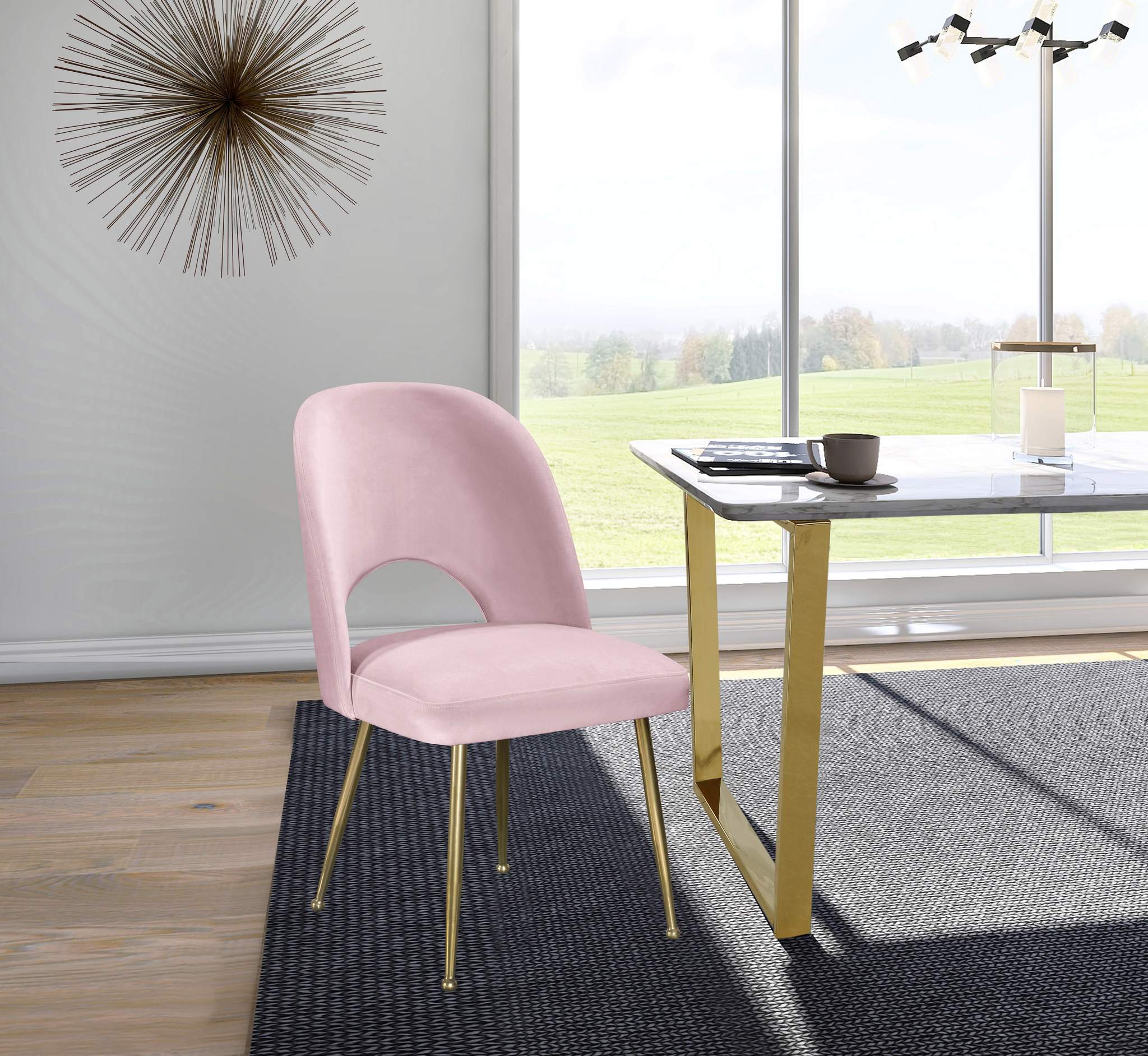 Sit for hours on the Logan pink velvet dining chair, no matter what may be the task at hand. Both the back and seat are both well-cushioned with foam, and the back has a semicircular cutout in the lumbar area for your comfort. The chair has a wooden frame, and is supported by four brushed gold legs, with decorative balls for feet. Contemporary in style, this chair goes well with any table or decor scheme.