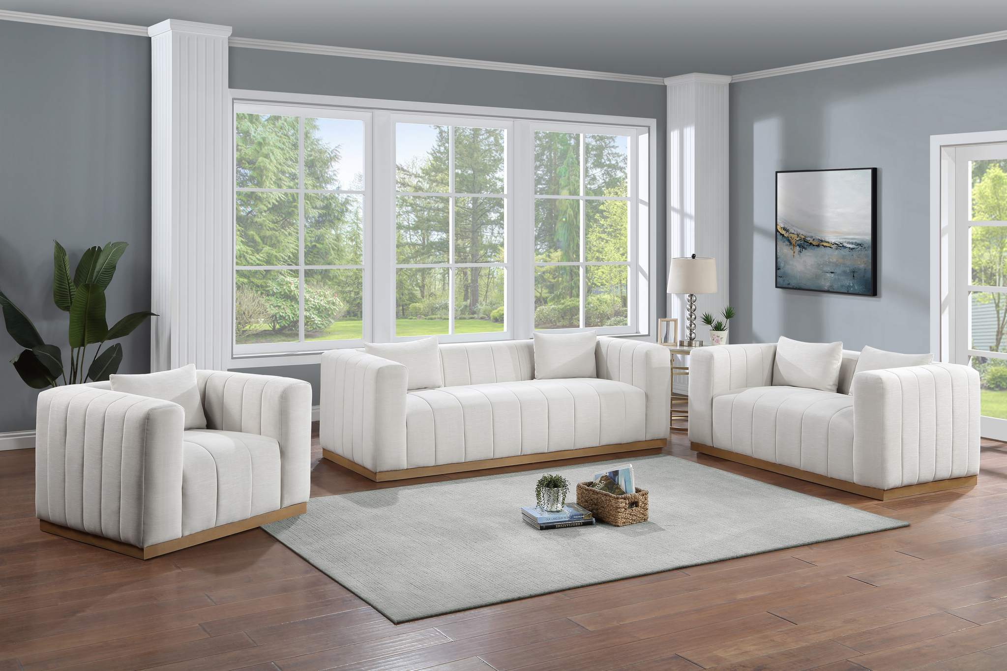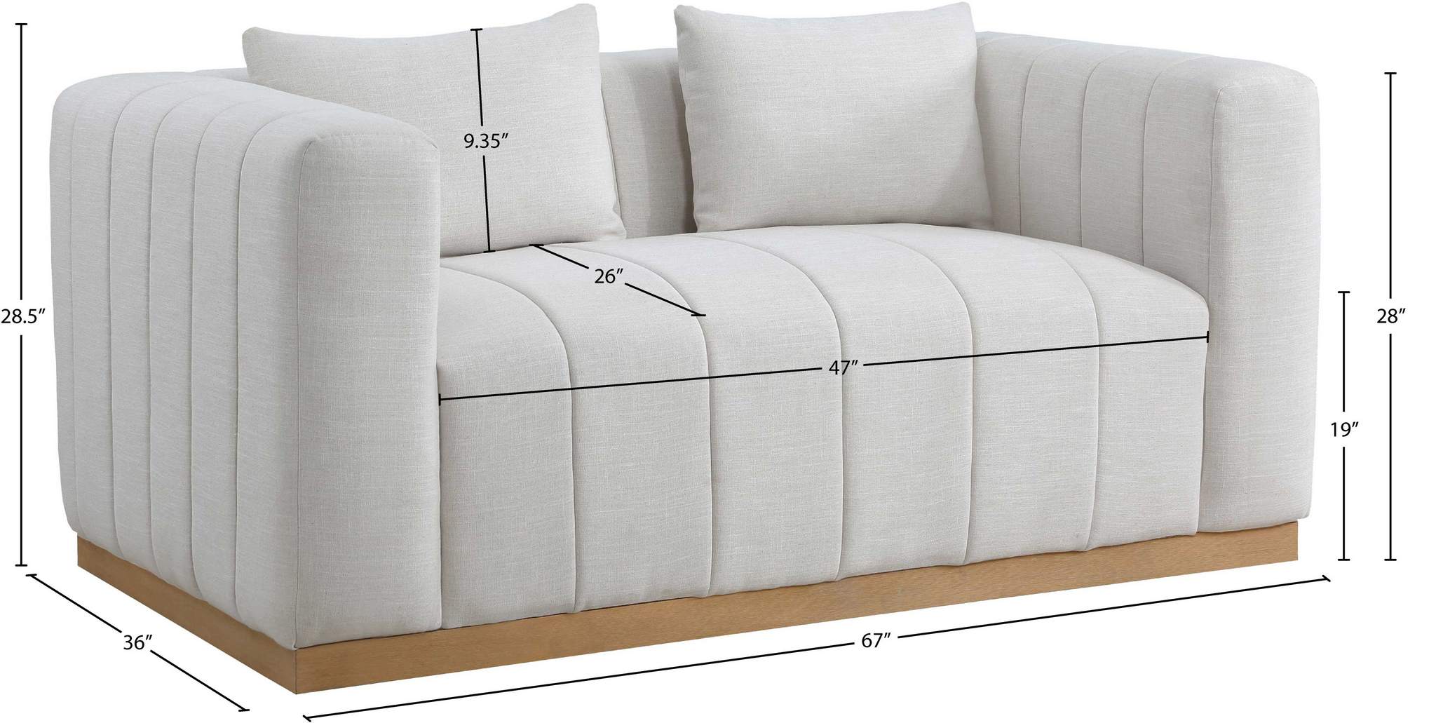 Succumb to the welcoming comfort of this Lucia textured linen fabric living room loveseat. This oversized loveseat offers you the room you need to cozy up with a book or a cup of hot tea. Its rich cream linen textured fabric feels soft and inviting against the skin, and the plump back cushion adds to its relaxing feel against your body. Deep channel tufting keeps the loveseat's fill intact, and it rests on a contrasting black solid wood base for resilient support.