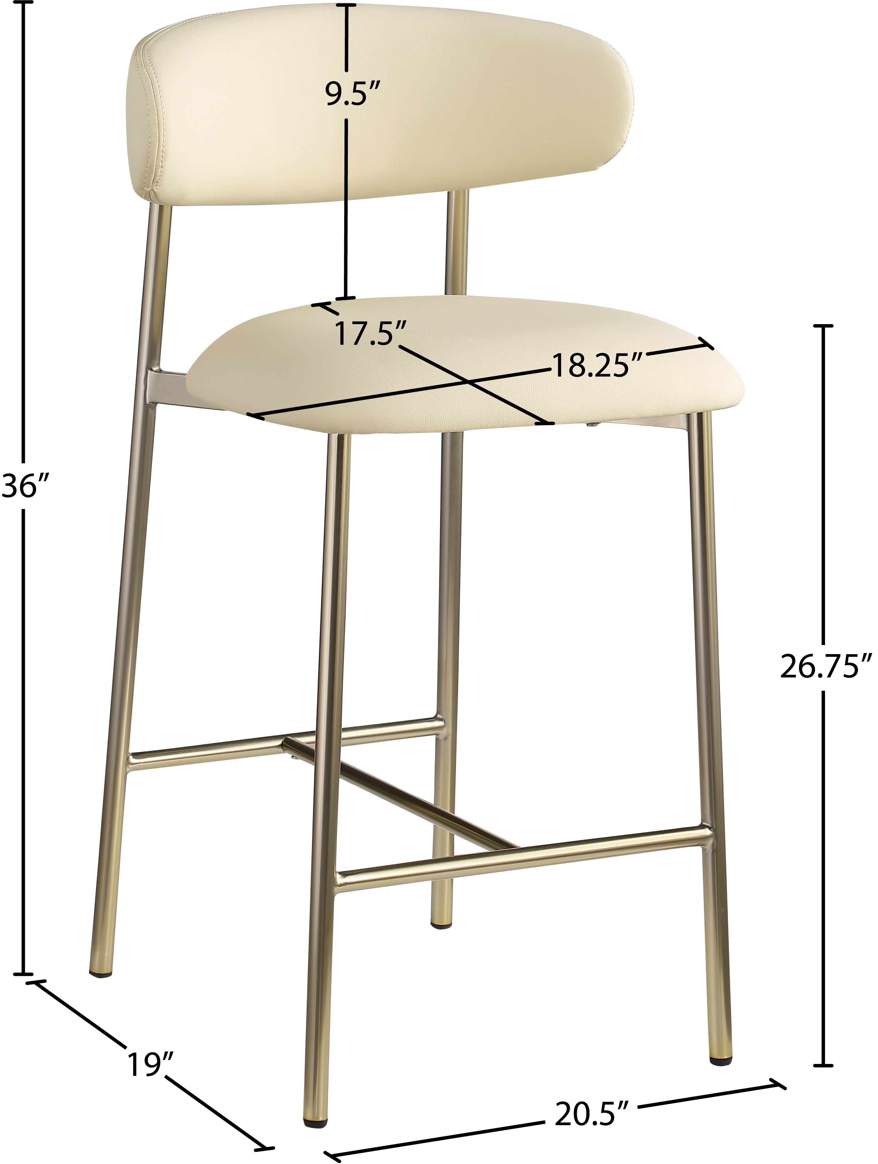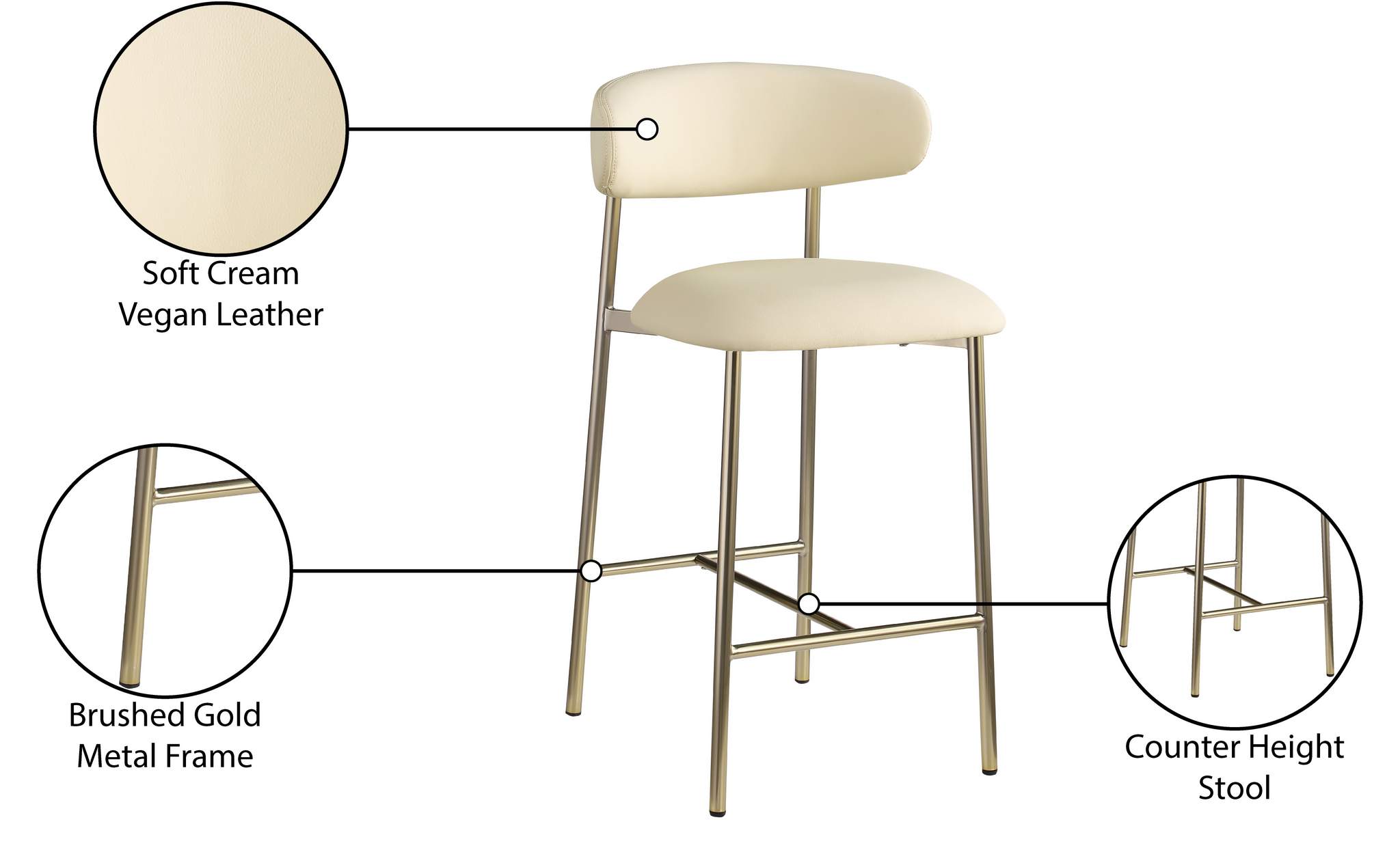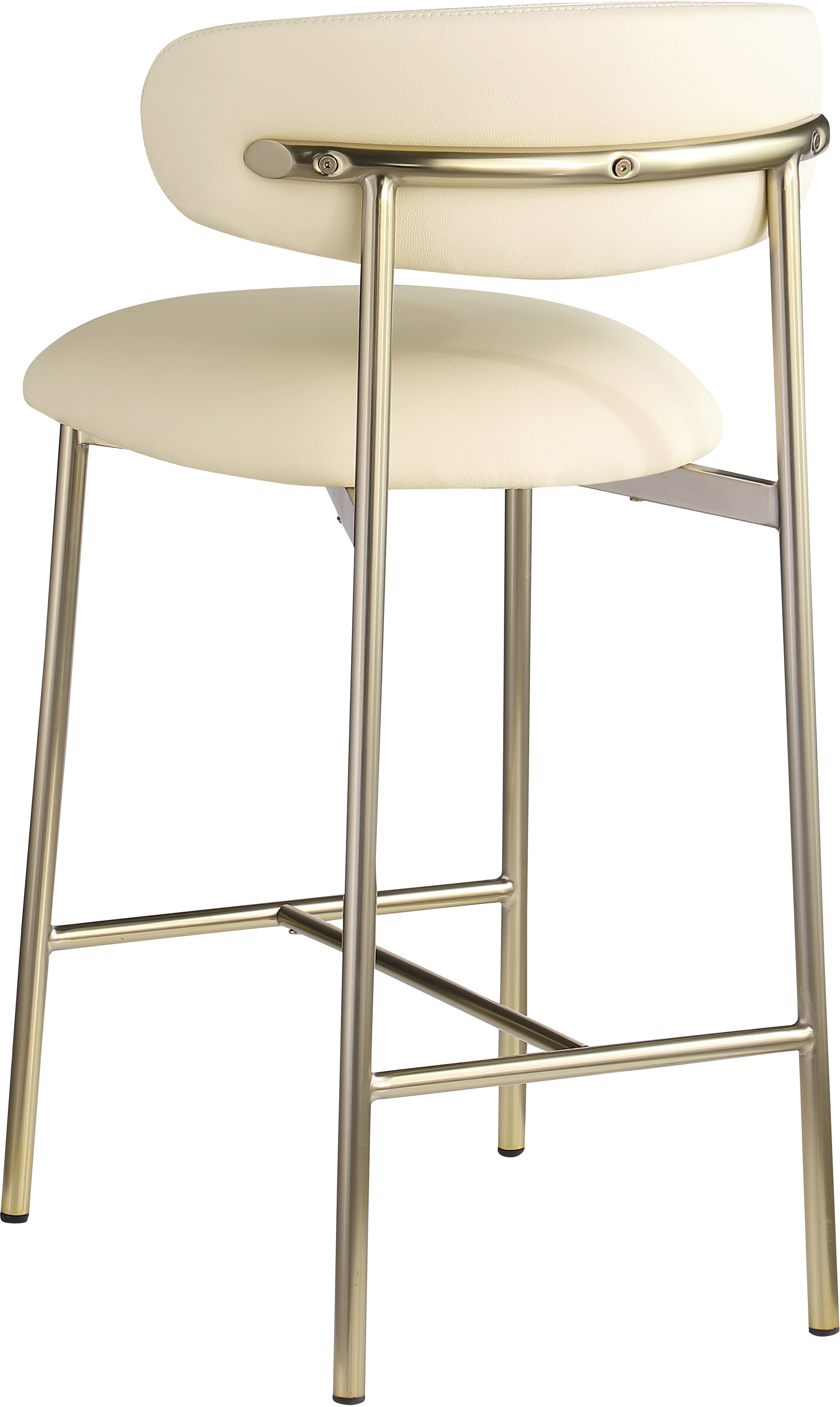 Grace, comfort, and elegance collide in the design of this Lupita cream vegan leather counter stool. Upholstered in soft cream vegan leather and supported by a brushed gold metal frame, it radiates luxury and modern sophistication. Perfect for kitchen islands or home bars, its counter height and contemporary design ensure both style and comfort. Elevate your space with this statement piece that harmonizes versatility and aesthetic appeal, promising to be a stunning addition to the space of your choice.