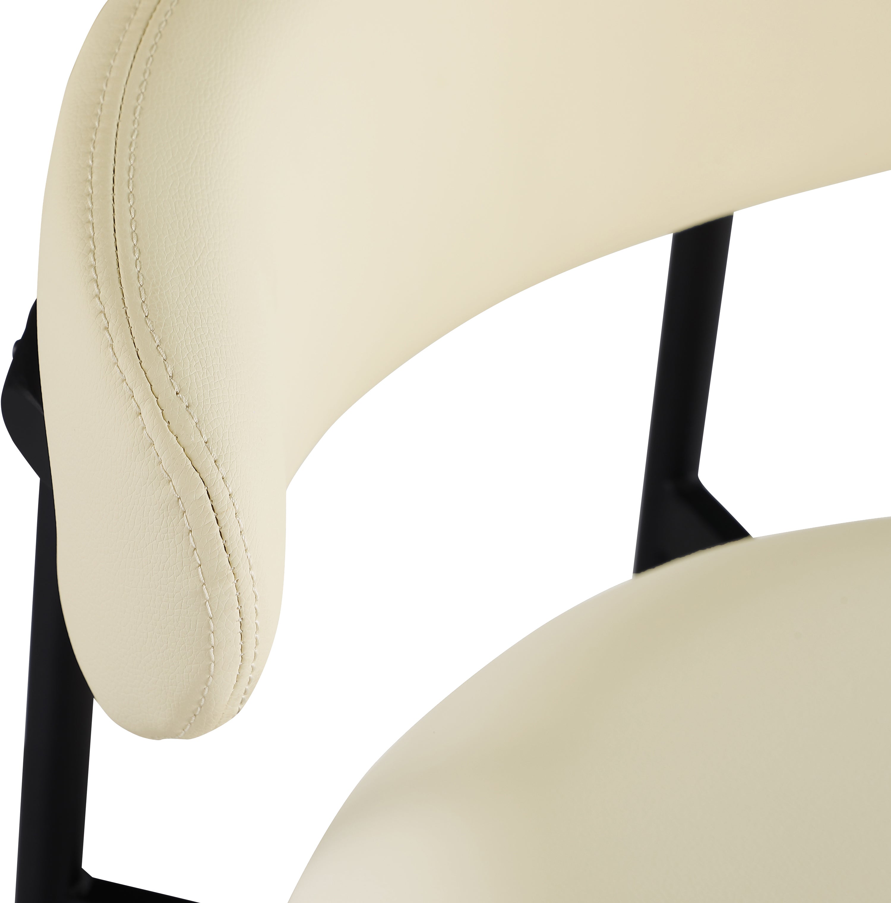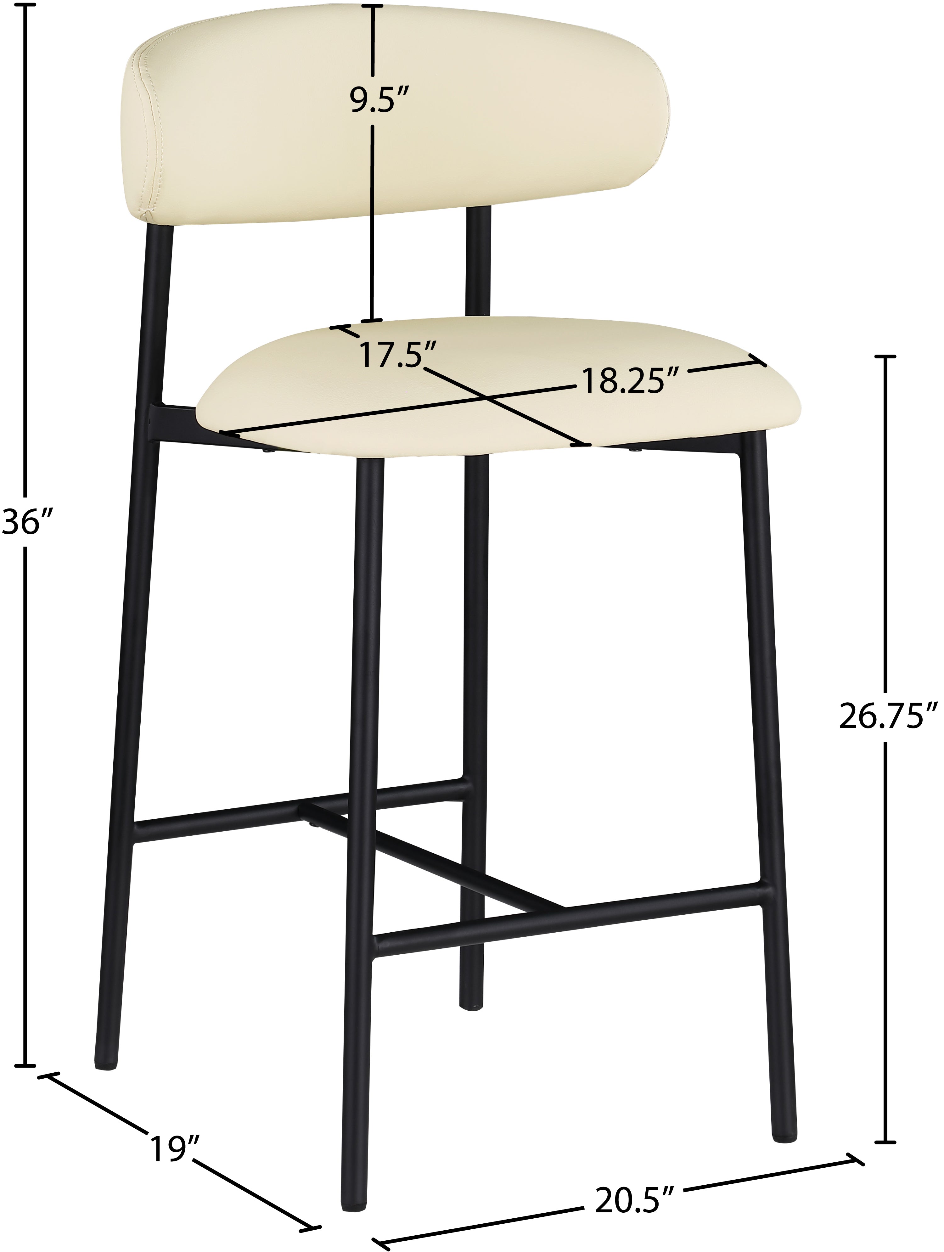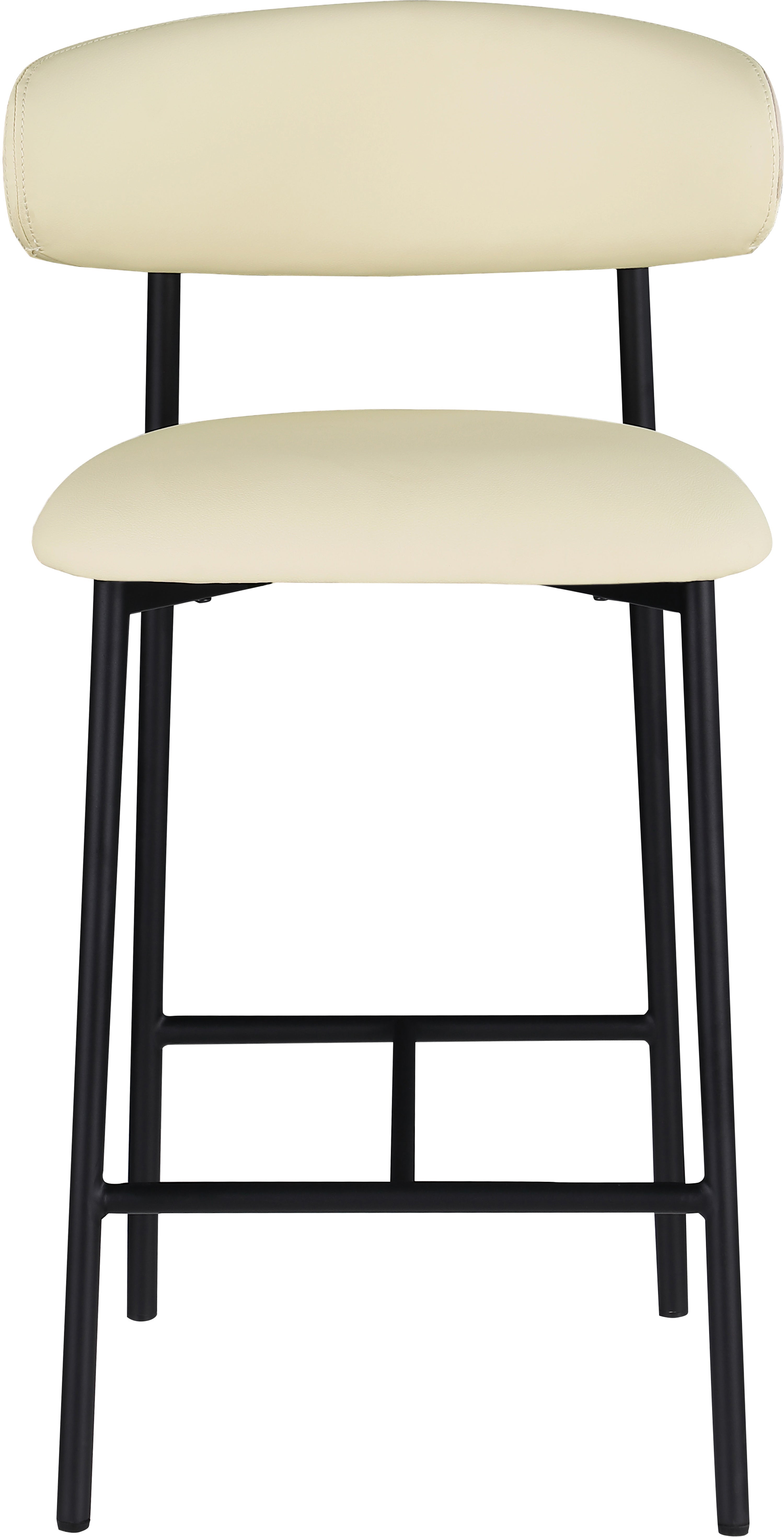 Grace, comfort, and elegance collide in the design of this Lupita cream vegan leather counter stool. Upholstered in soft cream vegan leather and supported by a matte black metal frame, it radiates luxury and modern sophistication. Perfect for kitchen islands or home bars, its counter height and contemporary design ensure both style and comfort. Elevate your space with this statement piece that harmonizes versatility and aesthetic appeal, promising to be a stunning addition to the space of your choice.