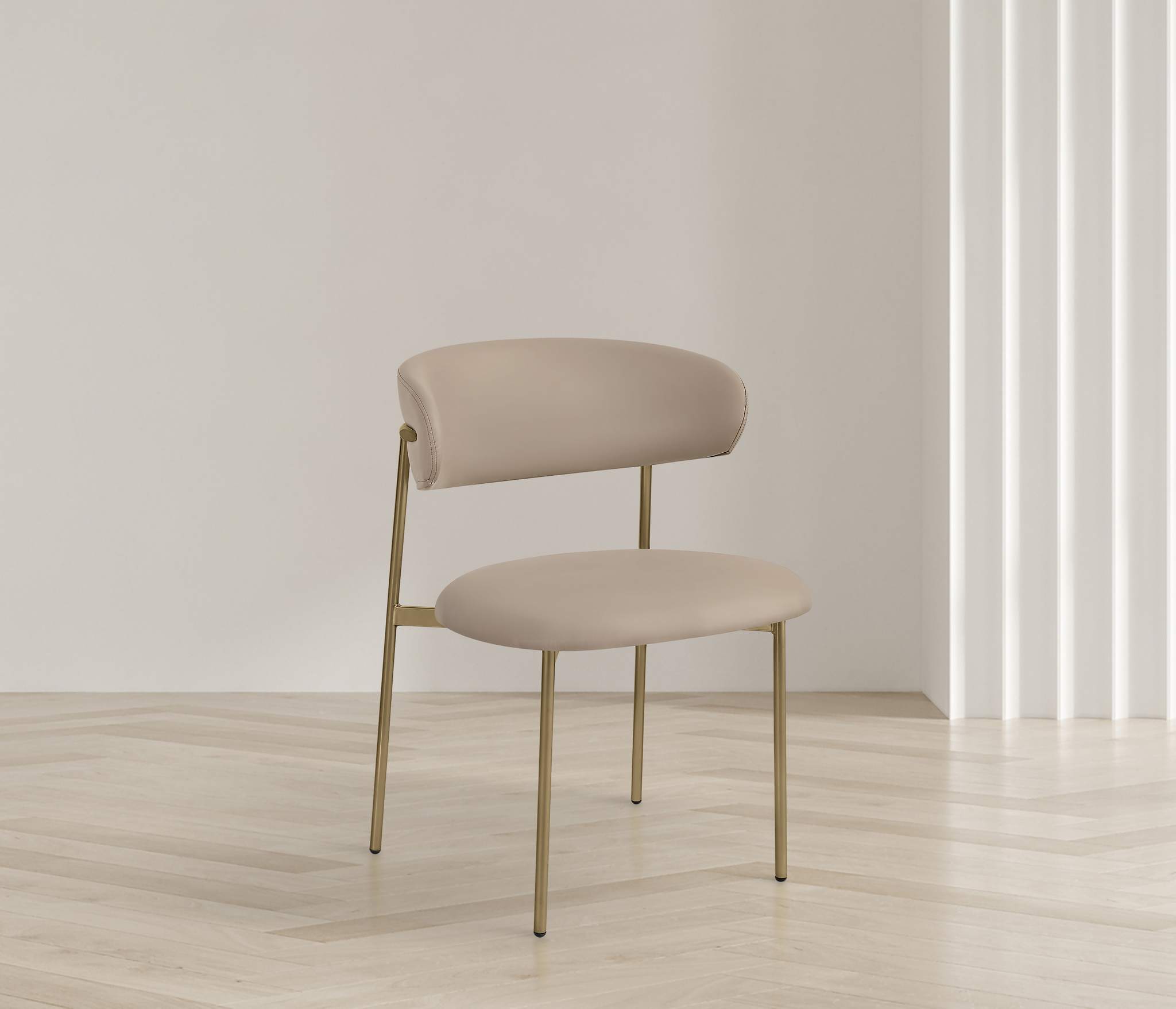 Take dining to a sophisticated new level with these Lupita vegan leather dining chairs. Boasting a brushed gold finish on the frame and legs for an elegant, refined feel, this pack of two vegan leather dining chairs features curved backs for total comfort all the way through the desert course. Padded cushions on the back and seat add to dining comfort. Pair these chairs with your favorite table for an upscale look in an instant.