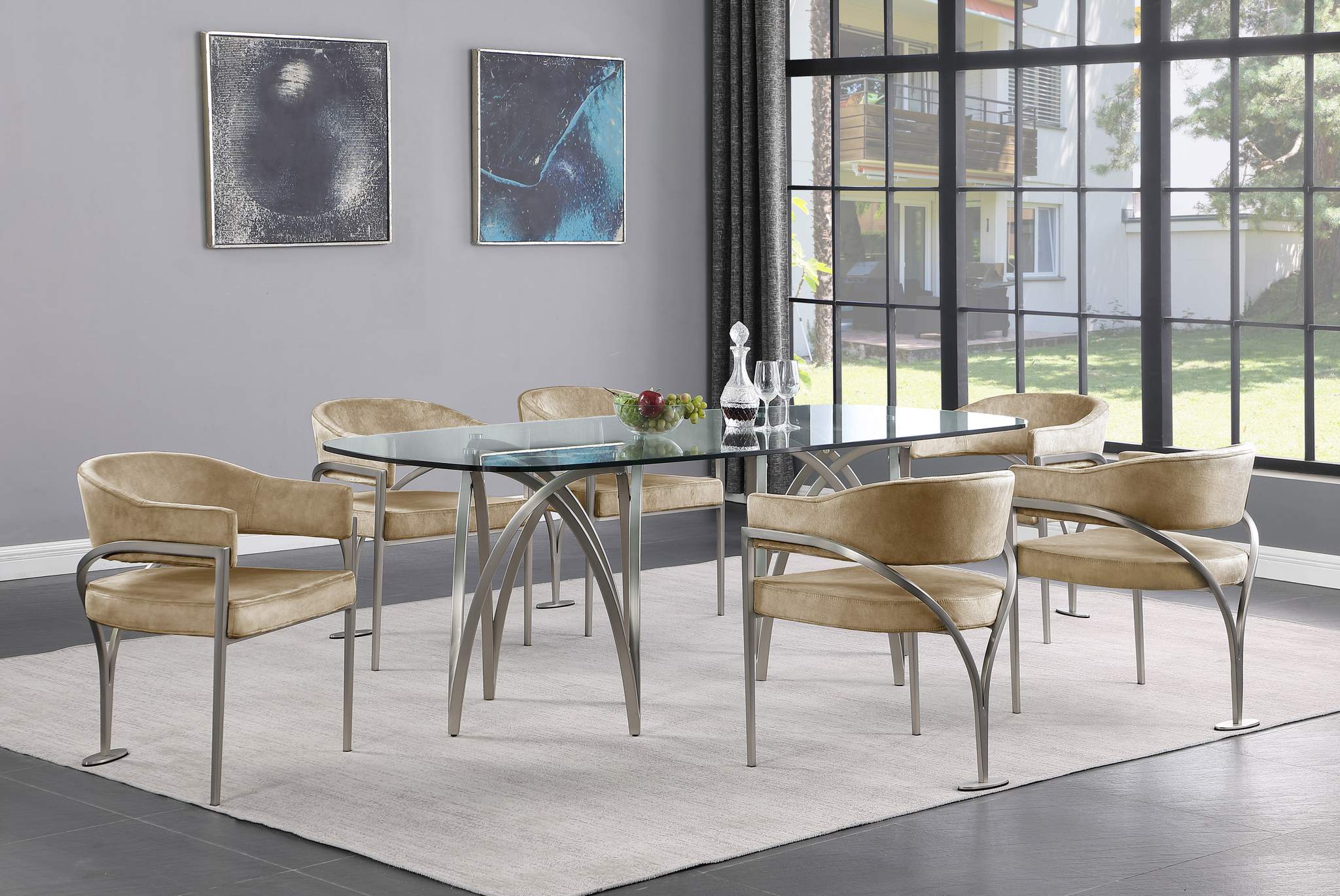 Give your dining area a show-stopping new look when you bring home one or more of these Madelyn velvet dining chairs. The Madelyn chair is all about comfort and style with its barrel-back design and its sophisticated lines. Upholstered in luxurious biege velvet that's inviting to the skin and super soft to the touch, this chair features an iron metal frame for durability and lasting use in your busy home. The brushed chrome finish adds a final modish touch to this lovely dining chair.