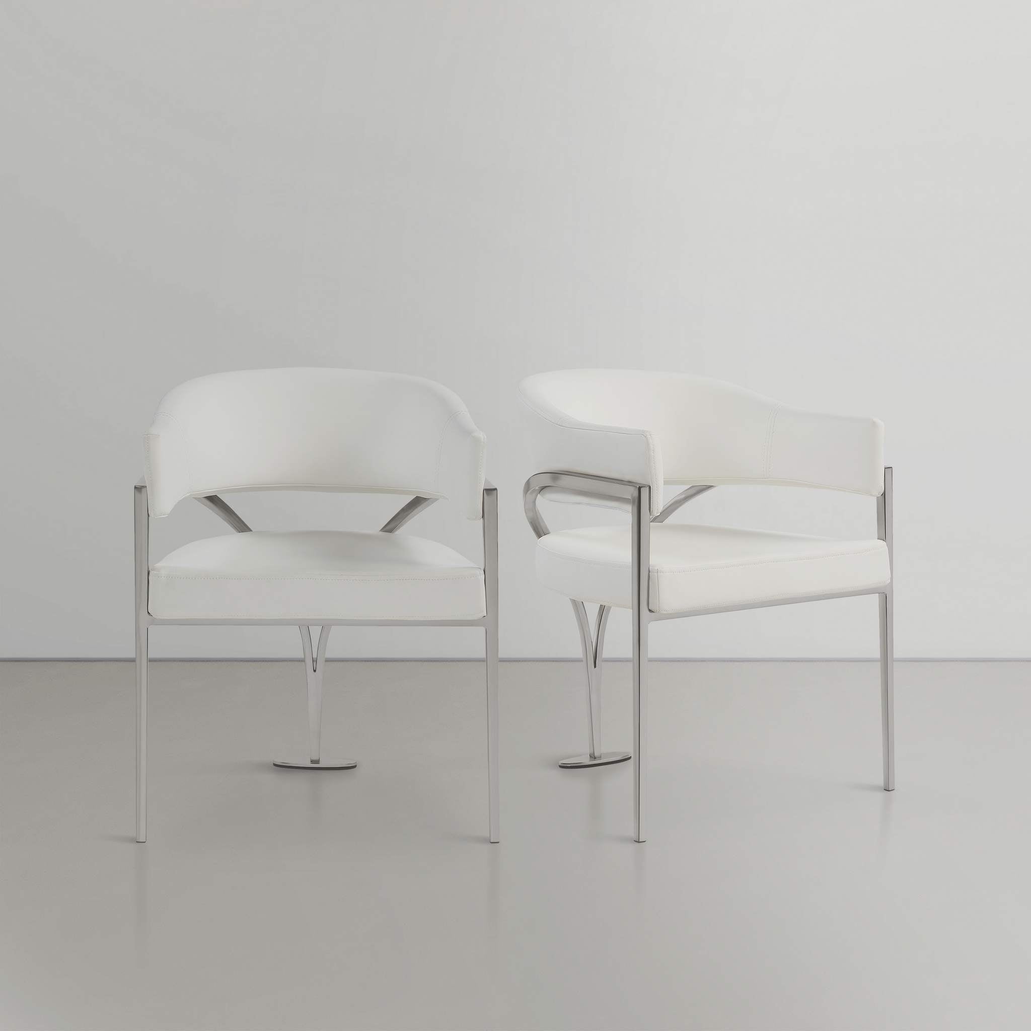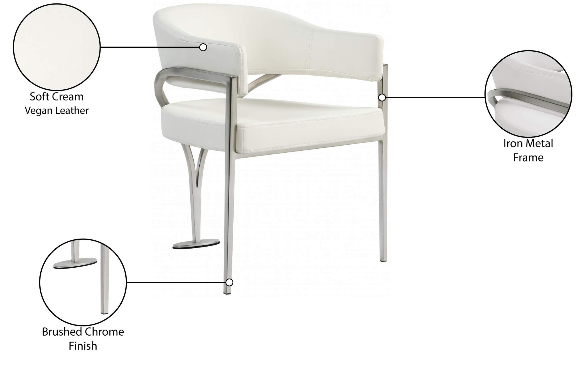 Give your dining area a show-stopping new look when you bring home one or more of these Madelyn velvet dining chairs. The Madelyn chair is all about comfort and style with its barrel-back design and its sophisticated lines. Upholstered in luxurious cream velvet that's inviting to the skin and super soft to the touch, this chair features an iron metal frame for durability and lasting use in your busy home. The brushed chrome finish adds a final modish touch to this lovely dining chair.