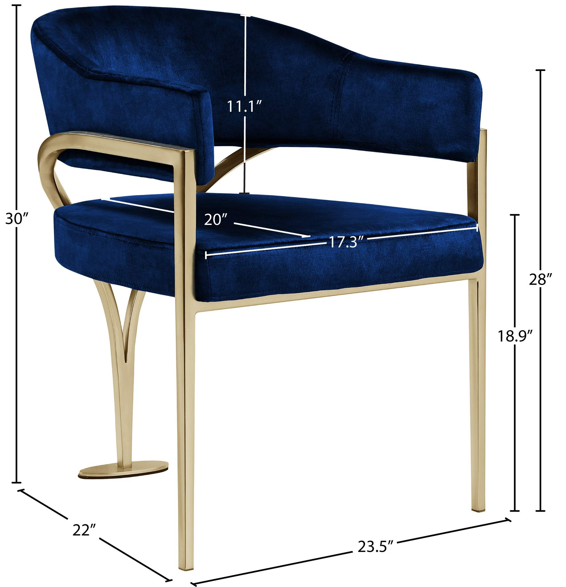 Give your dining area a show-stopping new look when you bring home one or more of these Madelyn velvet dining chairs. The Madelyn chair is all about comfort and style with its barrel-back design and its sophisticated lines. Upholstered in luxurious navy velvet that's inviting to the skin and super soft to the touch, this chair features an iron metal frame for durability and lasting use in your busy home. The brushed brass finish adds a final modish touch to this lovely dining chair.
