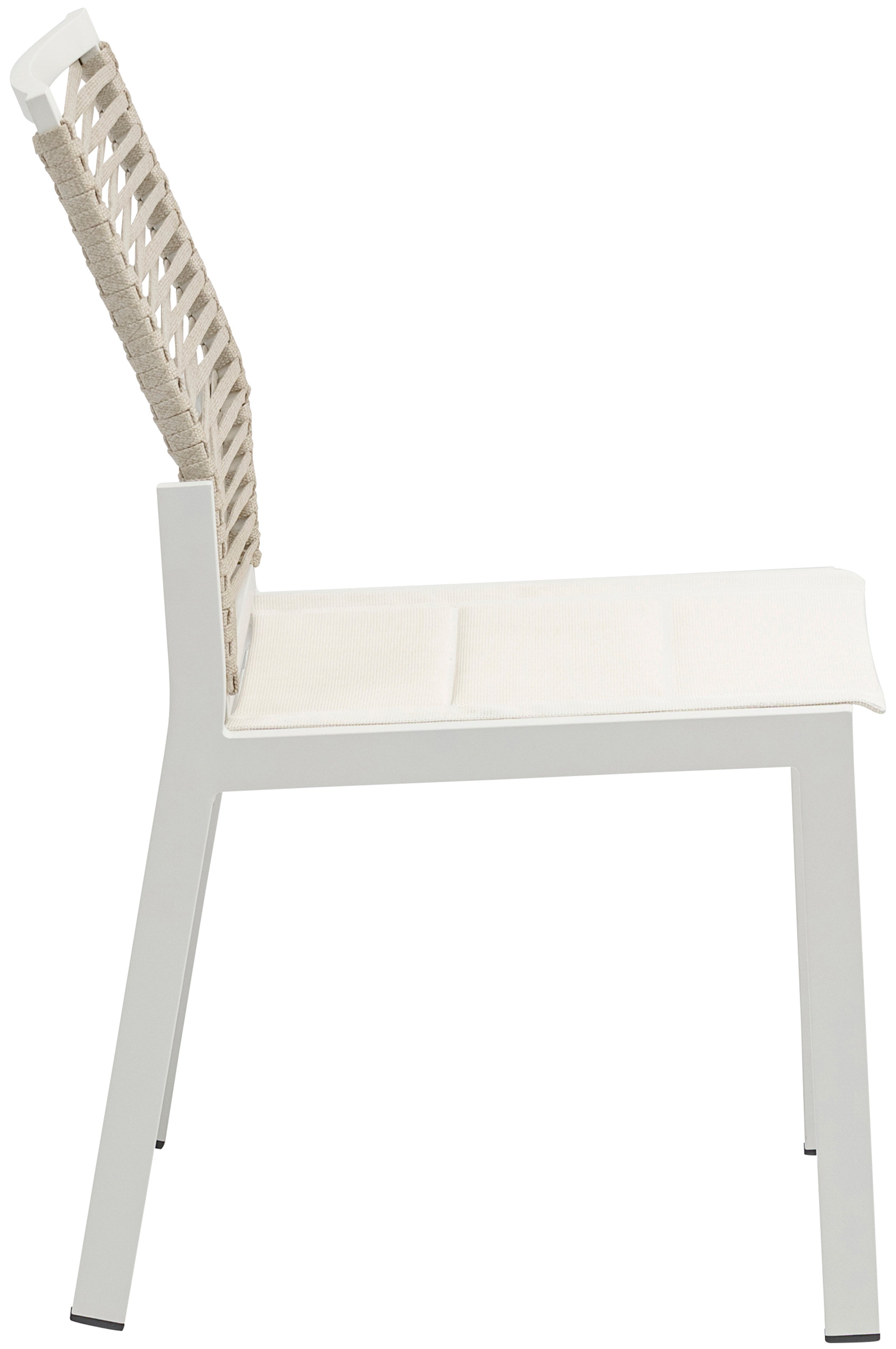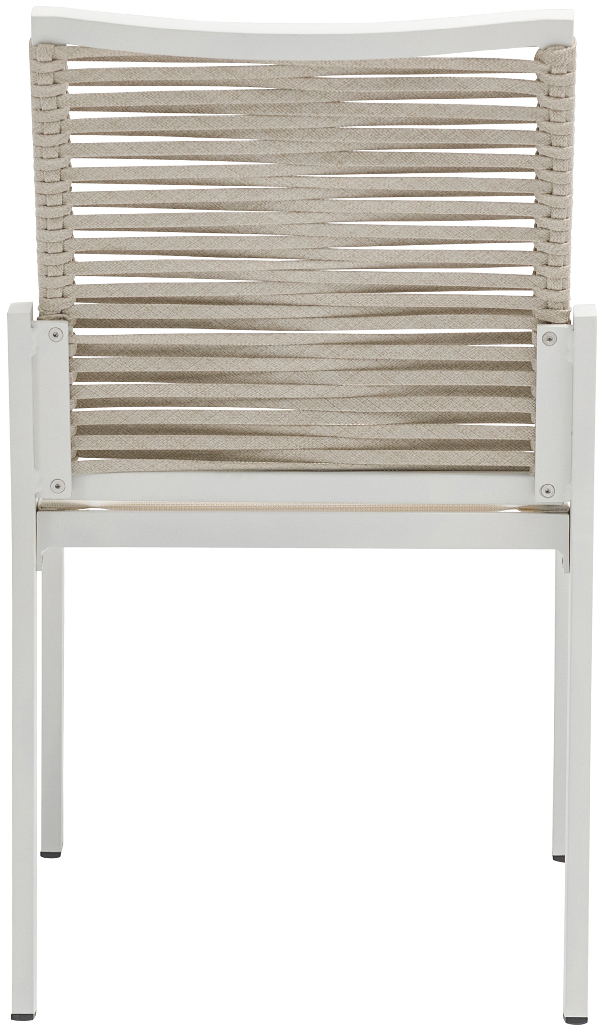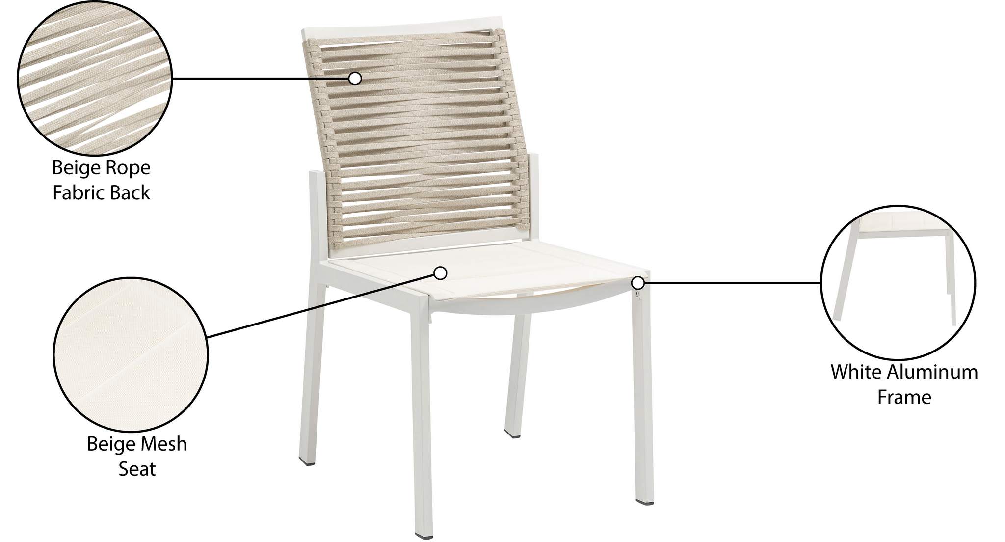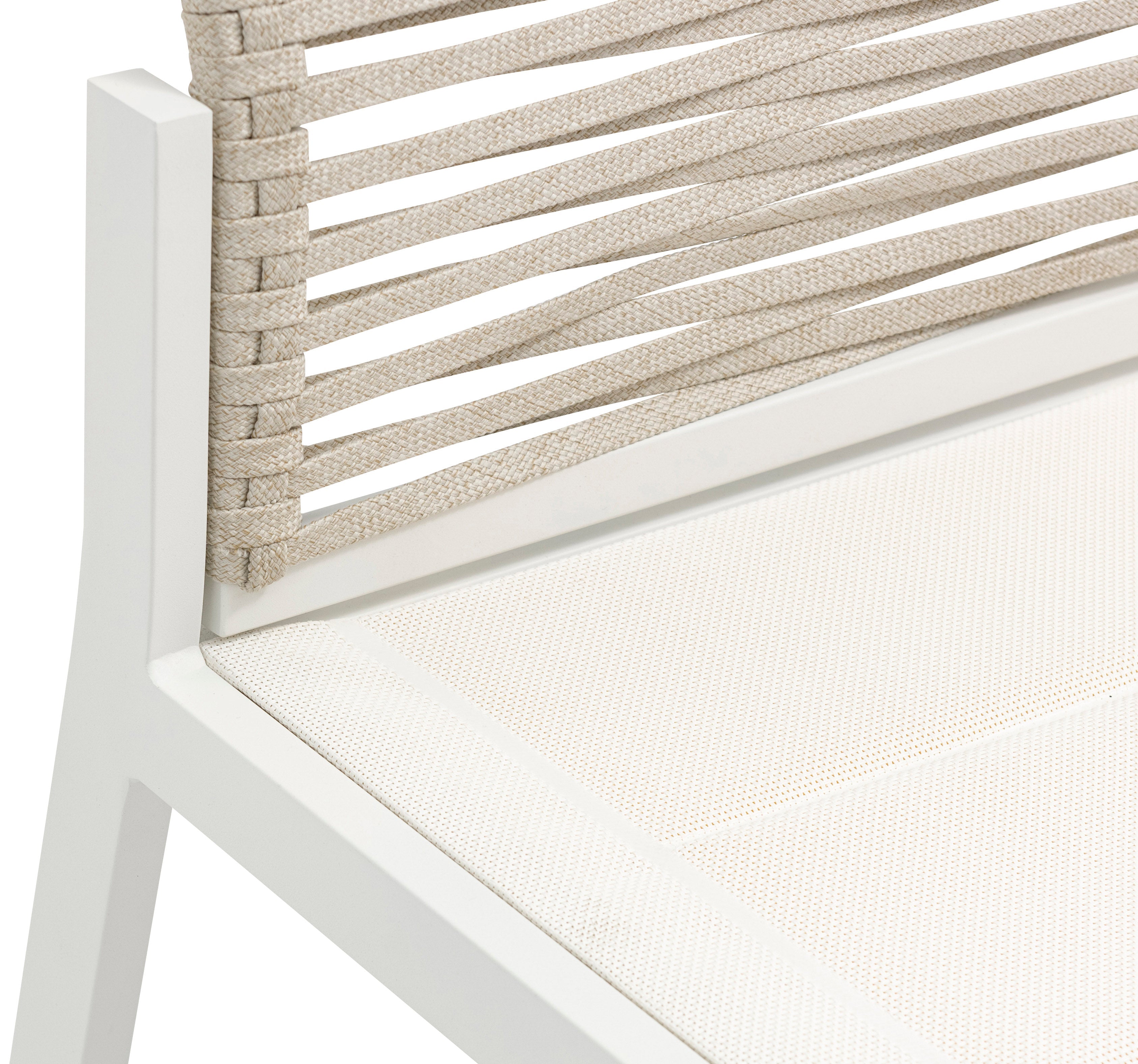 Bring the comfort of the indoors to your outdoor space with this Maldives outdoor patio dining side chair. This beautiful chair features a white aluminum frame with quality construction, so you can count on it weathering the outdoors without skipping a beat. A mesh seat supports you comfortably while you rest and relax under the sun, and the beige rope fabric back lends the chair a definitive resort appeal.