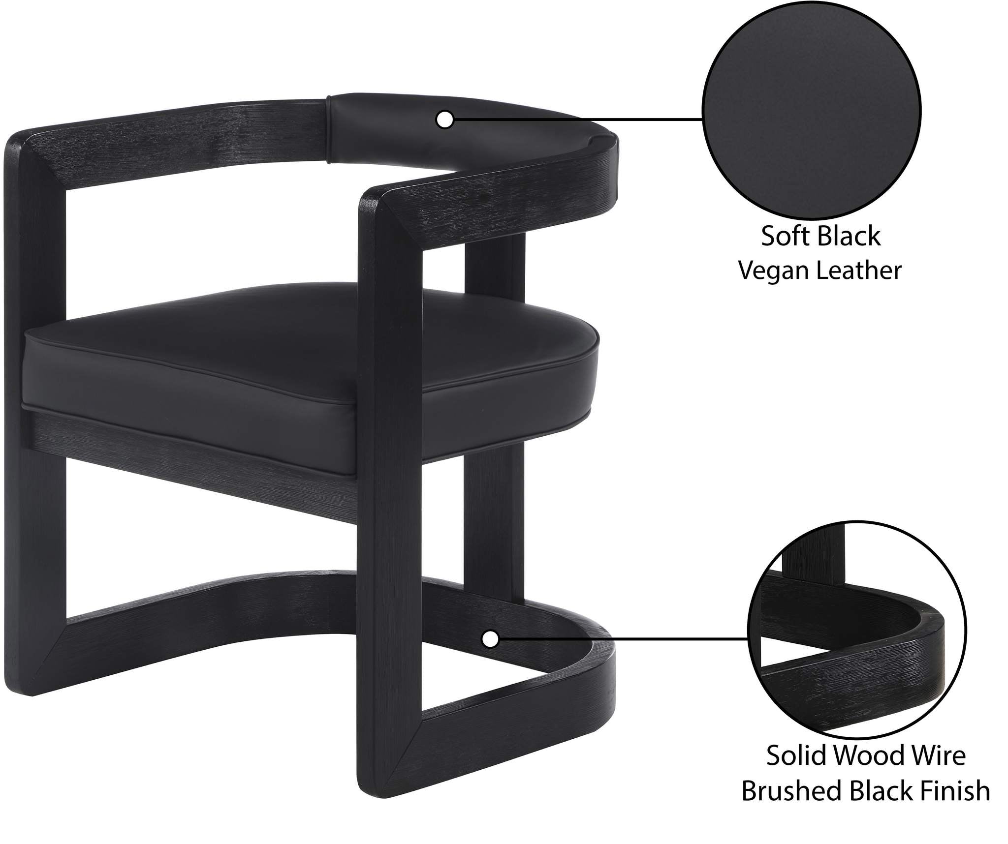 Show off your wild side with this unique Manchester vegan leather dining chair from Meridian Furniture. Featuring a frame crafted out of solid rubber wood with a wire brushed black finish, this chair makes a bold statement in any dining space. A soft black vegan leather cushion and backrest add comfort while you sit and dine, as well as give the chair a 'wild side' flavor. Its contemporary design works well in any living space.