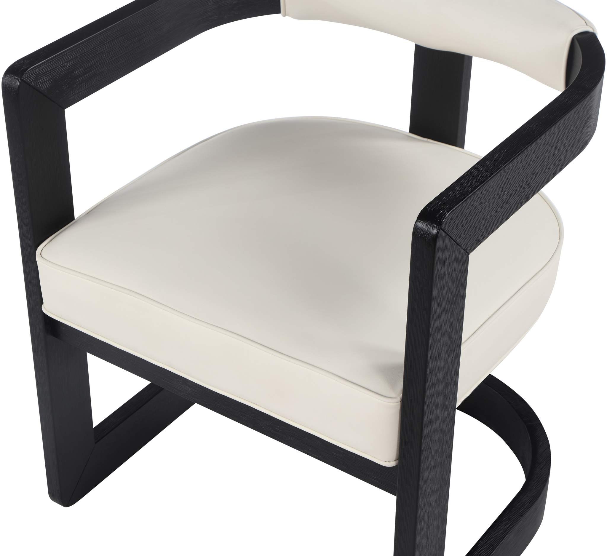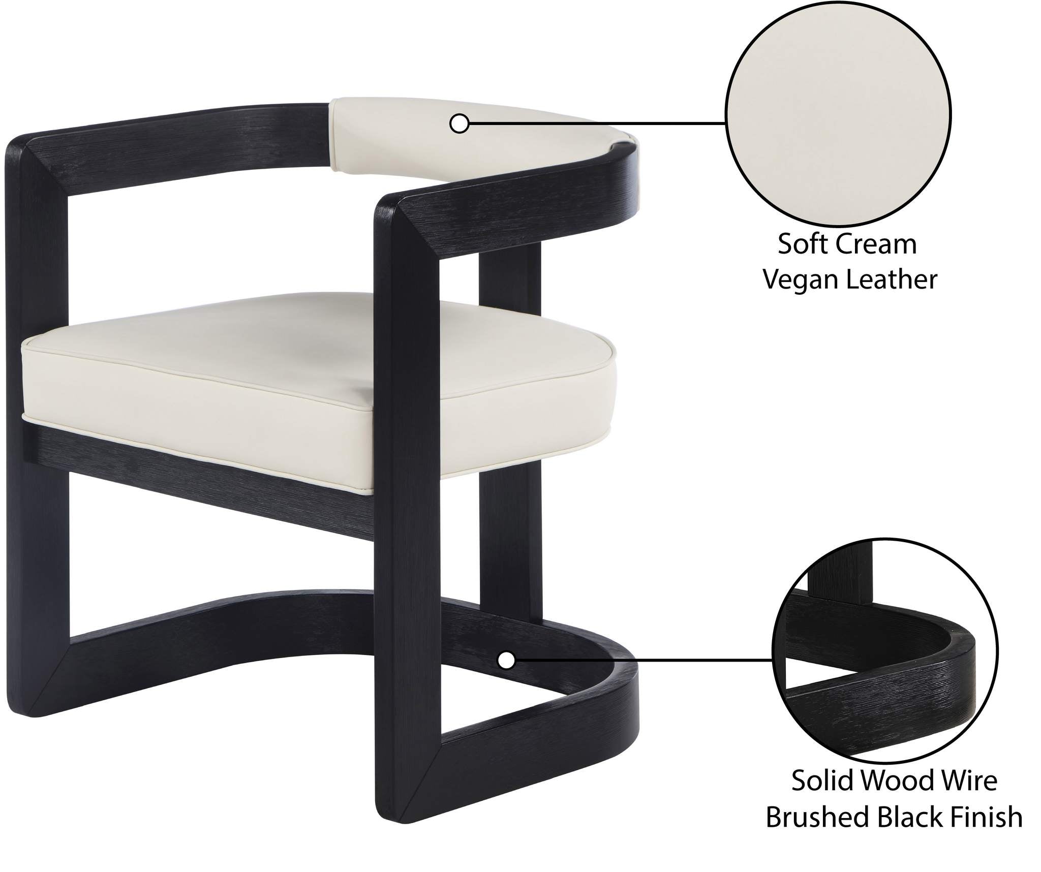Show off your wild side with this unique Manchester vegan leather dining chair from Meridian Furniture. Featuring a frame crafted out of solid rubber wood with a wire brushed black finish, this chair makes a bold statement in any dining space. A soft cream vegan leather cushion and backrest add comfort while you sit and dine, as well as give the chair a 'wild side' flavor. Its contemporary design works well in any living space.