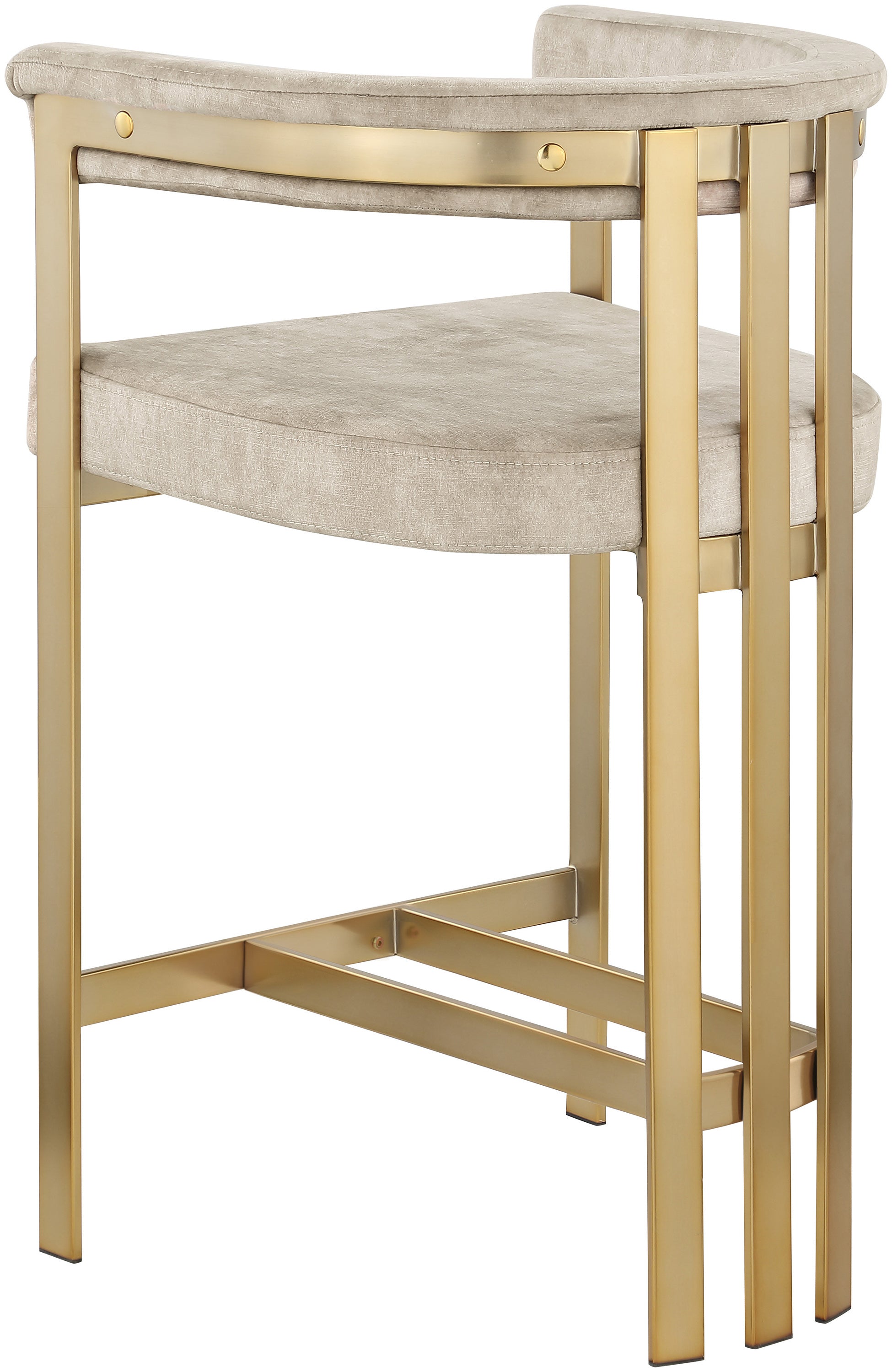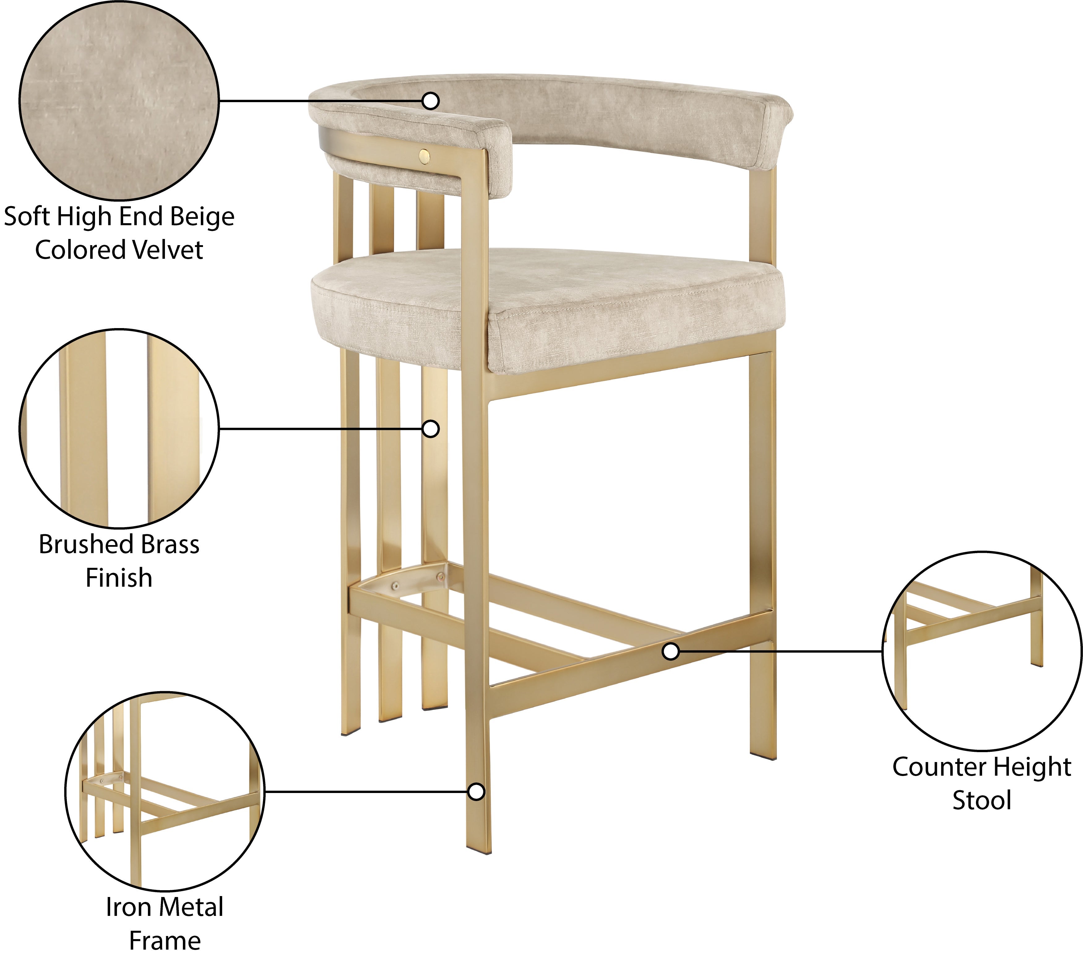 Turn your dining space into a contemporary haven with this Marcello beige velvet counter stool. Its soft, high-end beige velvet is soft for you to sit on, while its brushed brass iron frame ensures durability for years to come. Its curved back provides support while you sit and enjoy your meal, so your back won't get tired or hurt while you eat. Its curved, contemporary design is perfect for any modern home.