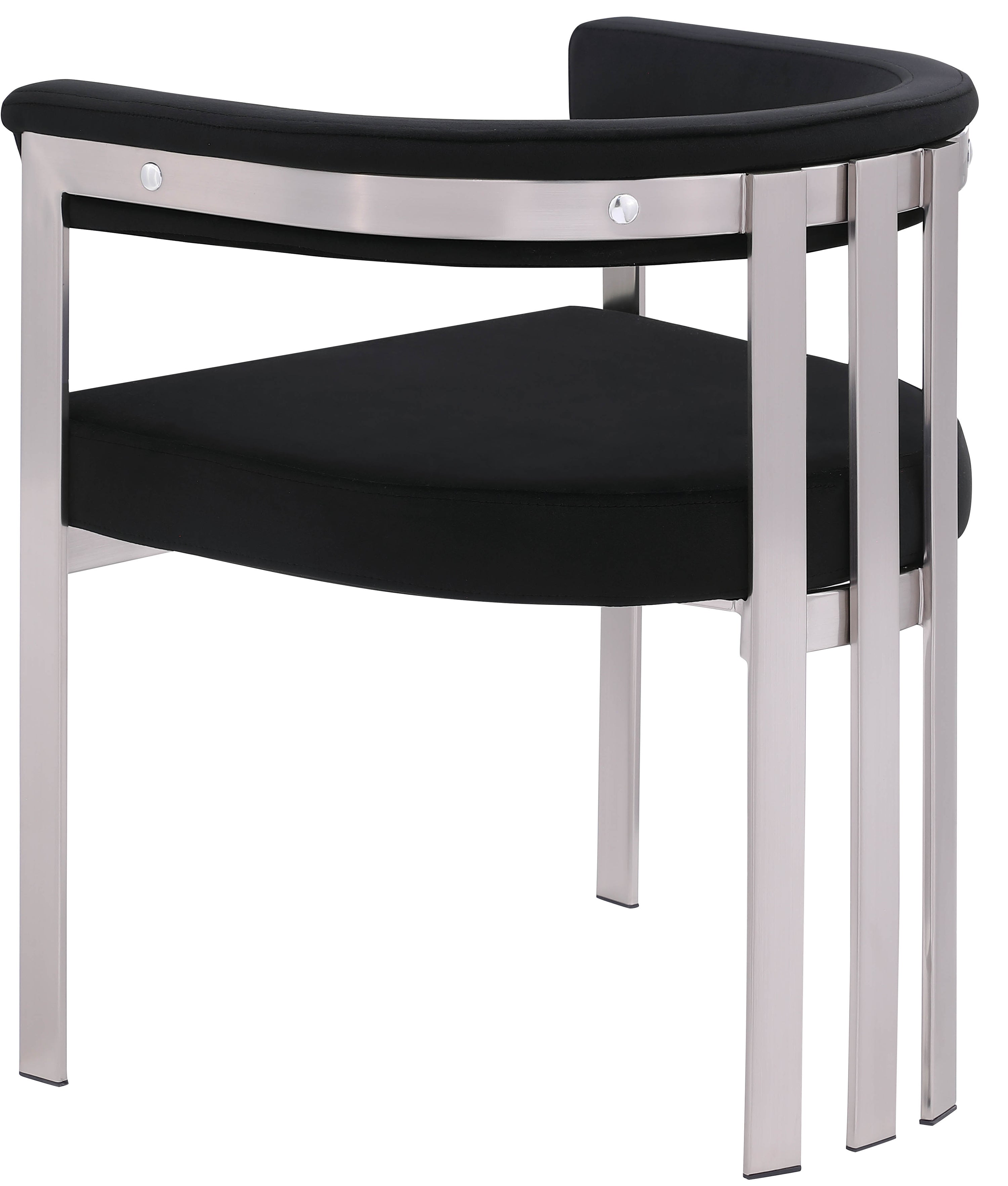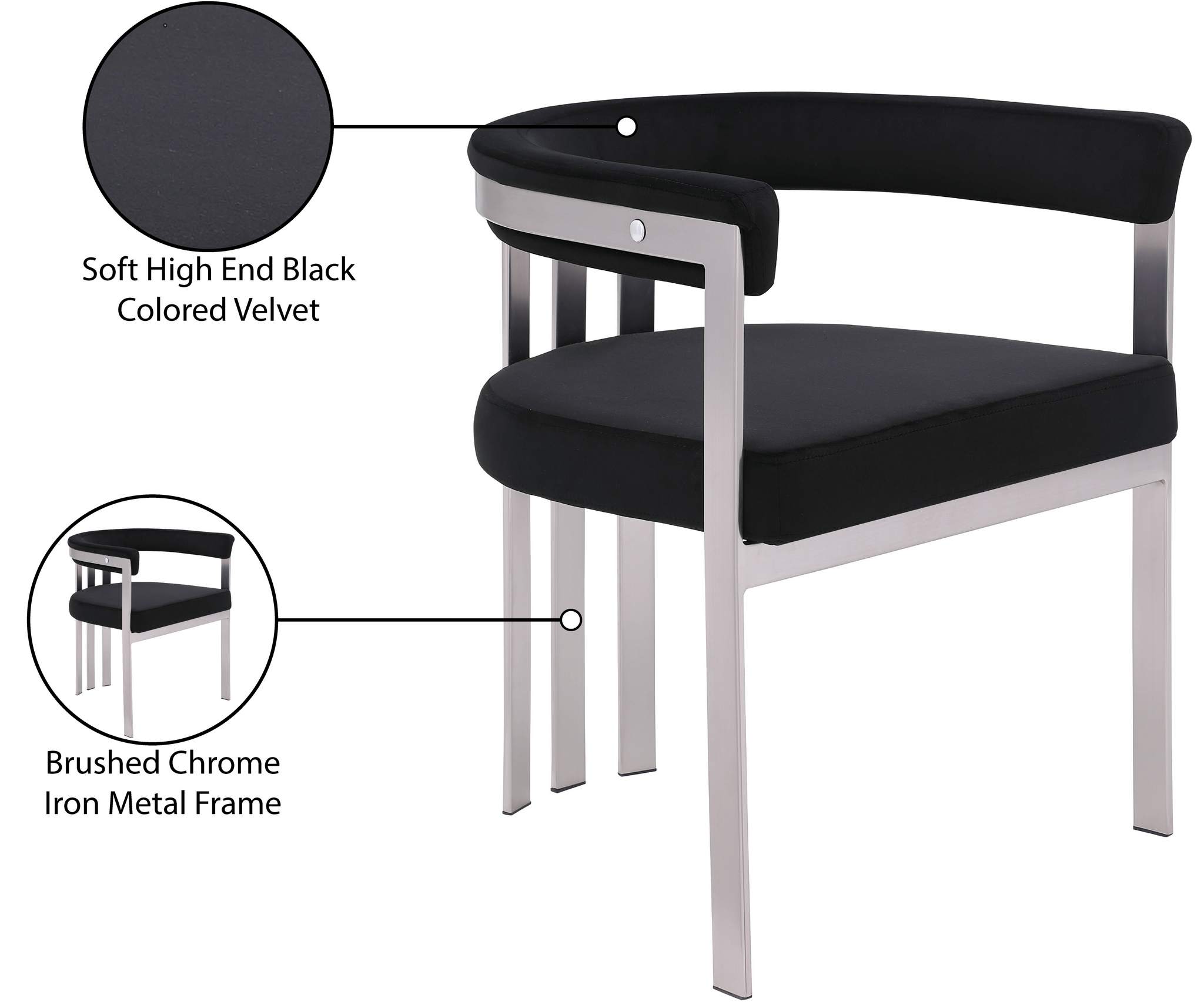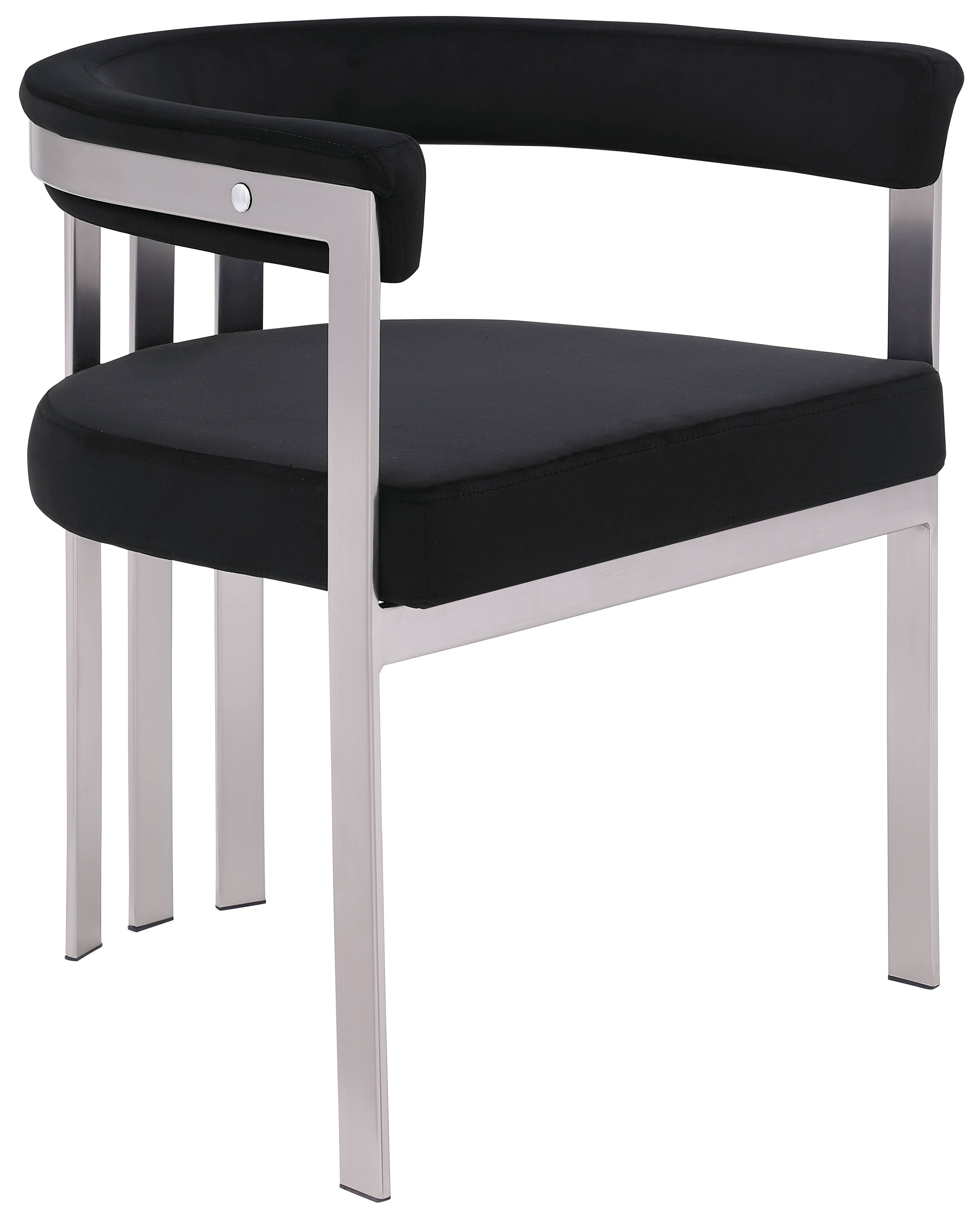 Turn your dining space into a contemporary haven with this Marcello black velvet dining chair. Its soft, high-end black velvet is soft for you to sit on, while its brushed chrome iron frame ensures durability for years to come. Its curved back provides support while you sit and enjoy your meal, so your back won't get tired or hurt while you eat. Its curved, contemporary design is perfect for any modern home.