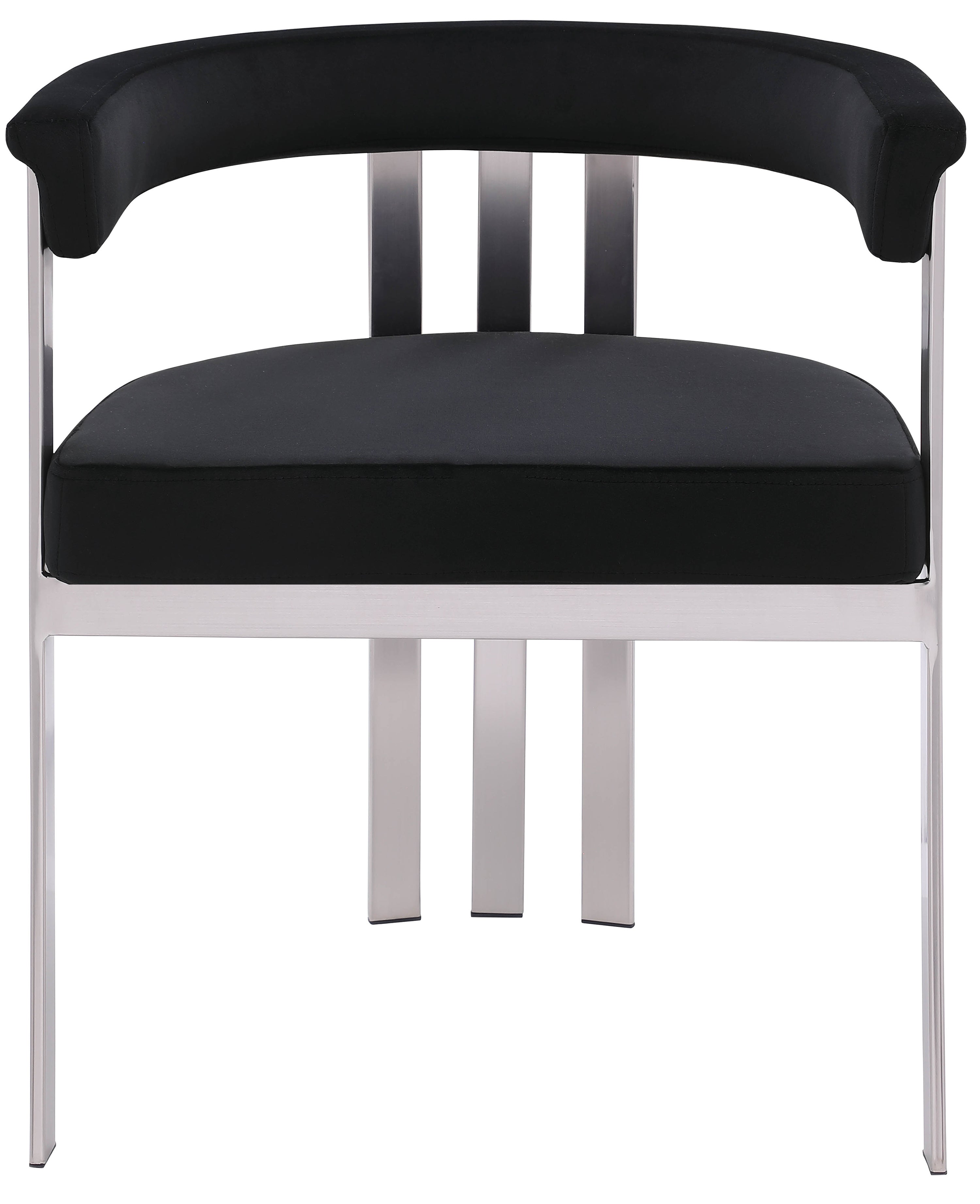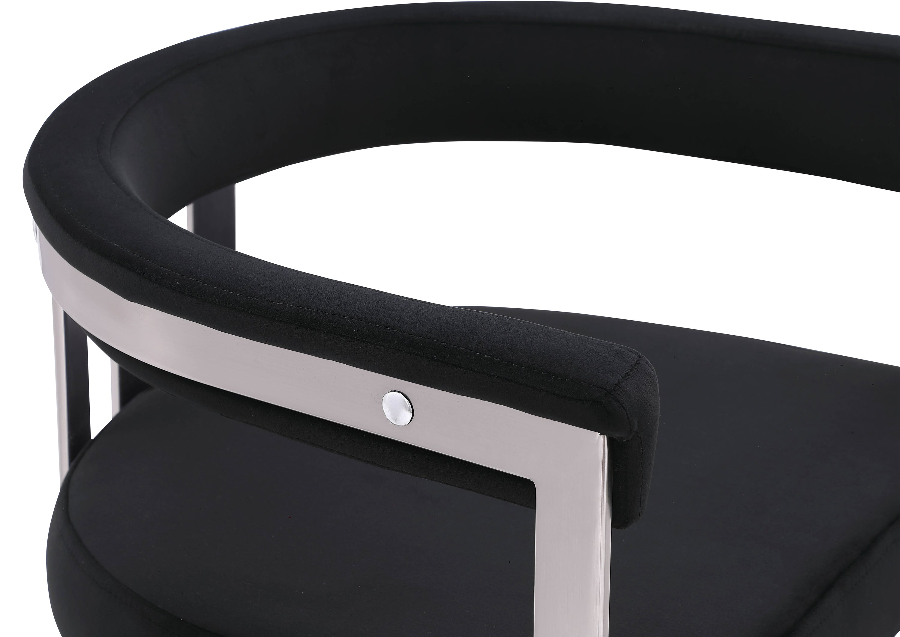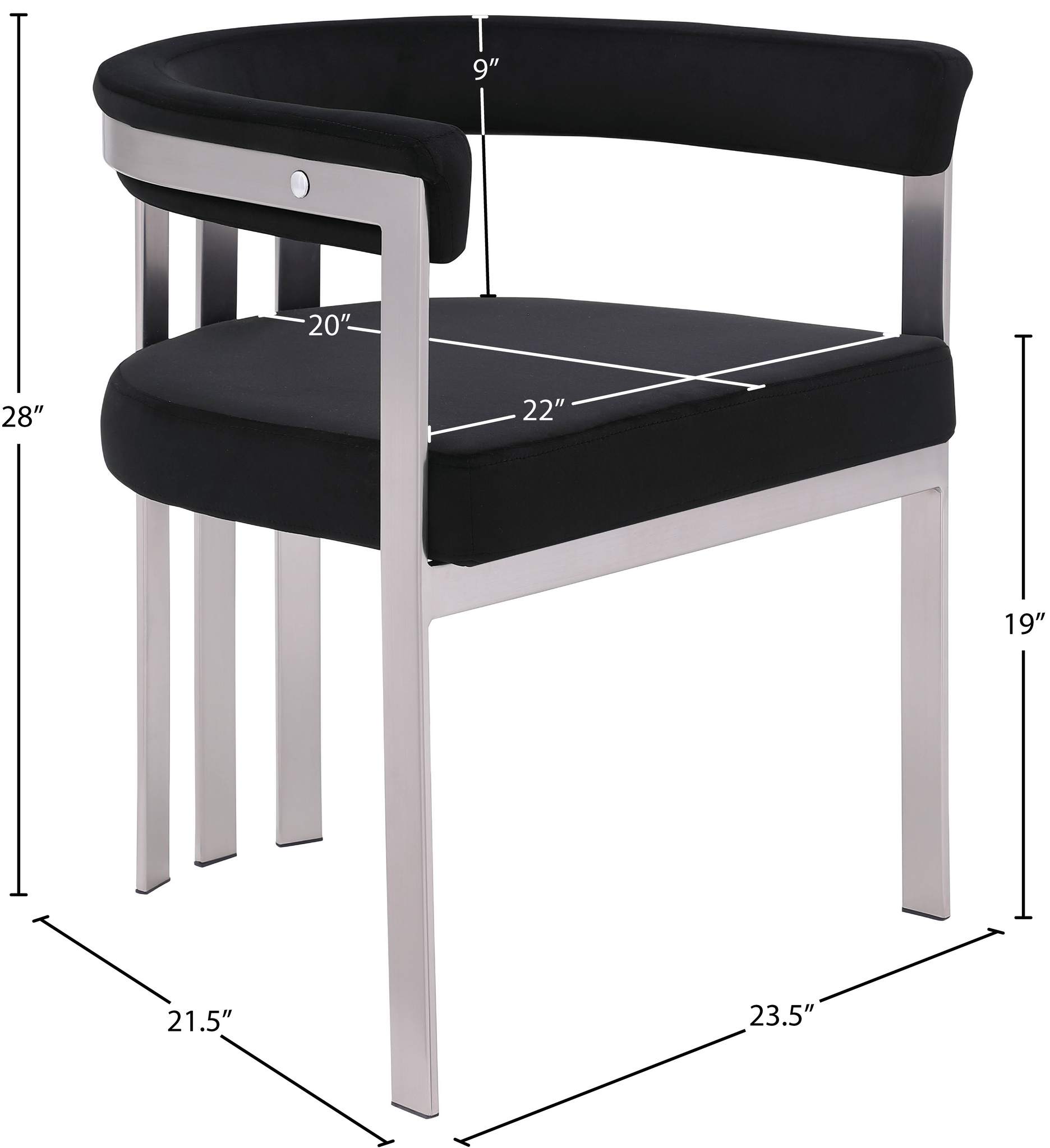 Turn your dining space into a contemporary haven with this Marcello black velvet dining chair. Its soft, high-end black velvet is soft for you to sit on, while its brushed chrome iron frame ensures durability for years to come. Its curved back provides support while you sit and enjoy your meal, so your back won't get tired or hurt while you eat. Its curved, contemporary design is perfect for any modern home.