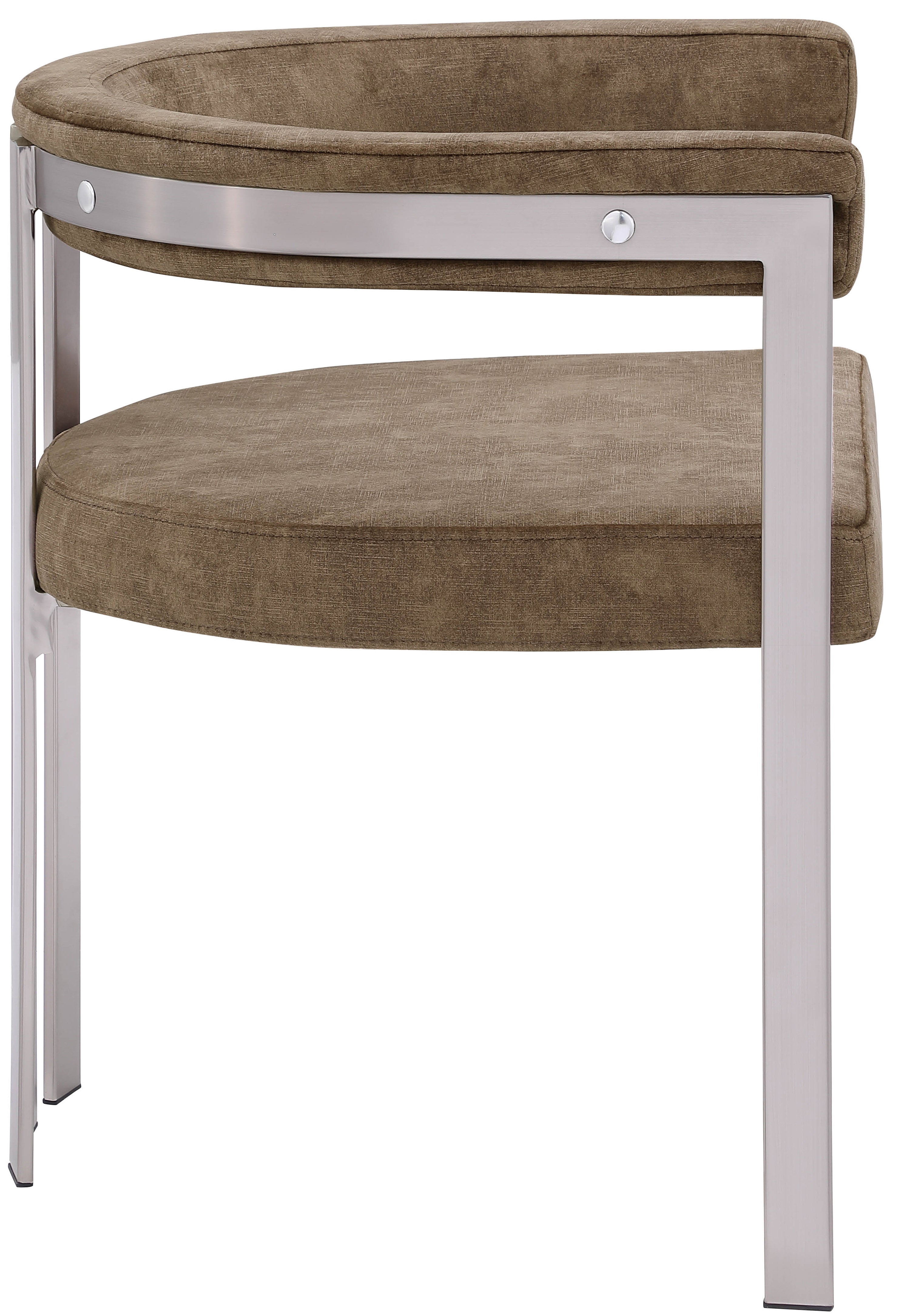 Turn your dining space into a contemporary haven with this Marcello brown velvet dining chair. Its soft, high-end brown velvet is soft for you to sit on, while its brushed chrome iron frame ensures durability for years to come. Its curved back provides support while you sit and enjoy your meal, so your back won't get tired or hurt while you eat. Its curved, contemporary design is perfect for any modern home.