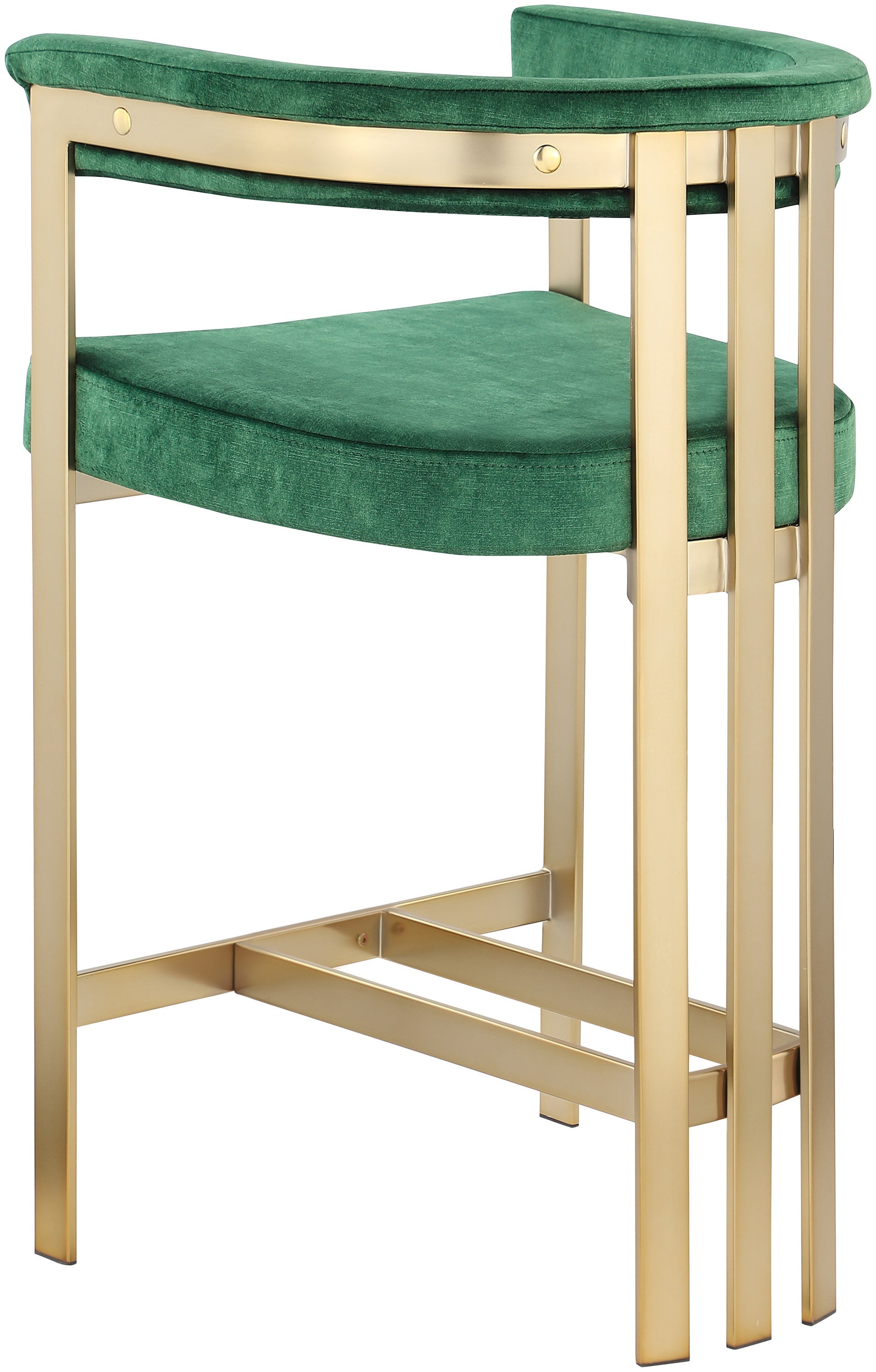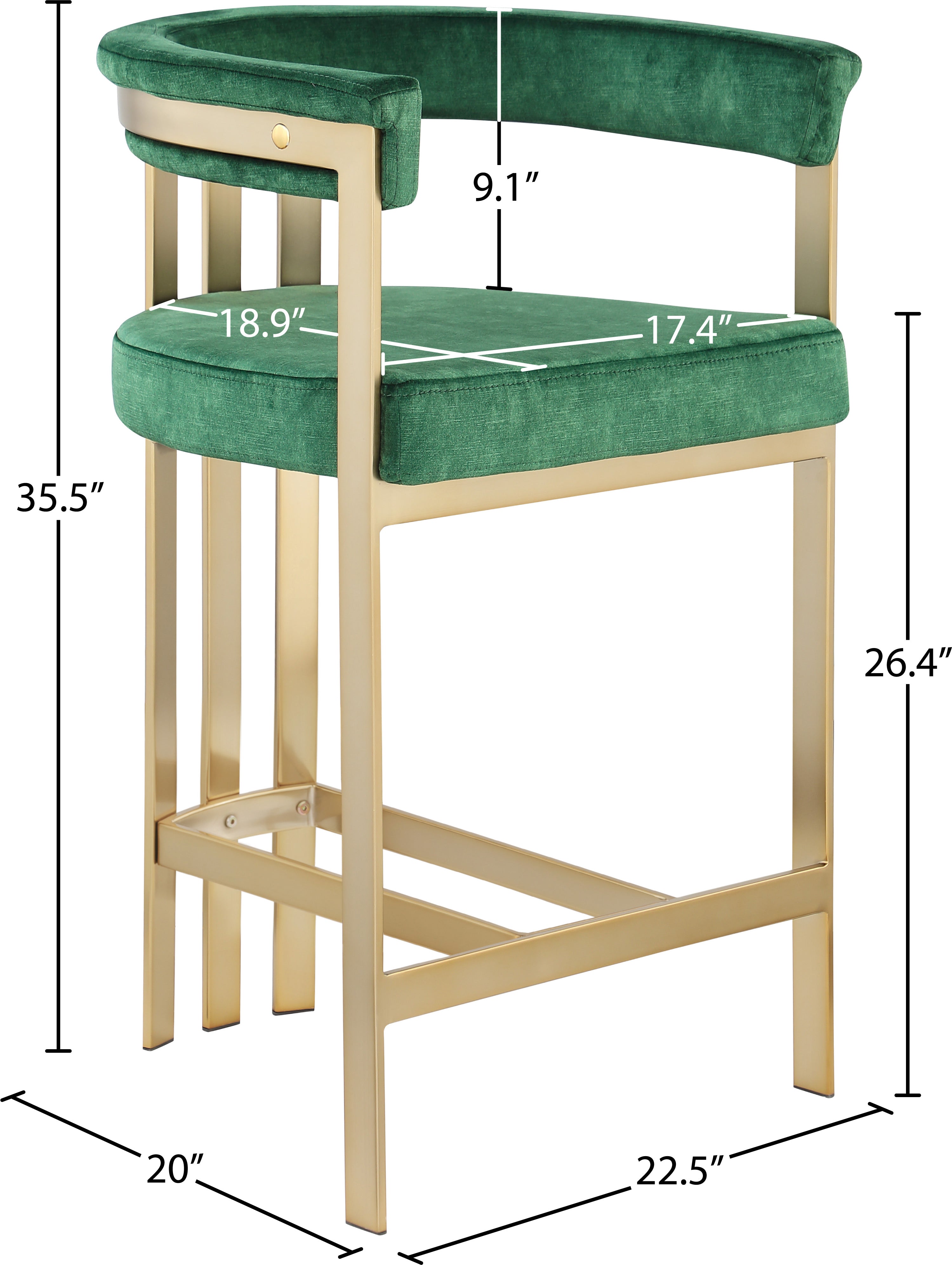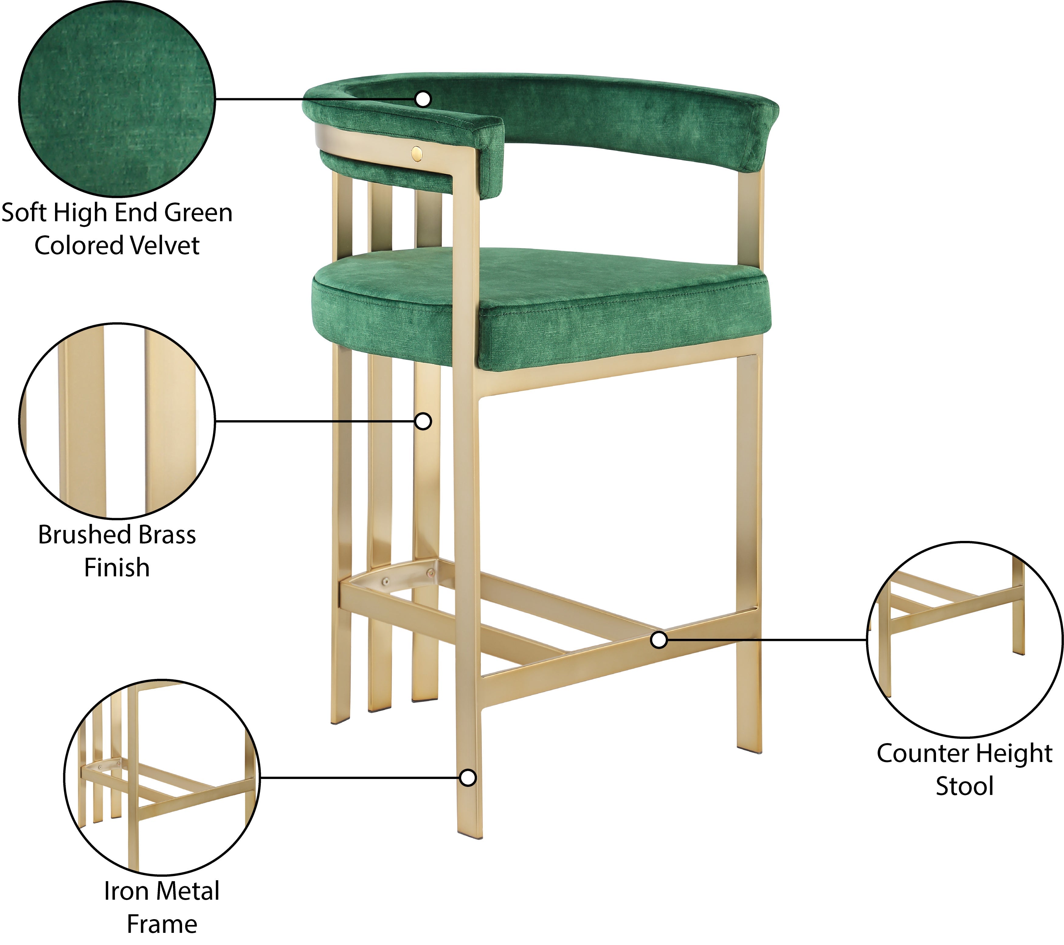Turn your dining space into a contemporary haven with this Marcello green velvet counter stool. Its soft, high-end green velvet is soft for you to sit on, while its brushed brass iron frame ensures durability for years to come. Its curved back provides support while you sit and enjoy your meal, so your back won't get tired or hurt while you eat. Its curved, contemporary design is perfect for any modern home.