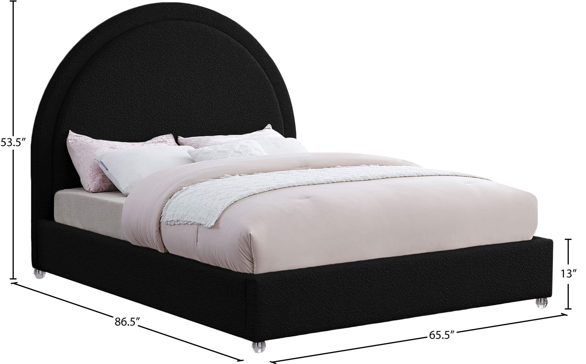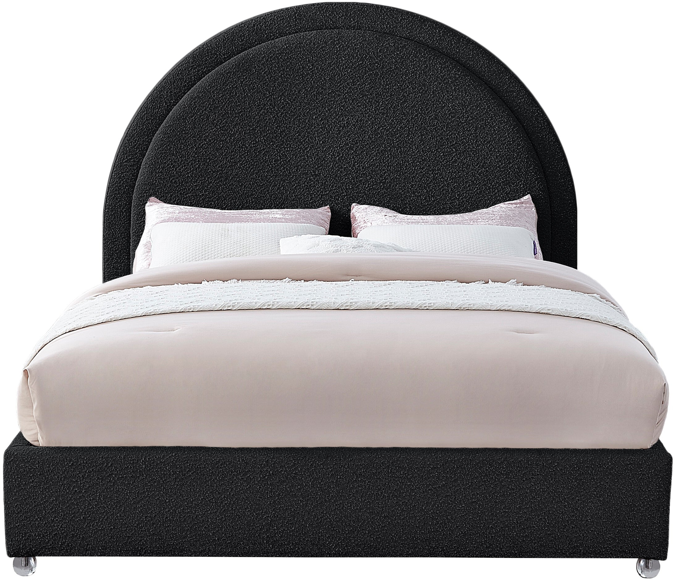 Get ready for compliments when you add this Milo boucle fabric bed to your space. It's upholstered head to foot in rich black boucle fabric, so it's soft to the touch and regal to the eye. The star of the show is the bed's rounded headboard, which stretches out tall above you for a look that oozes regality and sophisticated charm. Acrylic legs give the bed a somewhat modern finish.