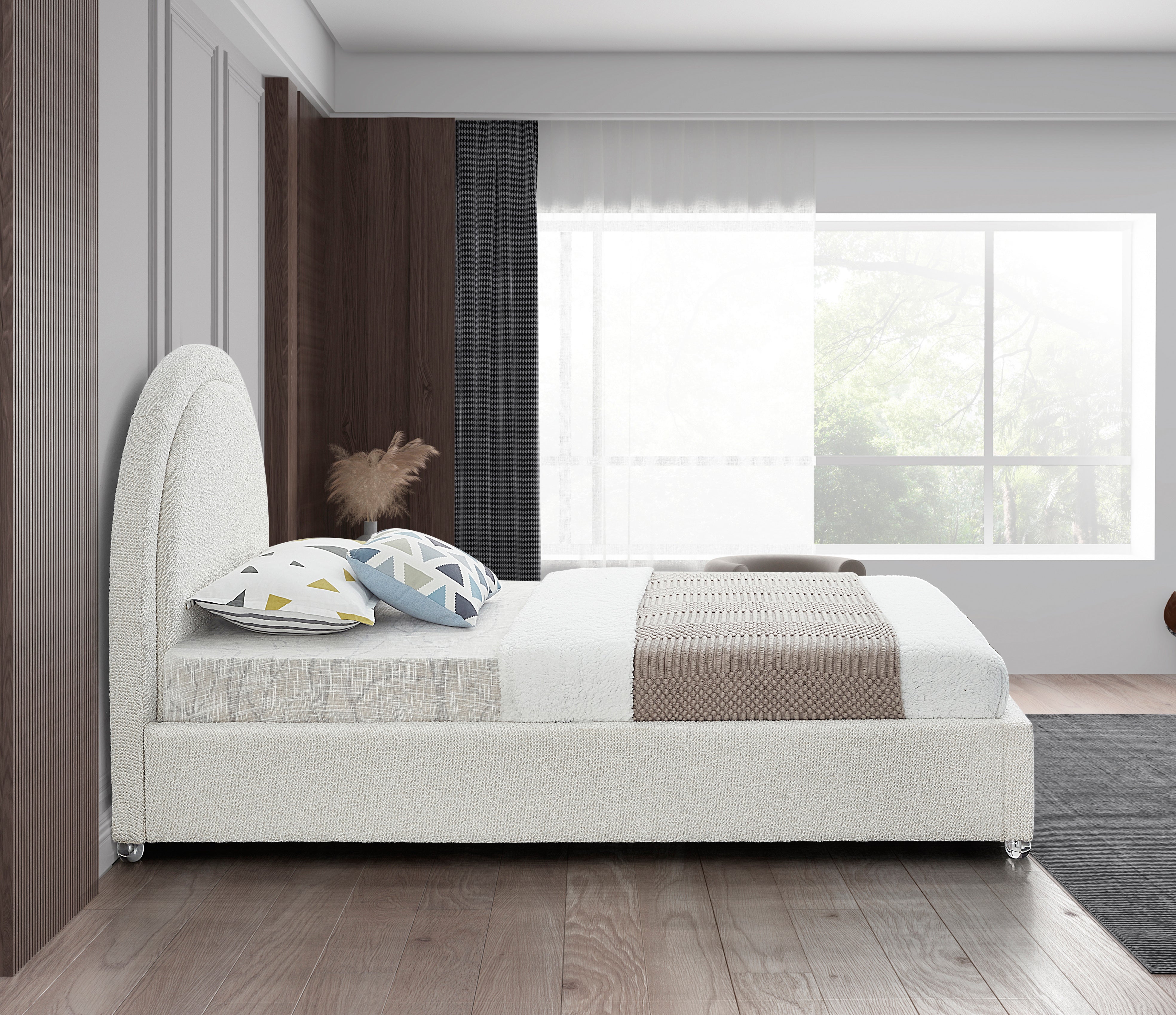 Get ready for compliments when you add this Milo boucle fabric bed to your space. It's upholstered head to foot in rich cream boucle fabric, so it's soft to the touch and regal to the eye. The star of the show is the bed's rounded headboard, which stretches out tall above you for a look that oozes regality and sophisticated charm. Acrylic legs give the bed a somewhat modern finish.