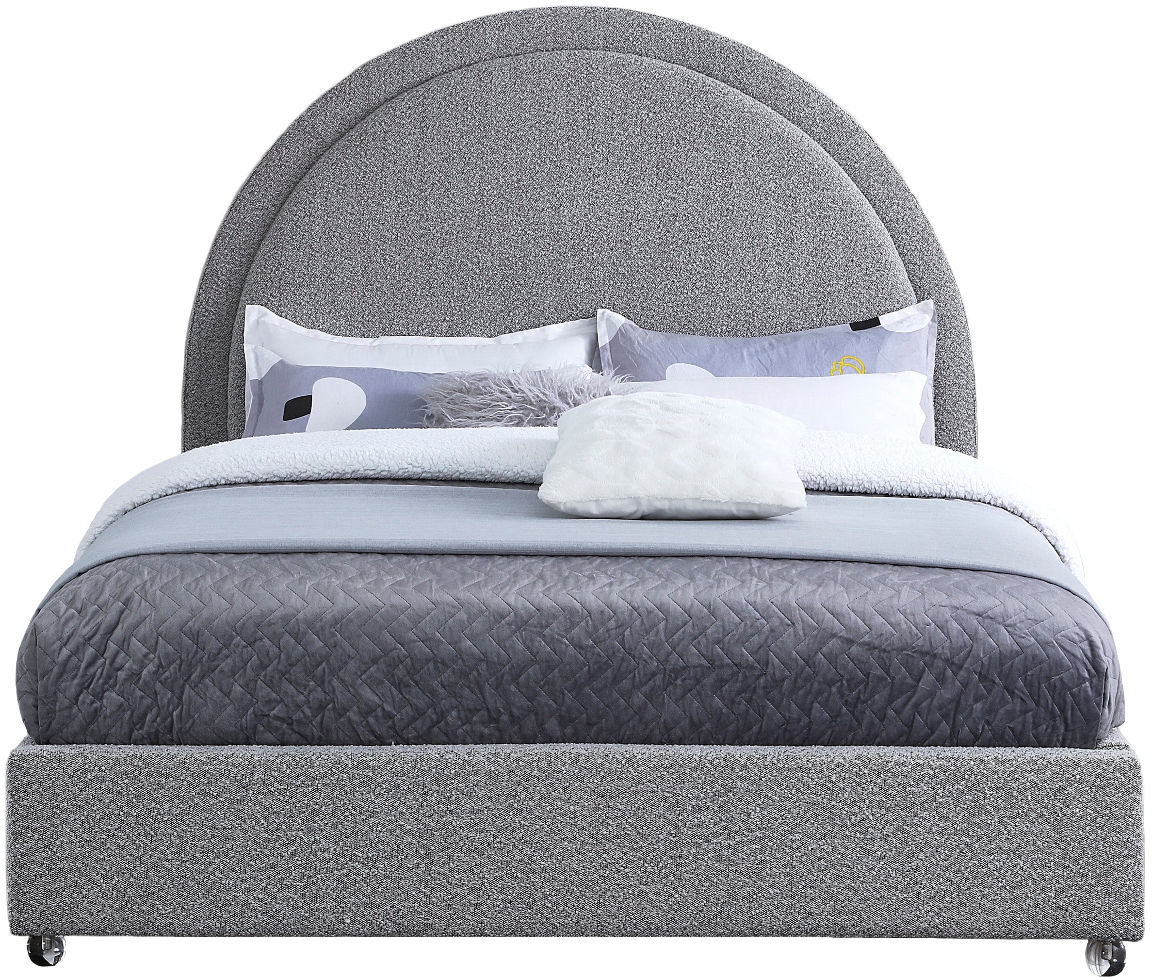 Get ready for compliments when you add this Milo boucle fabric bed to your space. It's upholstered head to foot in rich grey boucle fabric, so it's soft to the touch and regal to the eye. The star of the show is the bed's rounded headboard, which stretches out tall above you for a look that oozes regality and sophisticated charm. Acrylic legs give the bed a somewhat modern finish.