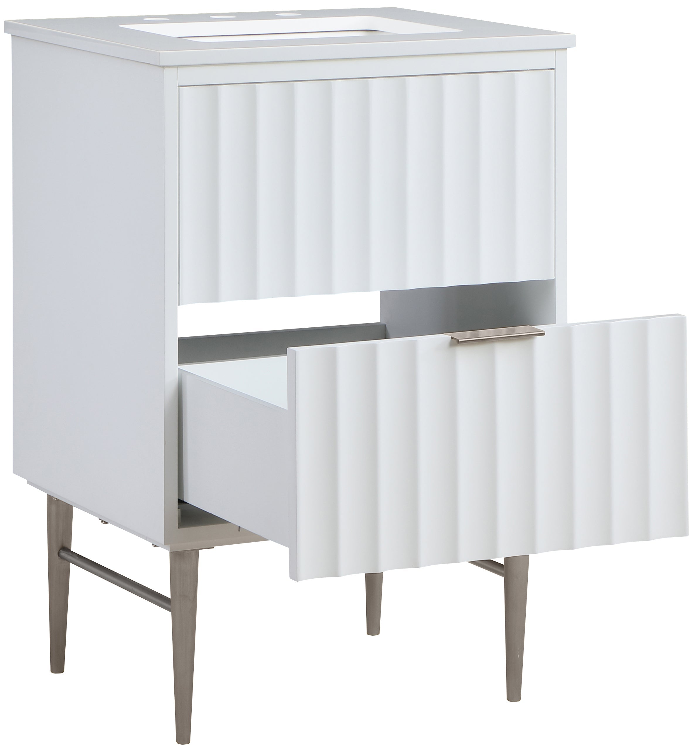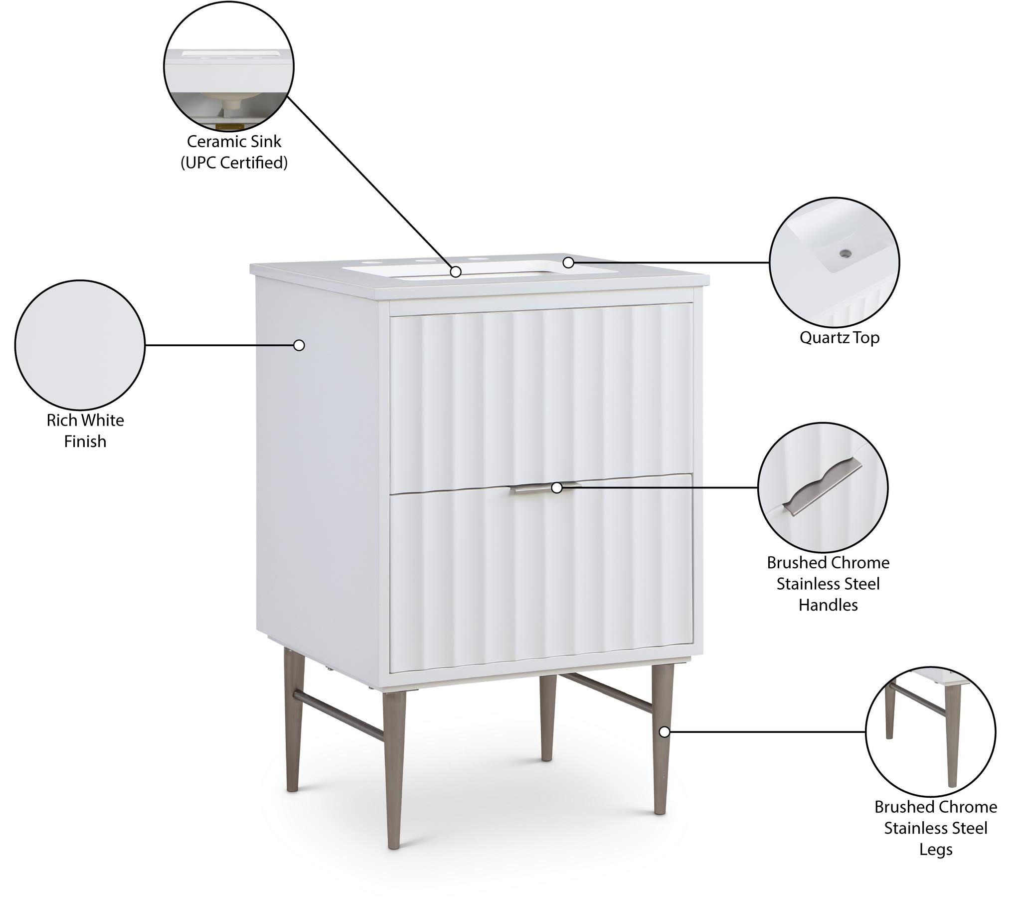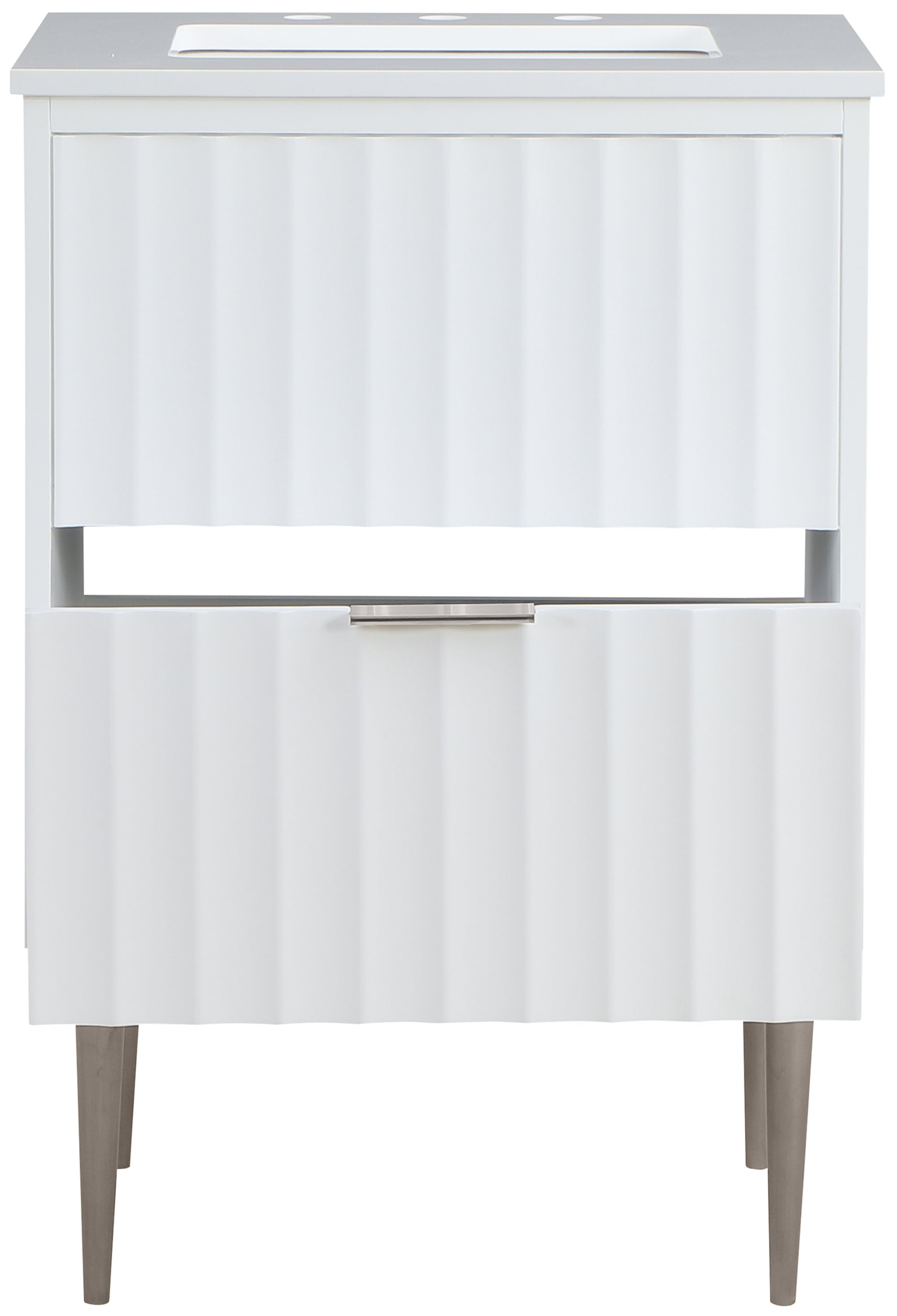 Your bathroom gets a revamp with this Modernist 24-inch bathroom vanity. This lovely vanity is a must for the contemporary bathroom space and features a rich white finish in brushed chrome for lasting beauty and performance. Made from solid wood and wood products, this vanity has a pretty Engineered Stone top for enduring good looks. Store bathroom essentials in its two drawers to keep your bathroom tidily organized.