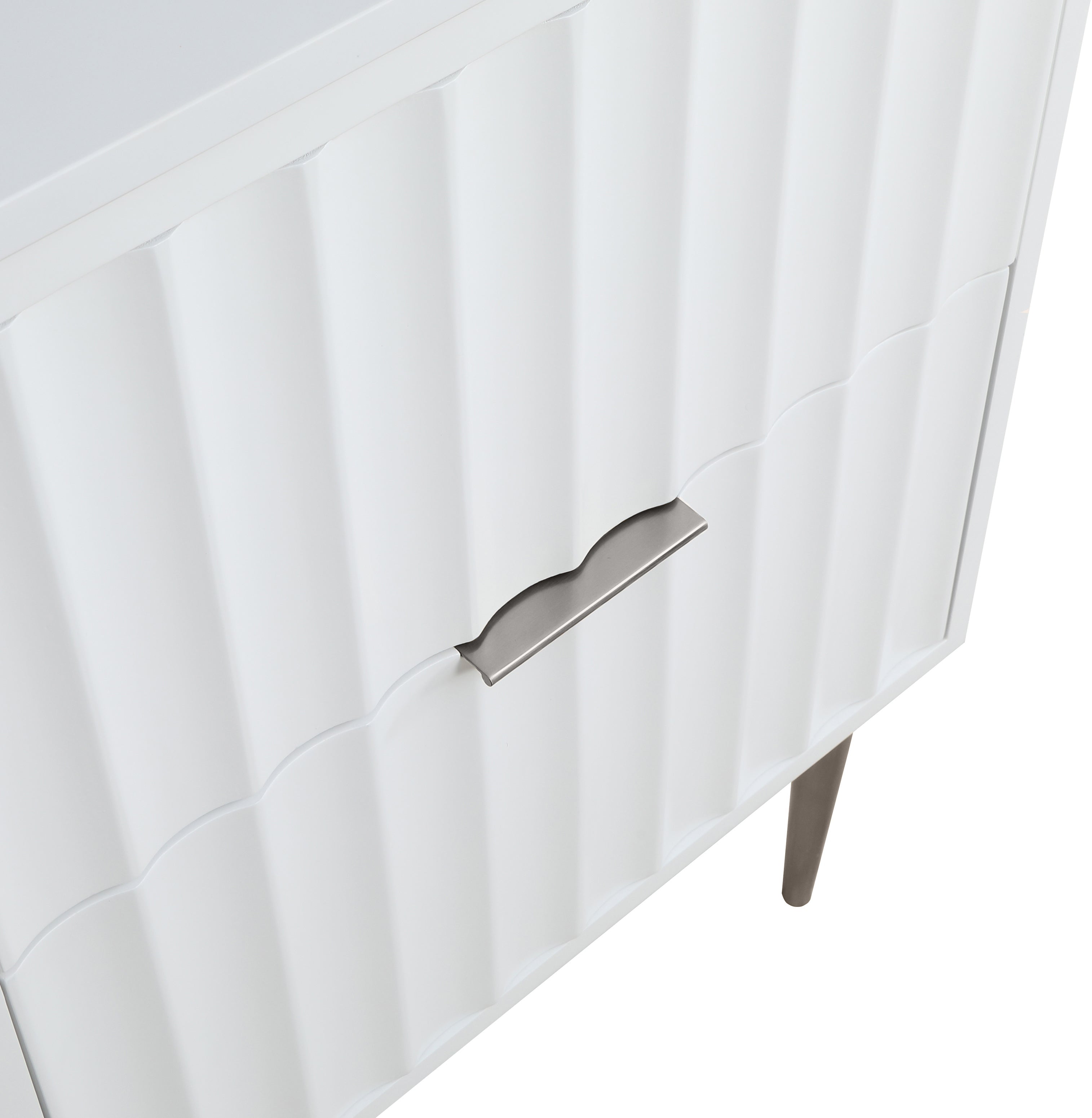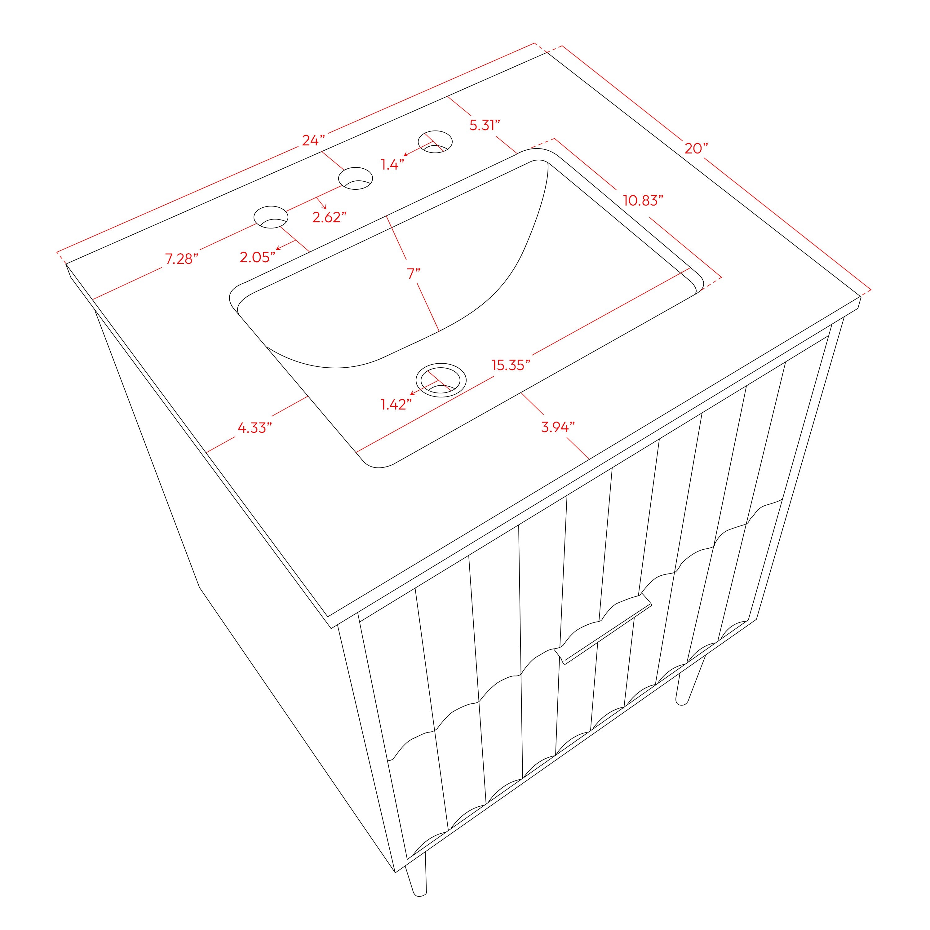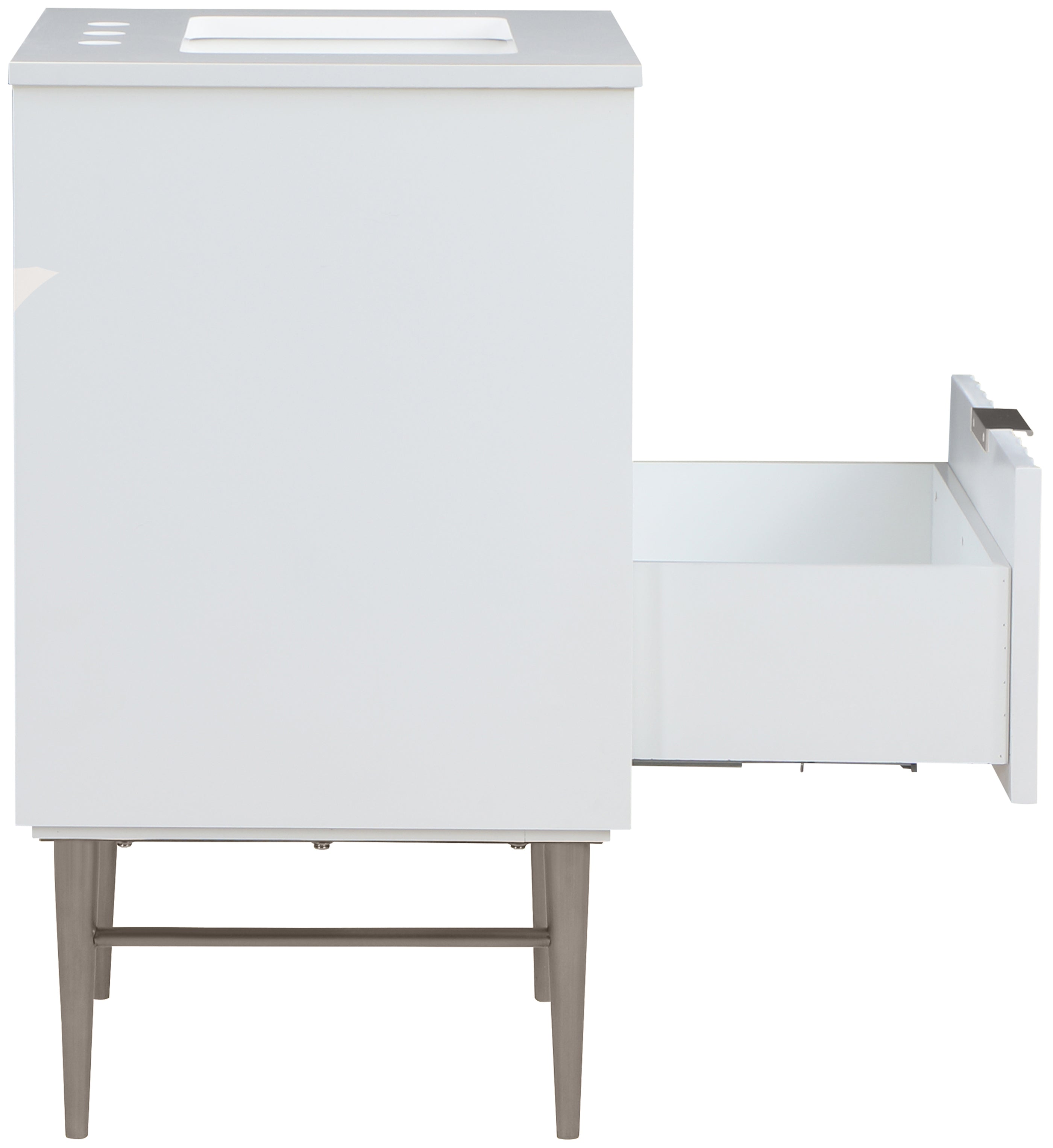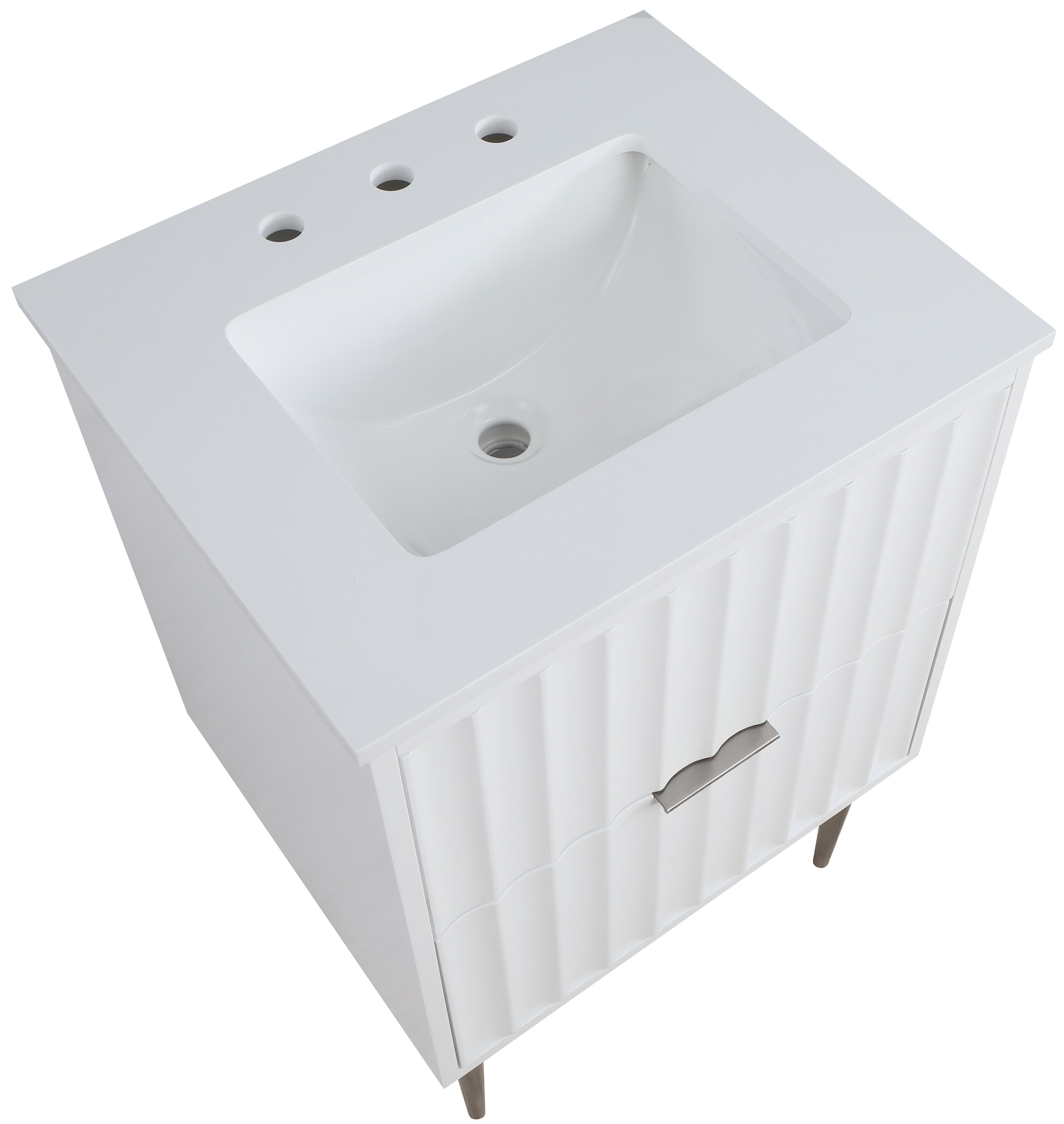 Your bathroom gets a revamp with this Modernist 24-inch bathroom vanity. This lovely vanity is a must for the contemporary bathroom space and features a rich white finish in brushed chrome for lasting beauty and performance. Made from solid wood and wood products, this vanity has a pretty Engineered Stone top for enduring good looks. Store bathroom essentials in its two drawers to keep your bathroom tidily organized.