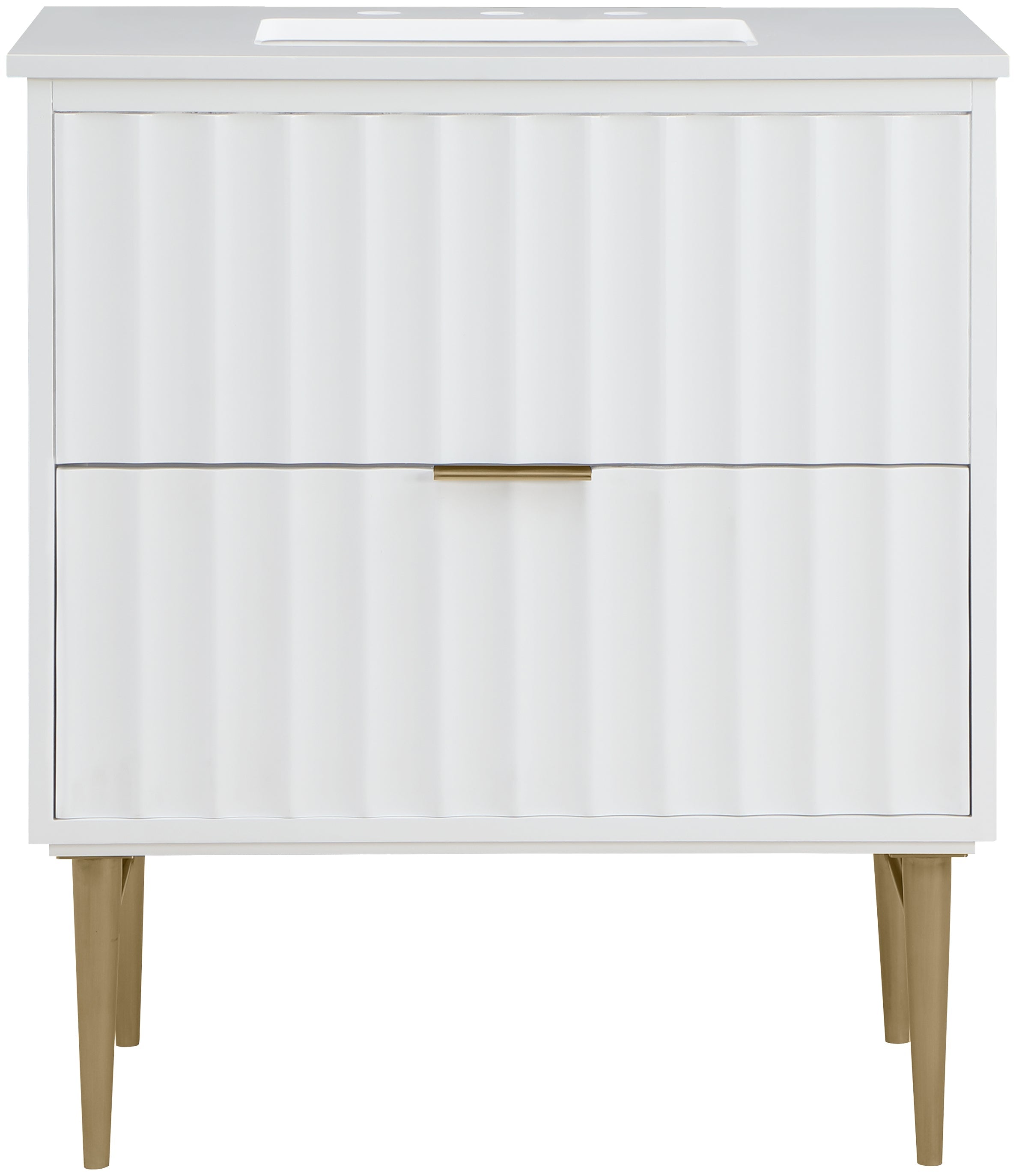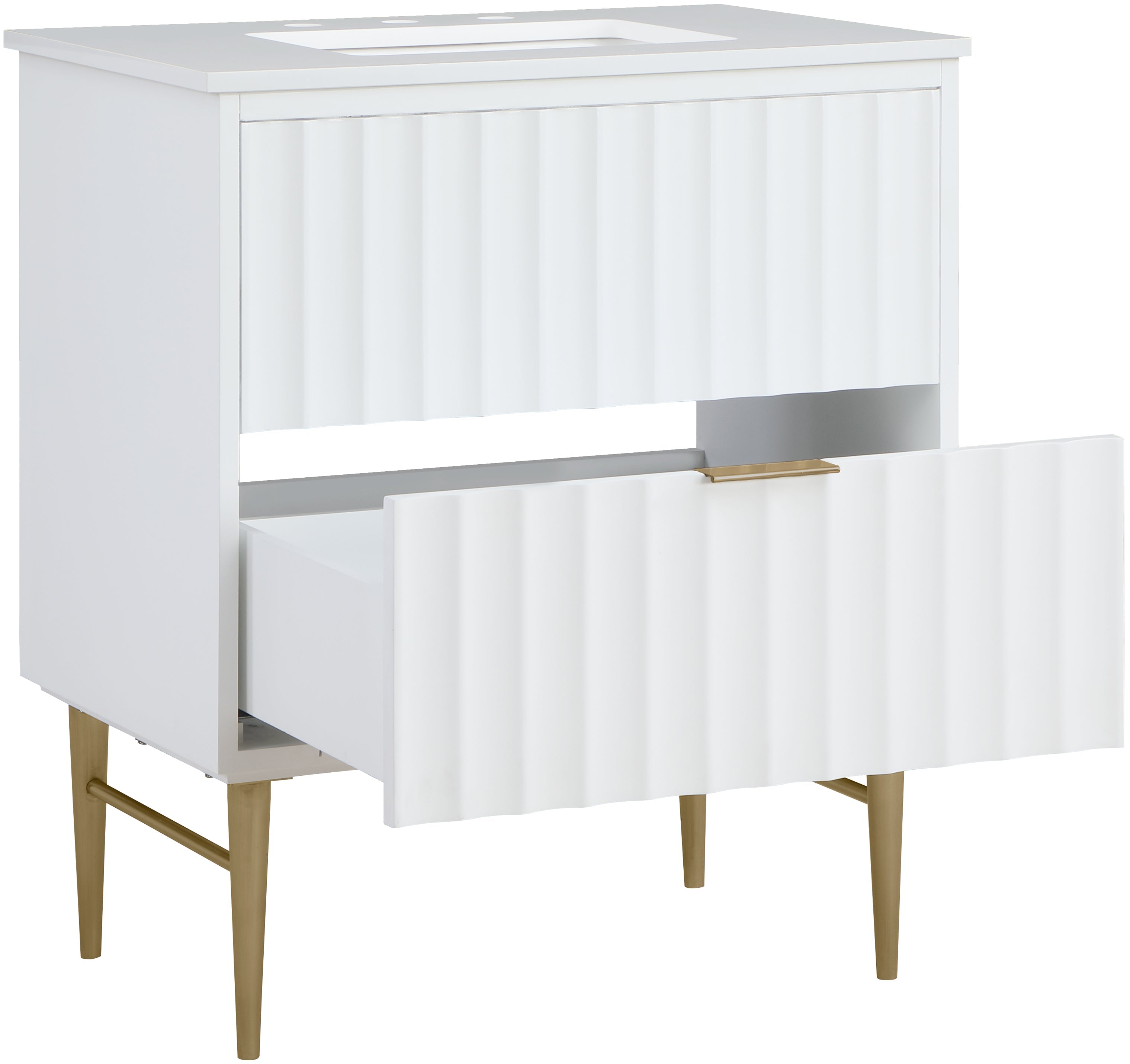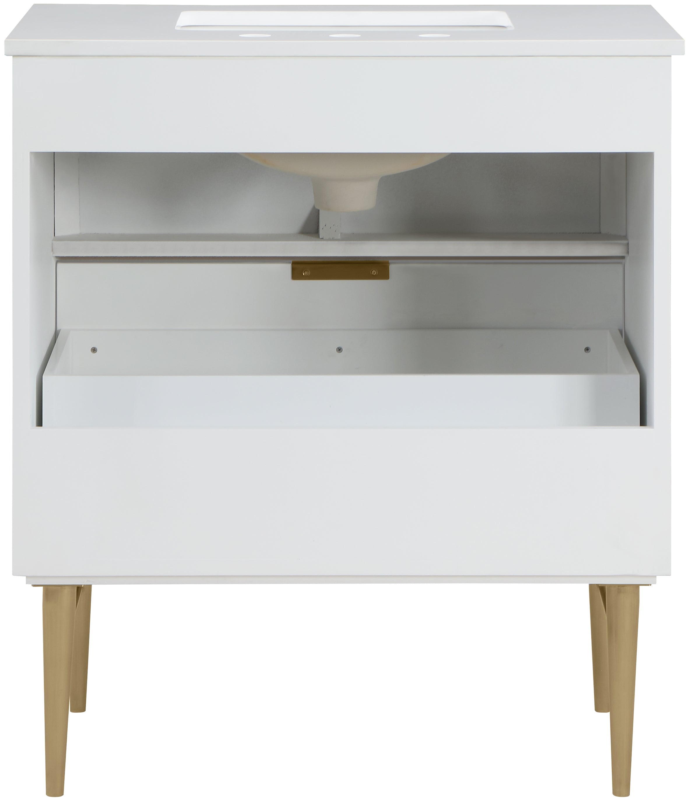 Give your bathroom a fresh new look with this Modernist bathroom vanity. This 30-inch vanity features a strikingly rich white finish for a clean, contemporary aesthetic. Brushed gold stainless steel legs and handles add to its robust appearance, and a Engineered Stone top adds to its resilient beauty. A sink made from ceramic lends the vanity lasting performance. Store bathroom essentials close at hand in the convenient slide-out drawer located on the bottom of the unit.