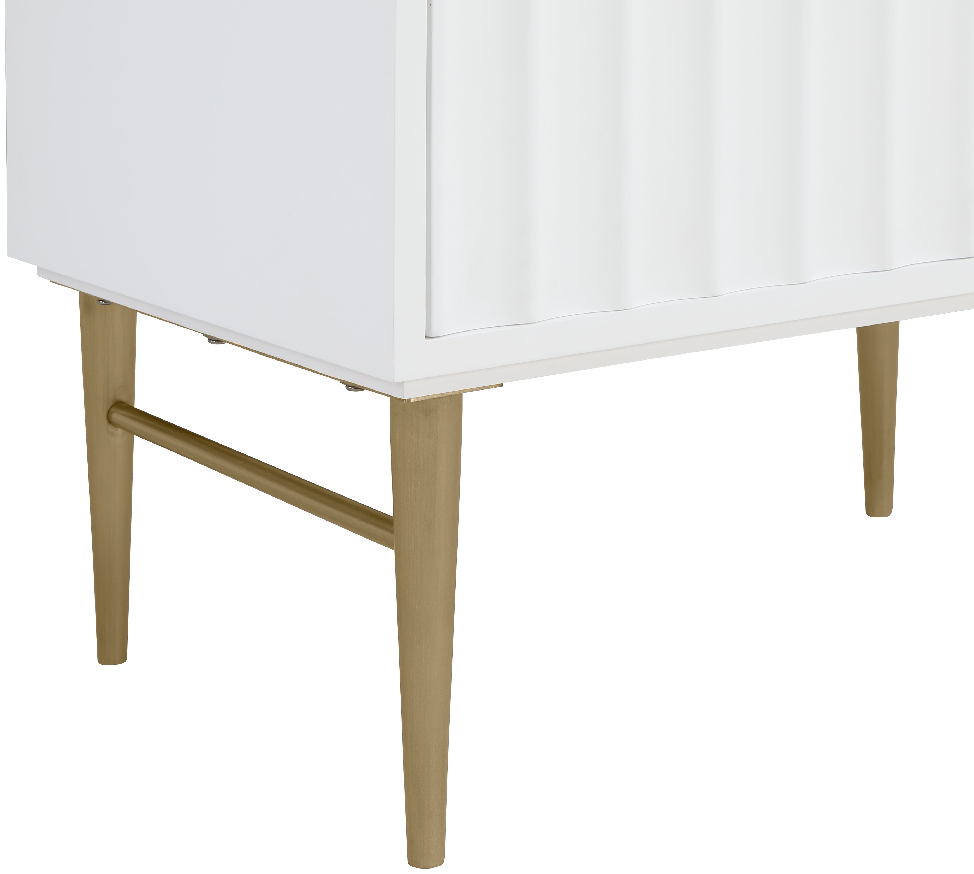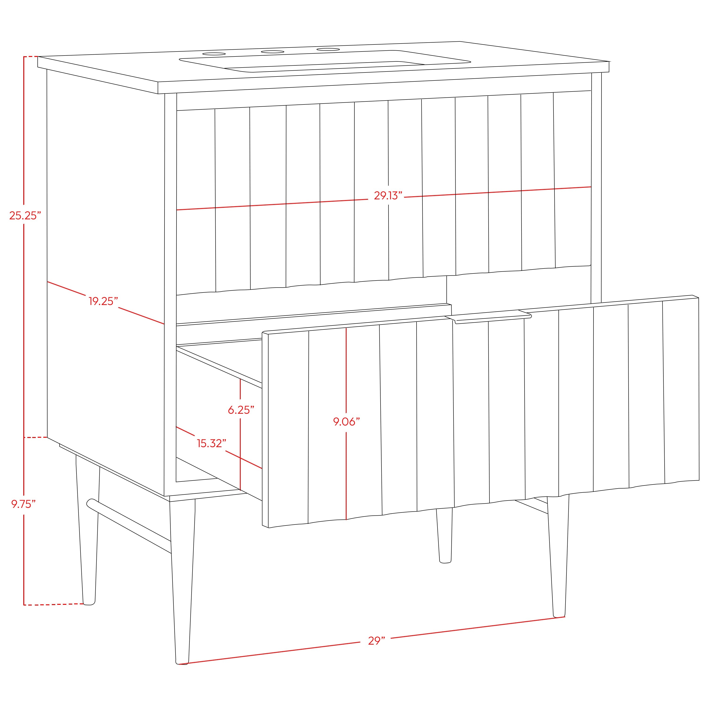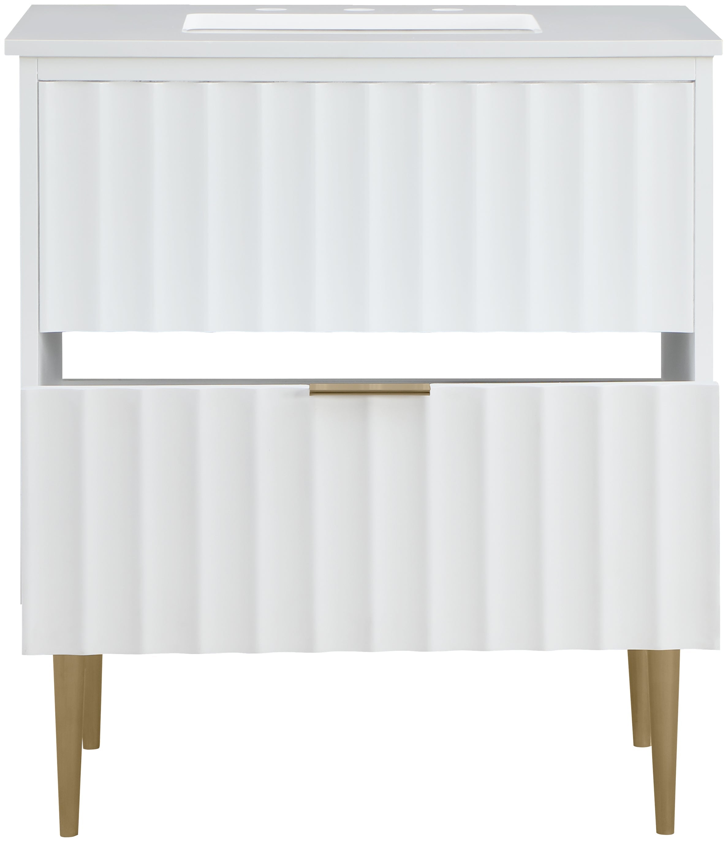 Give your bathroom a fresh new look with this Modernist bathroom vanity. This 30-inch vanity features a strikingly rich white finish for a clean, contemporary aesthetic. Brushed gold stainless steel legs and handles add to its robust appearance, and a Engineered Stone top adds to its resilient beauty. A sink made from ceramic lends the vanity lasting performance. Store bathroom essentials close at hand in the convenient slide-out drawer located on the bottom of the unit.