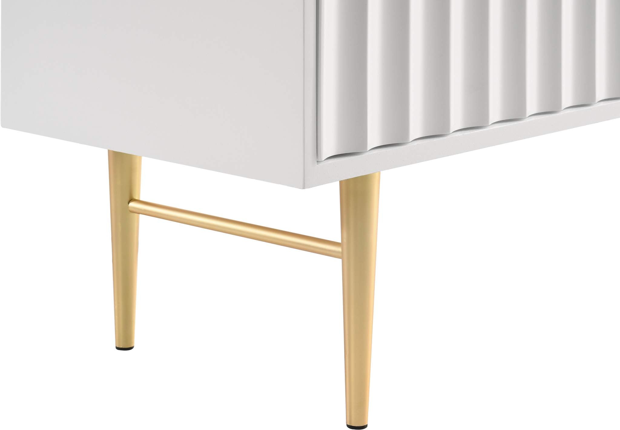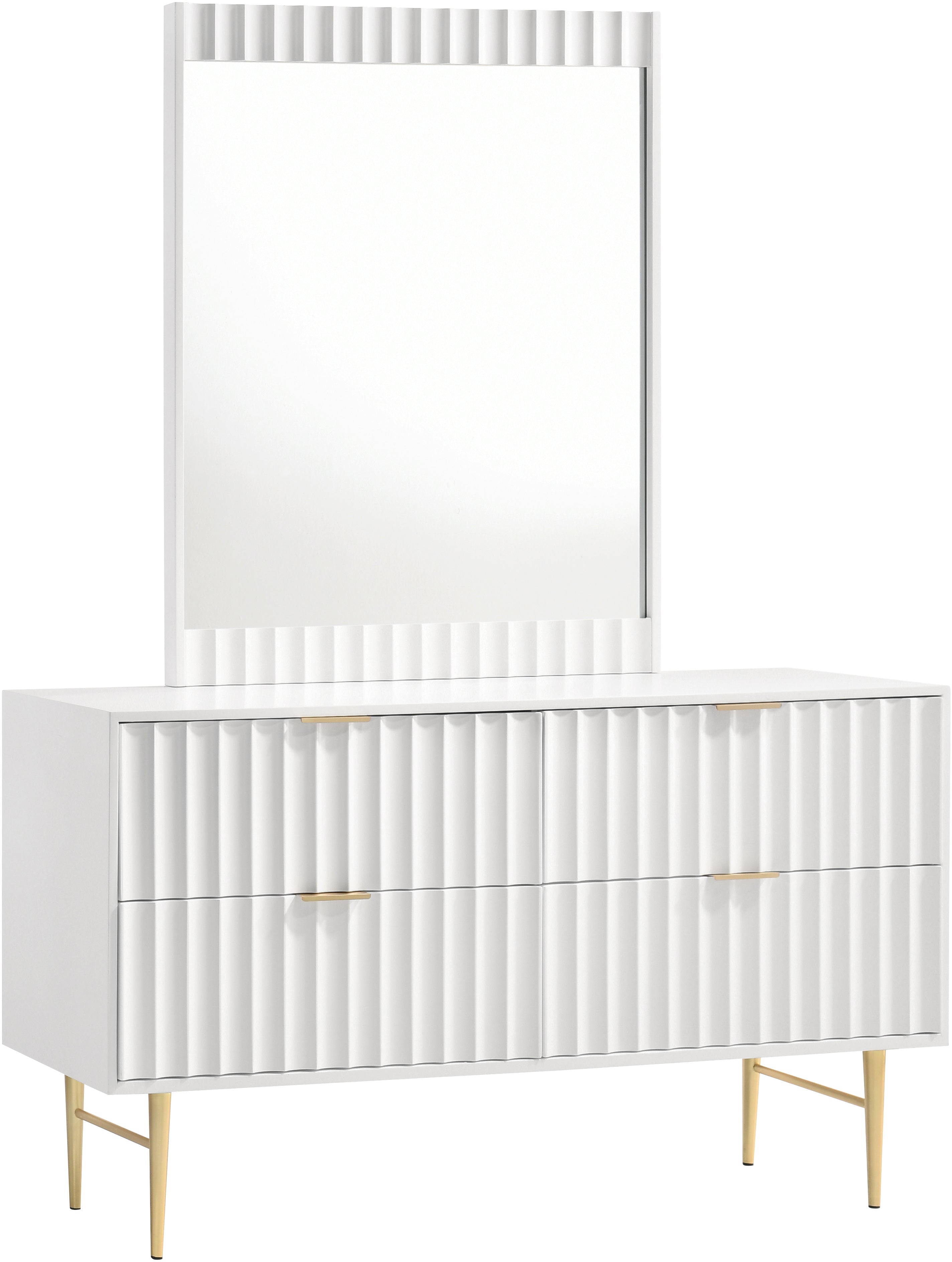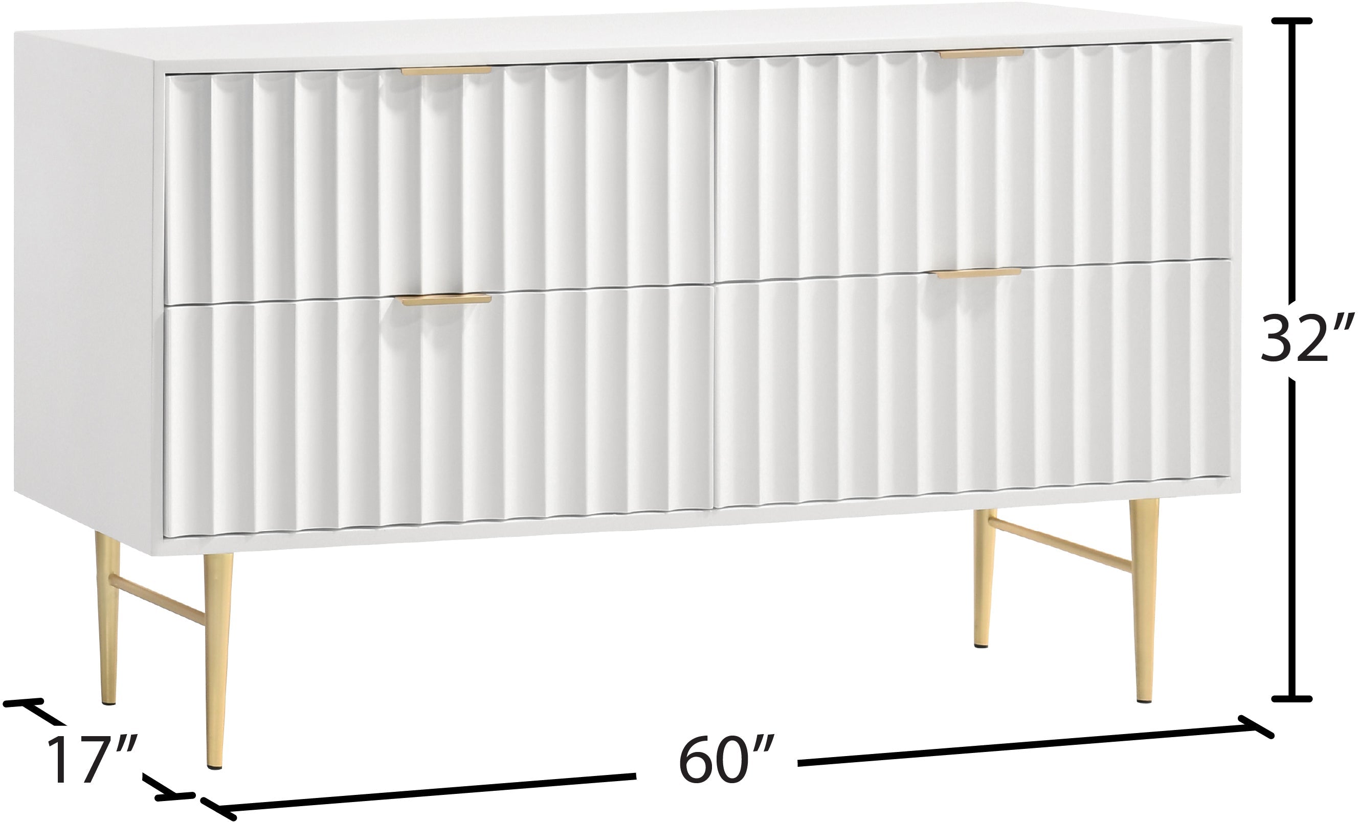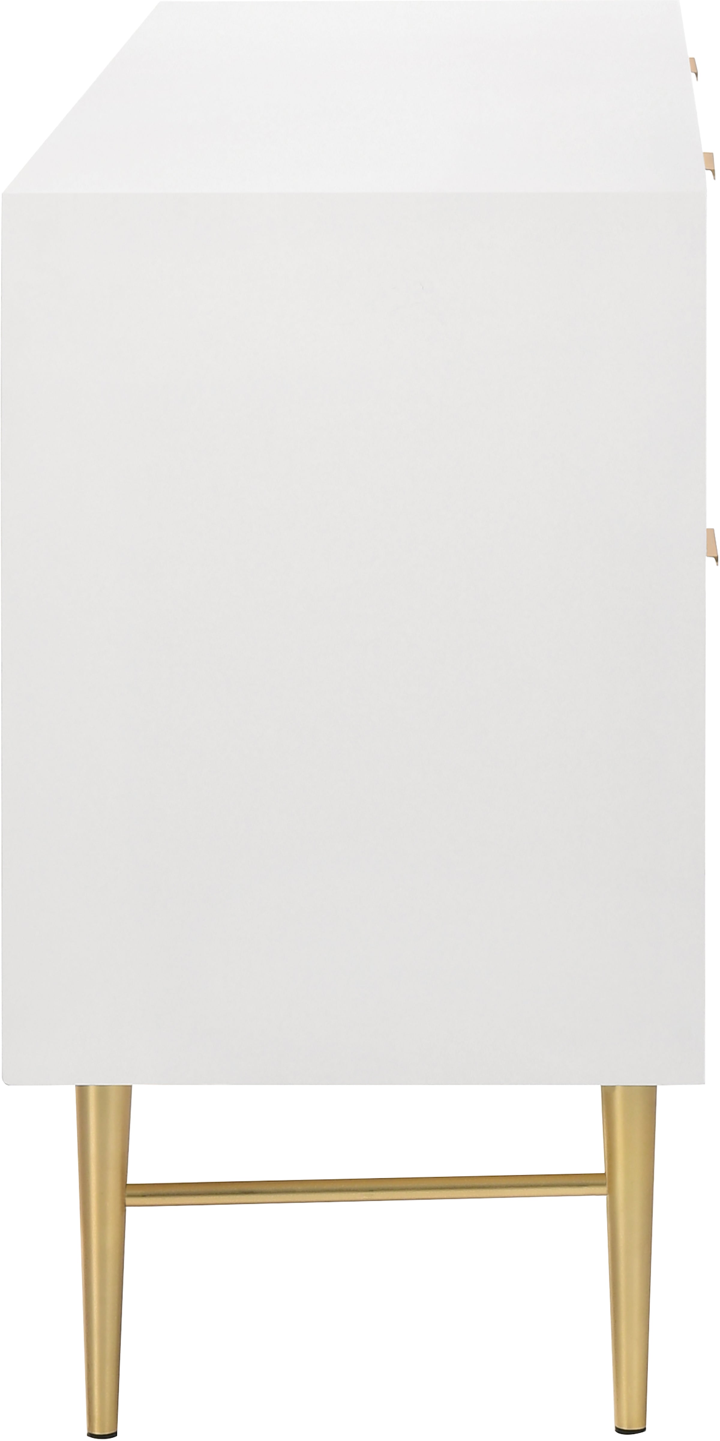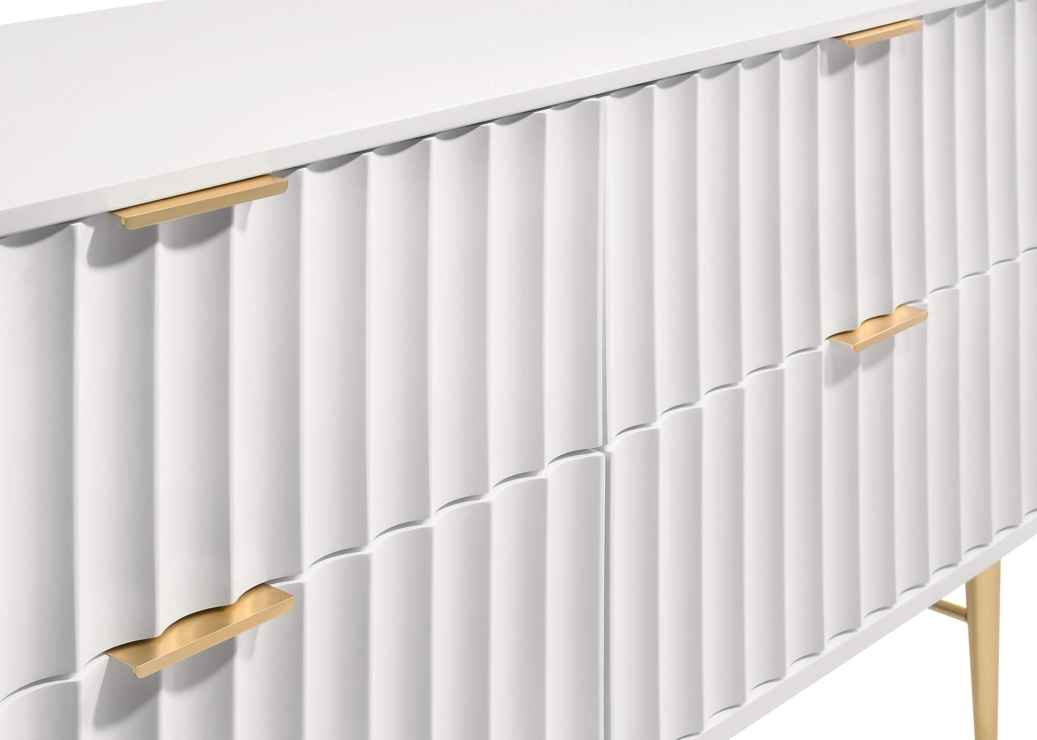 Embody industrialist style with this Modernist dresser in a white medium gloss finish. Utilitarian but sculptural in design, this piece features a ridged, textured look that is chic but sleek. It rests on brushed gold steel legs and has gold brushed handles for a bit of regality. Combine this piece with other items in the Modernist lineup for a cohesive finish to your room makeover.