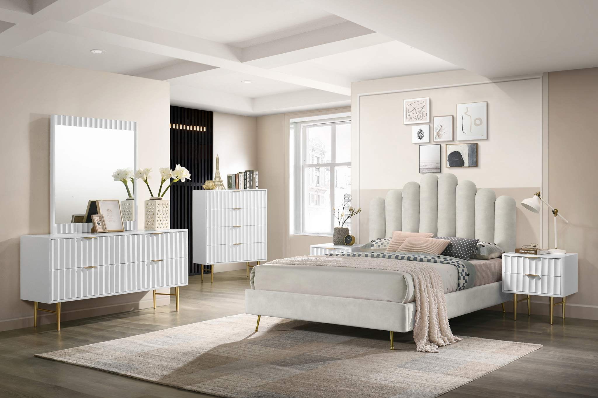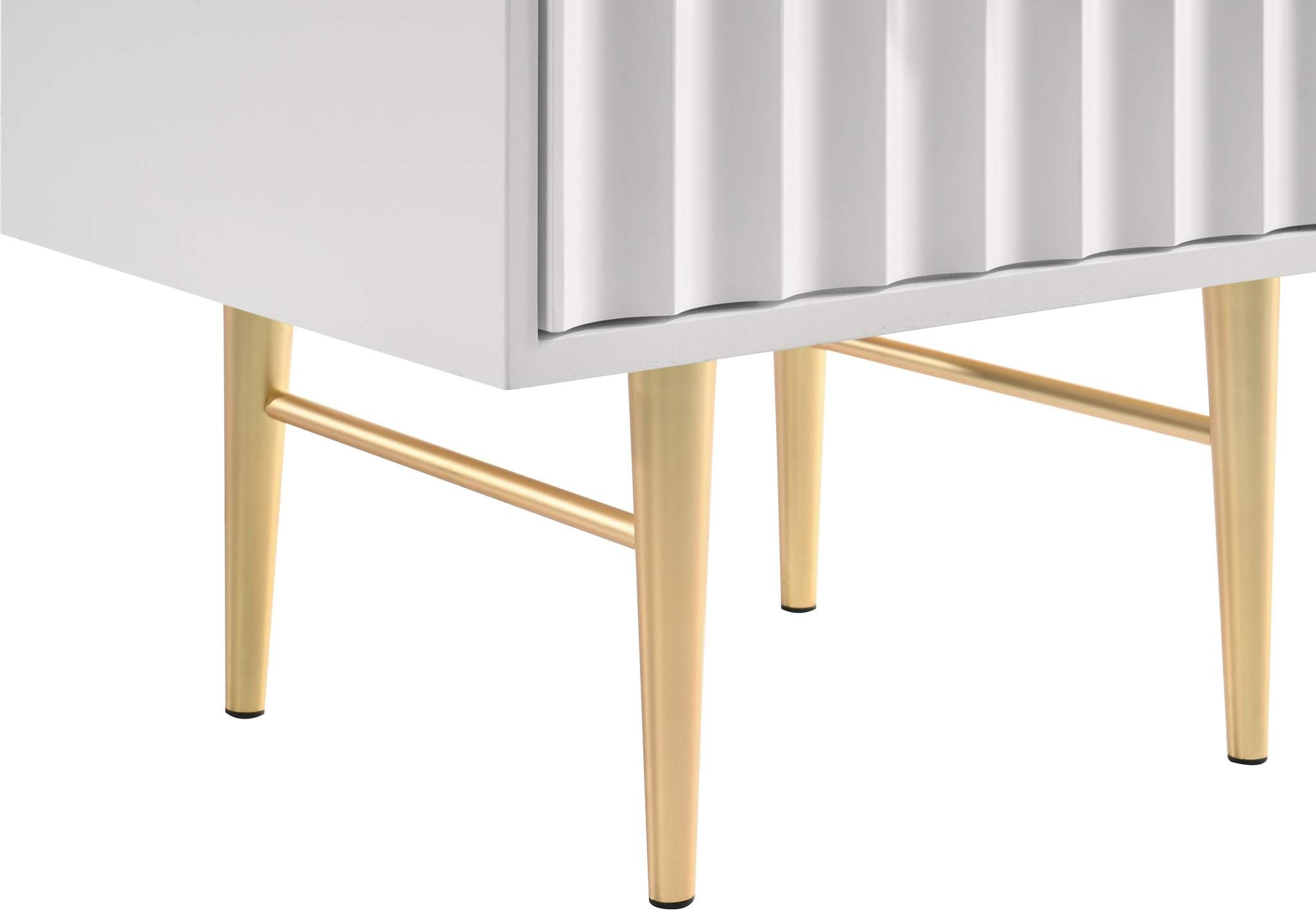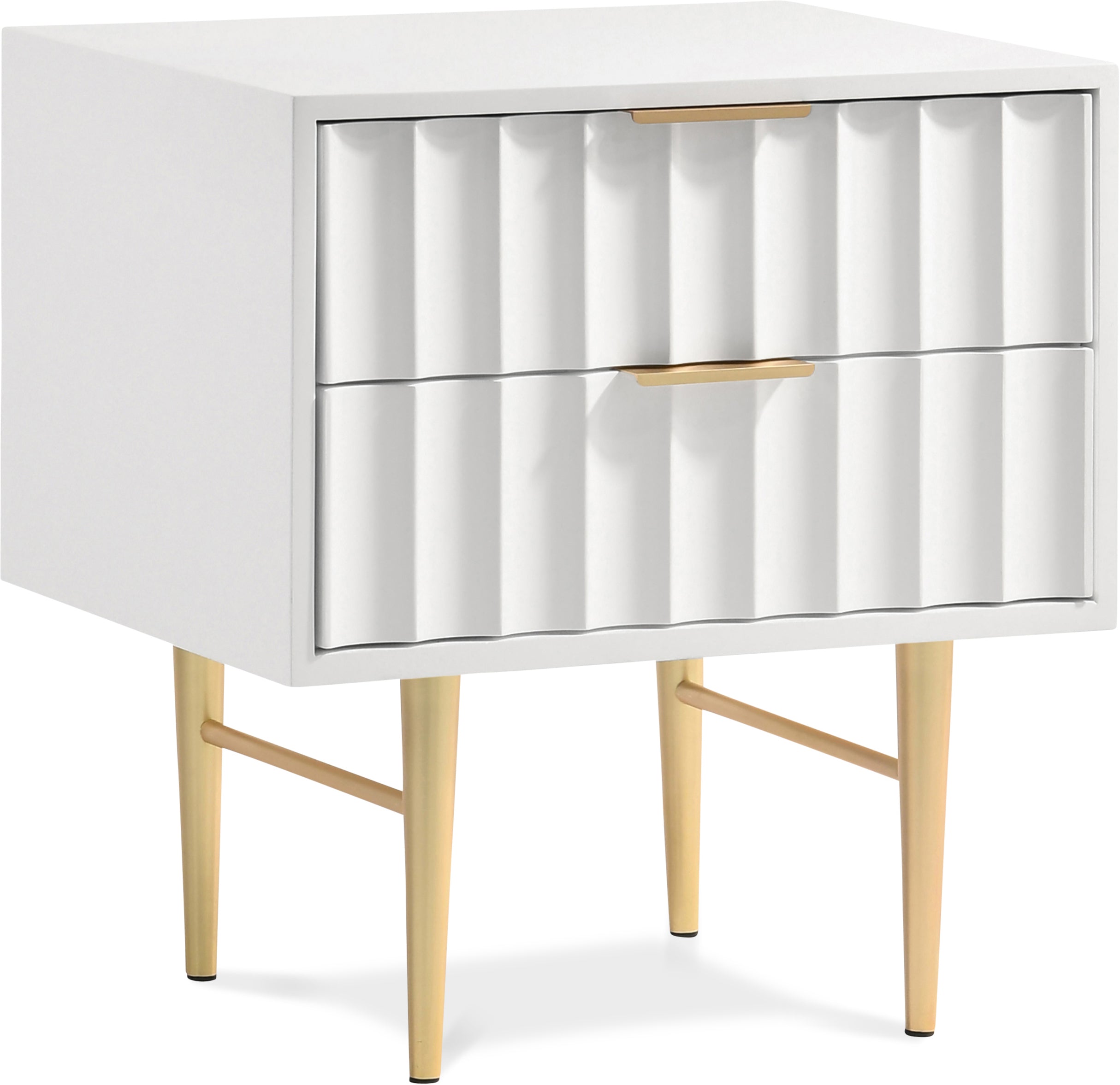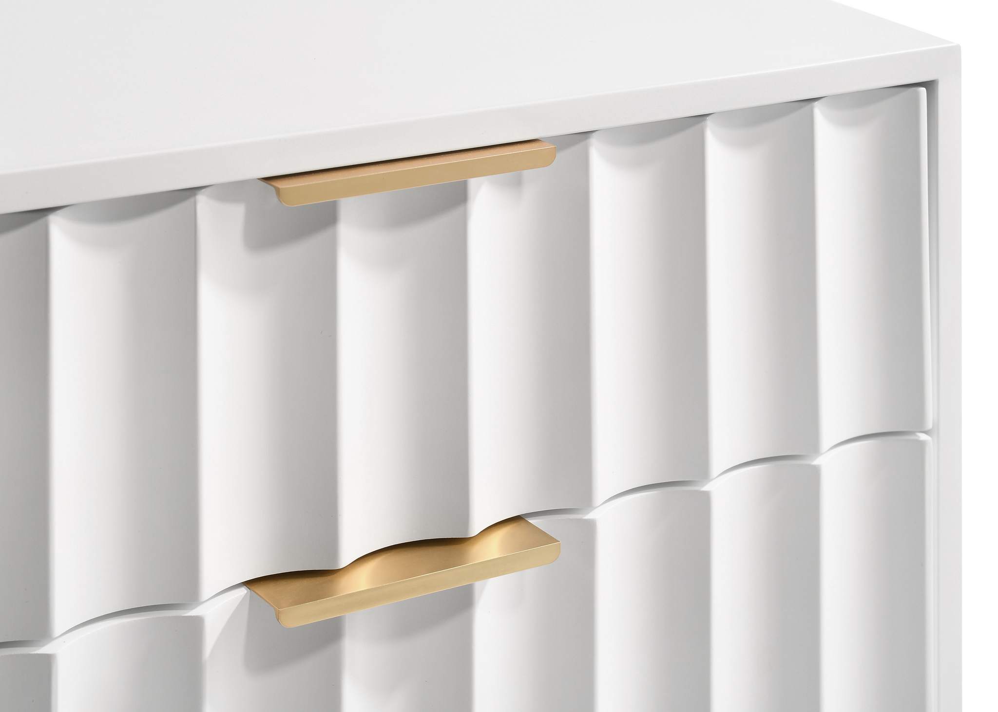 Embody industrialist style with this Modernist night stand in a white medium gloss finish. Utilitarian but sculptural in design, this piece features a ridged, textured look that is chic but sleek. It rests on brushed gold steel legs and has gold brushed handles for a bit of regality. Combine this piece with other items in the Modernist lineup for a cohesive finish to your room makeover.
