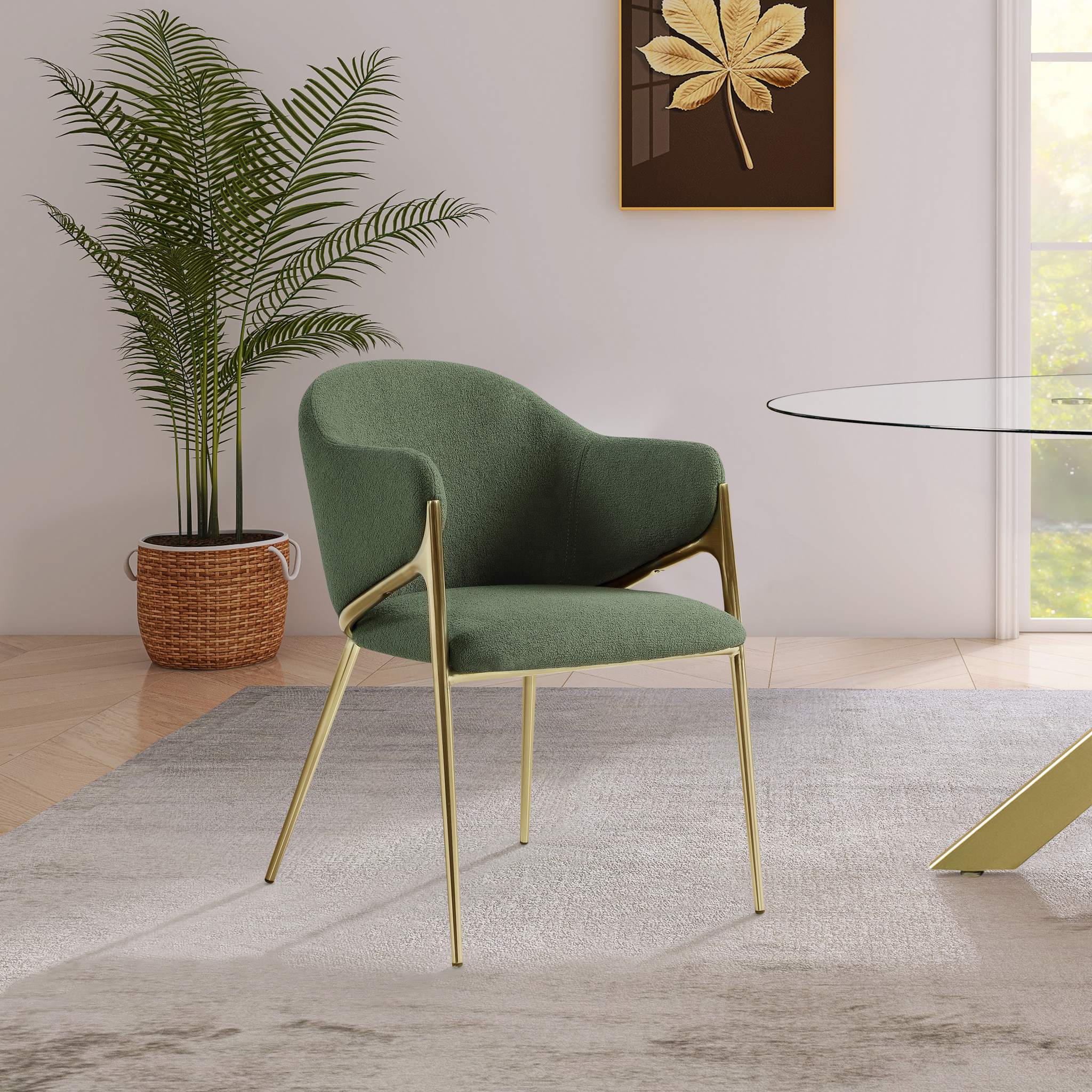 Pair this Nial boucle fabric dining chair and your modish sensibilities for a contemporary look that turns heads from every angle. This beautiful chair offers everything you'd want in a midcentury modern design, from its rich green boucle fabric and heavily padded seat and back to its iron frame and its brushed brass finish. Integrate this chair with the dining table of your choice to elevate the dining experience to a new, modern level.