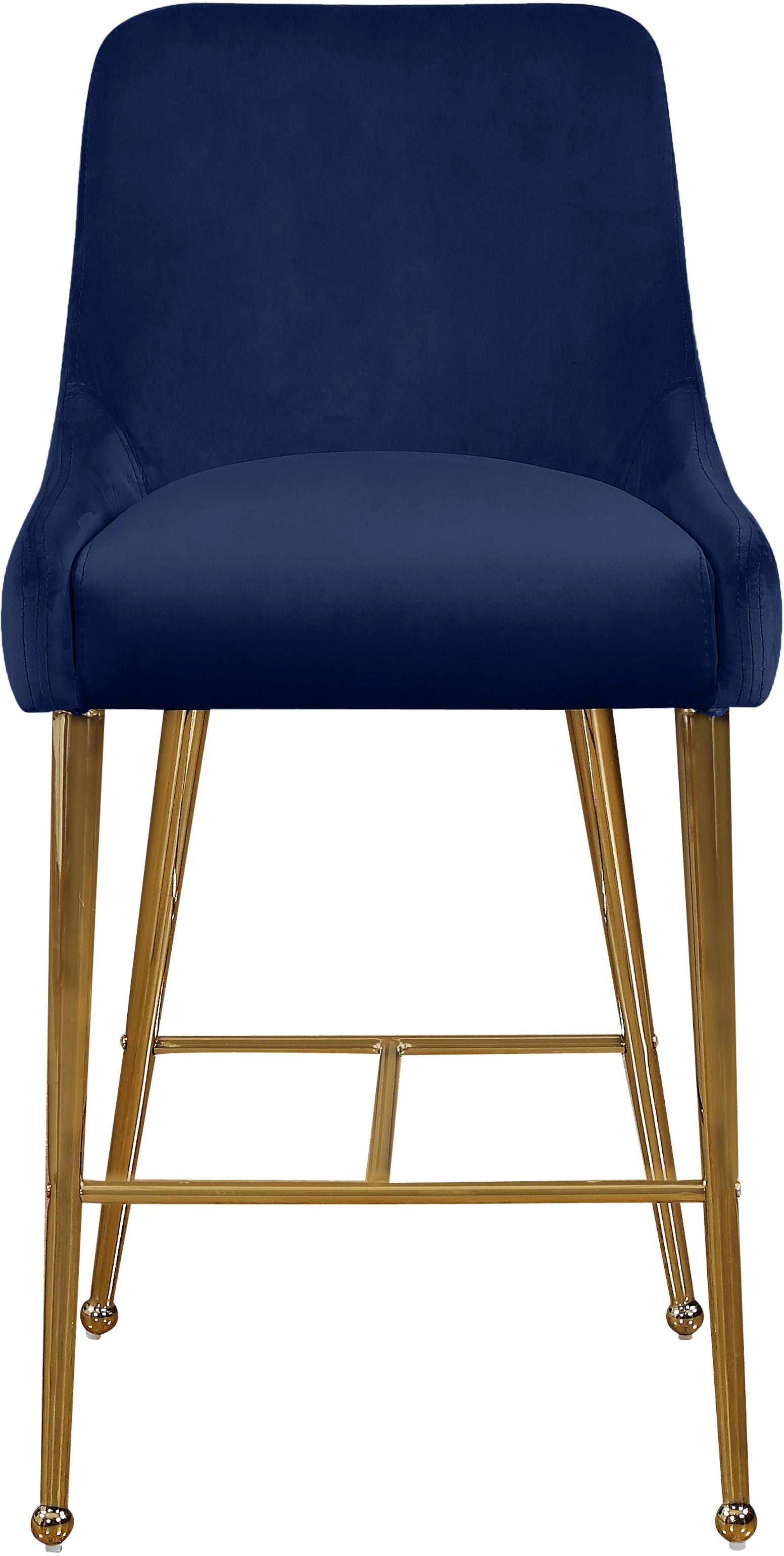 The home bar or kitchen counter gets a contemporary makeover with the addition of this Owen Navy Velvet Stool. Clean lines and a simple design make this stool nothing short of elegant. The navy velvet upholstery is sleek and svelte to the touch, revving up the comfort factor of this stunning stool. The polished gold legs have a ball design that's both modern and sophisticated, while a matching handle on the back adds to the overall modish feel of this delightful stool.