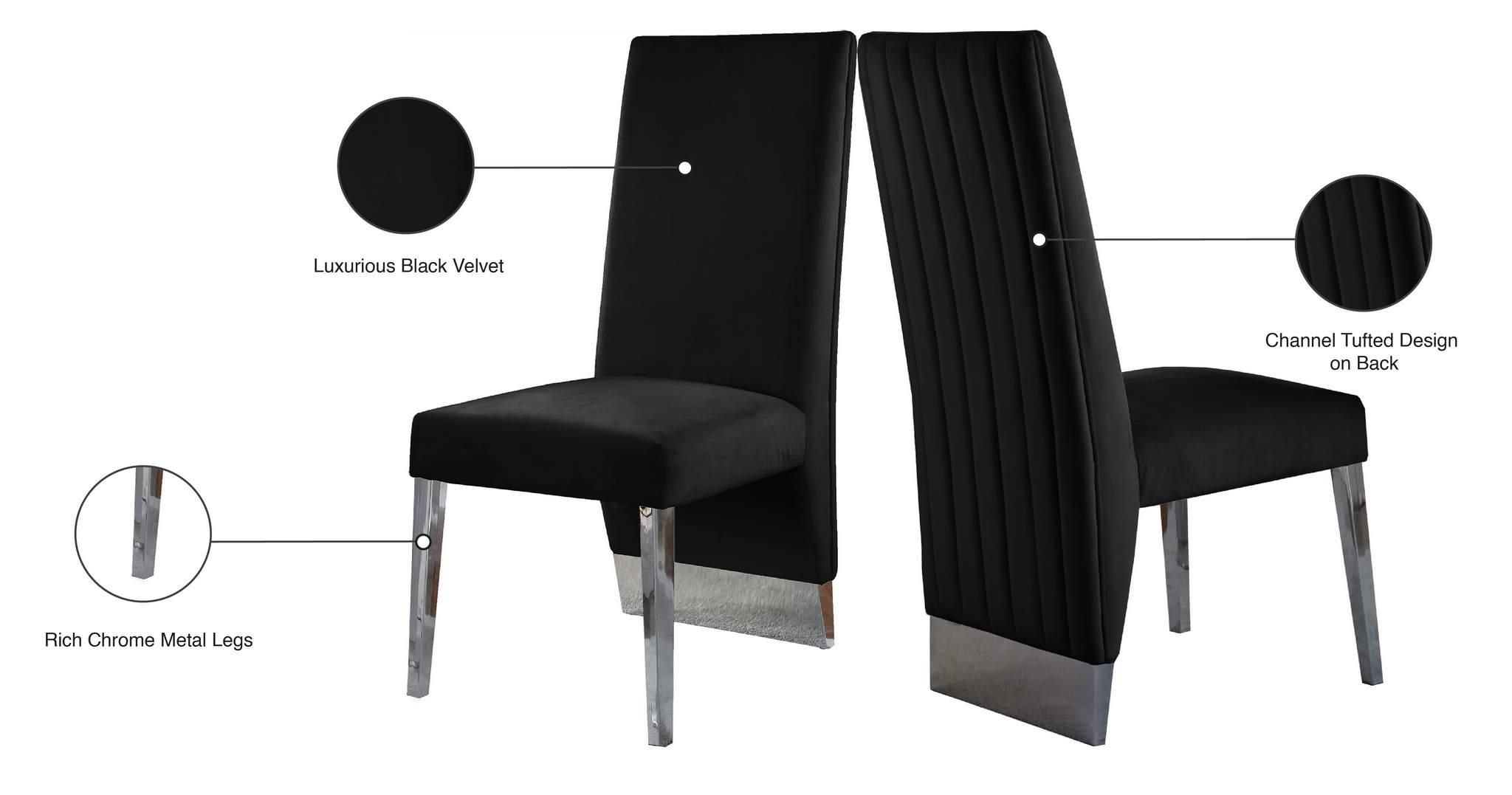 Set the standard for elegance in your dining room with this Porsha Dining Chair. A high back design with a slight slant creates an enviable silhouette and air of sophistication. Velvet upholstery in a rich shade of black adds to the beautiful look of this exquisite chair. Channel tufting keeps the soft padding of the chair aloft, so it retains its comfort factor through repeat use. Chrome metal legs finish up the design, providing sturdy support and a modern edge.