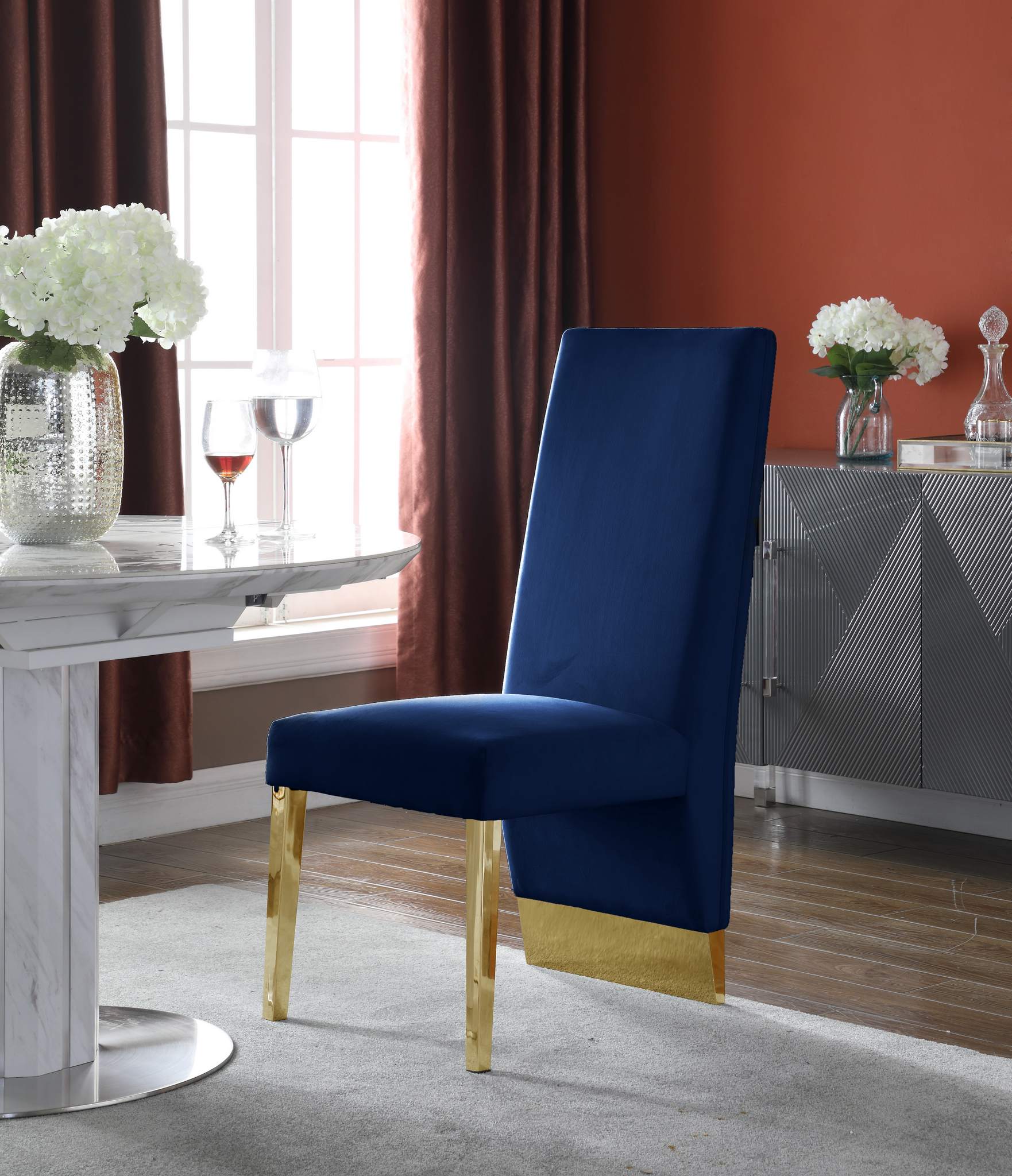 Bring the luxe look of this Porsha chair to your dining space. Impressing guests is simple when they're seated in this chair. The floor-length back is elegantly beautiful and creates a striking silhouette from every angle. Velvet upholstery material in a sophisticated hue of navy adds a touch of modernity to this chair, and the reverse is channel tufted for added elegance and refinement. Gold legs complete the look for added contemporary panache and sturdy support.