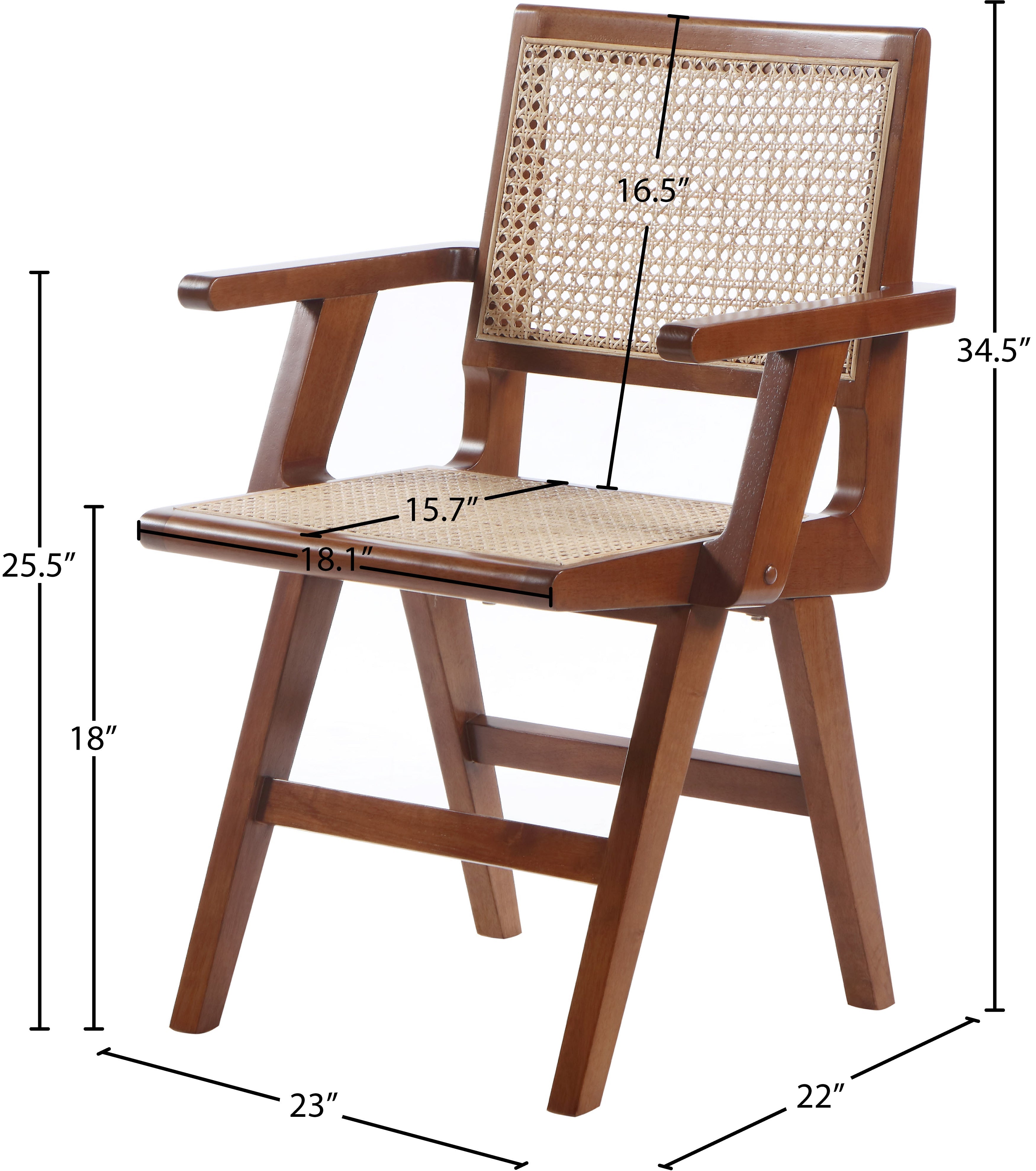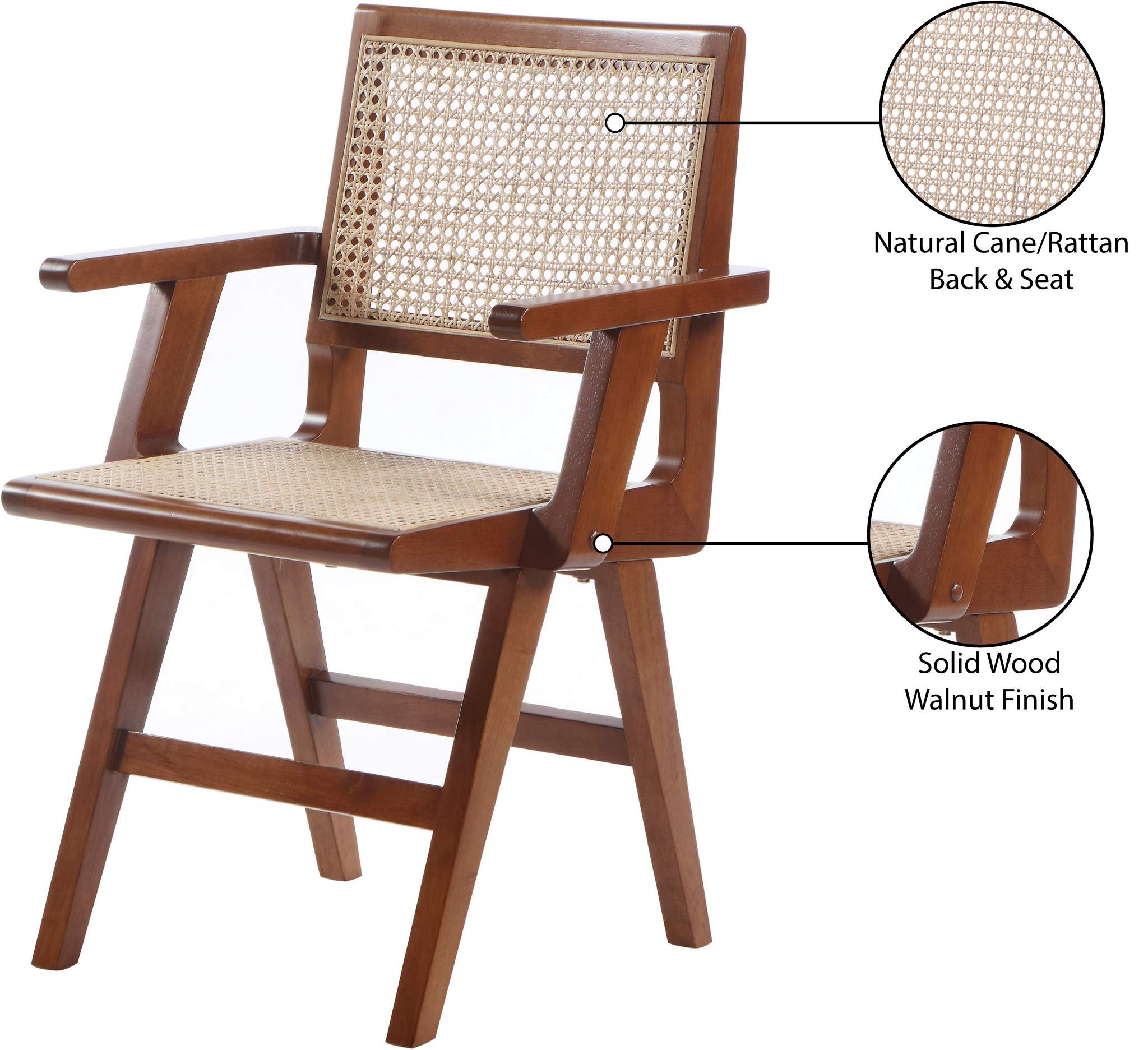 Feel like a star as you dine in this unique dining chair from Meridian Furniture's Preston collection. Featuring a frame crafted from rubber wood with walnut finish and a natural cane/rattan back and seat, this chair is as stylish as it is comfortable. Its Mid-Century design fits in with a wide array of furnishings, and its walnut finish complements most decor. Arm rests provide support for your arms so you can relax while you eat.
