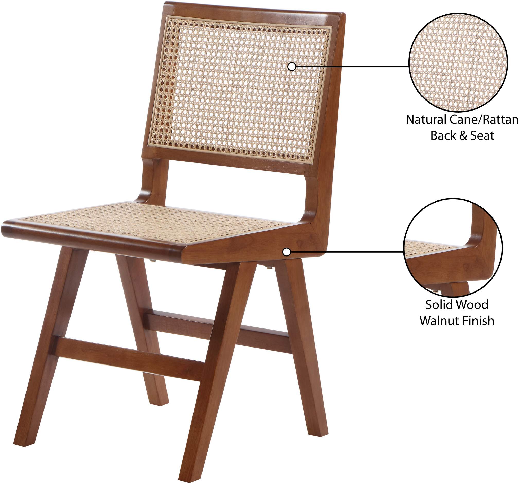 Feel like a star as you dine in this unique dining chair from Meridian Furniture's Preston collection. Featuring a frame crafted from rubber wood with walnut finish and a natural cane/rattan back and seat, this chair is as stylish as it is comfortable. Its Mid-Century design fits in with a wide array of furnishings, and its walnut finish complements most decor.
