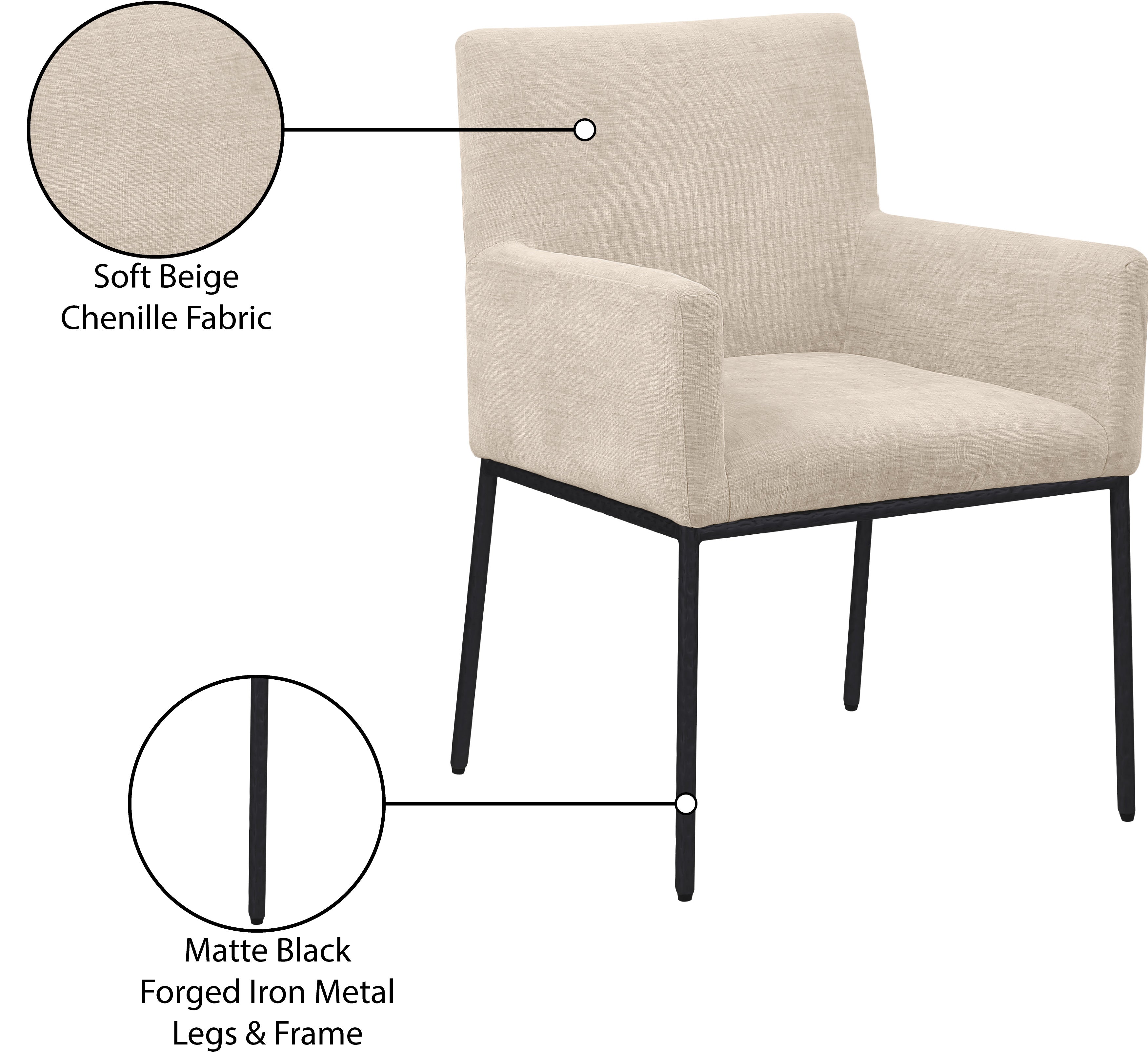 Casual comfort is the order of the day when dinner guests relax from the cozy confines of this Reeves soft beige chenille fabric dining chair. Sumptuously padded arms, back, and seat ensure total comfort from appetizers through dessert, and the neutral, solid-colored upholstered makes it easy to pair this dining chair with the table of your choice. An all-metal matte black frame and legs lend a contemporary finish and impeccable sturdiness and strength for long-term enjoyment.