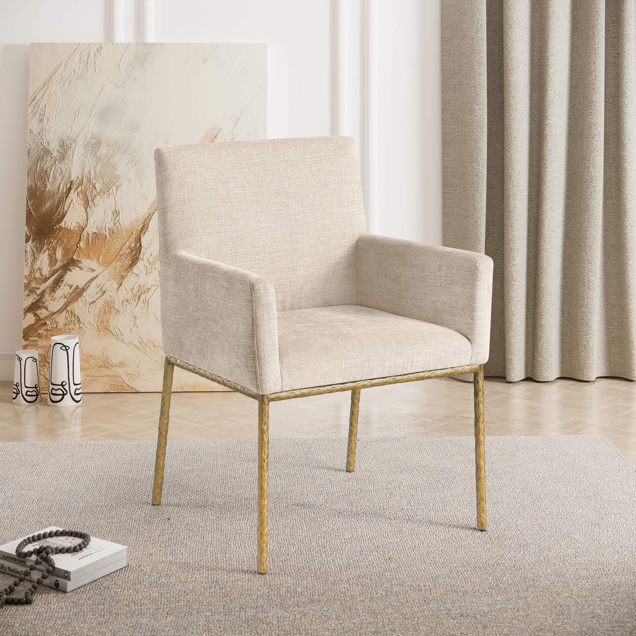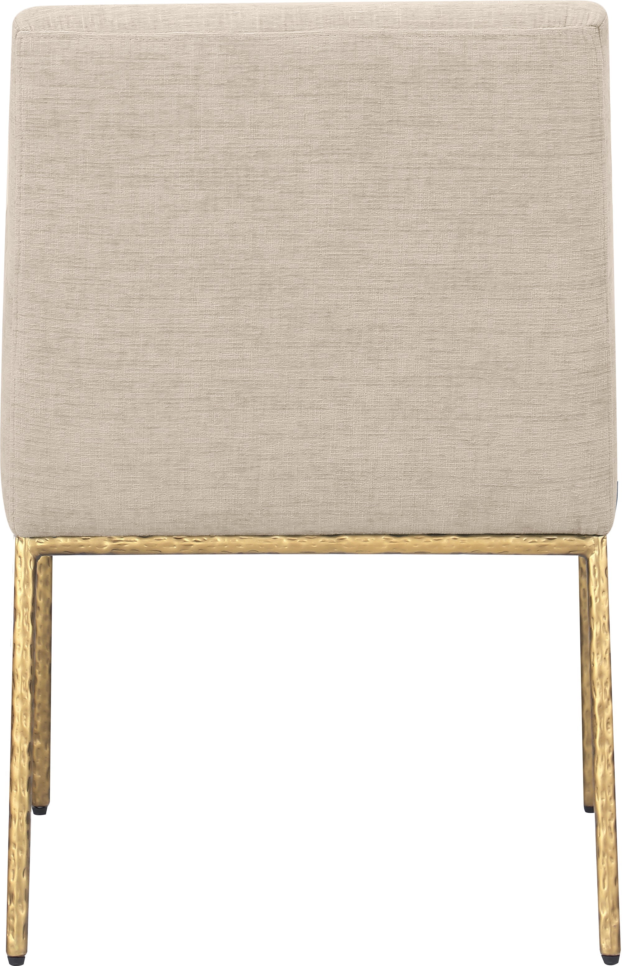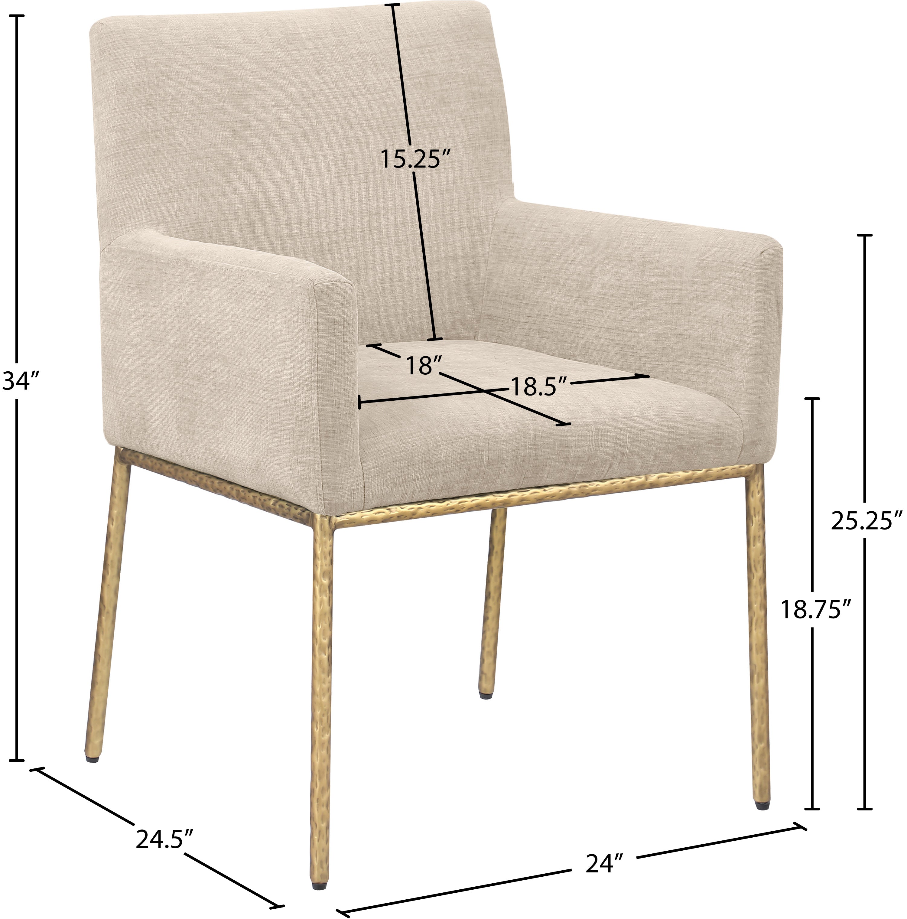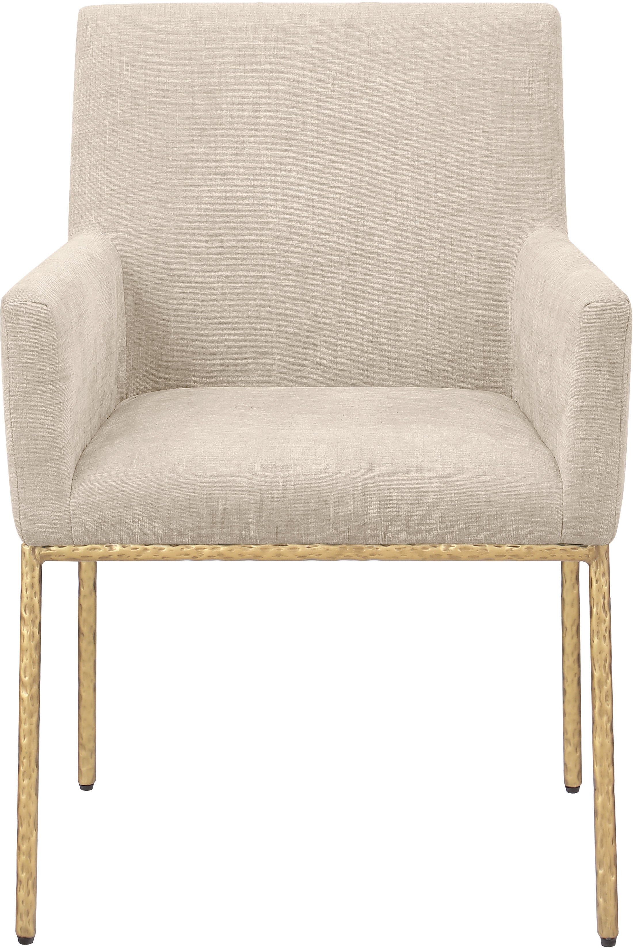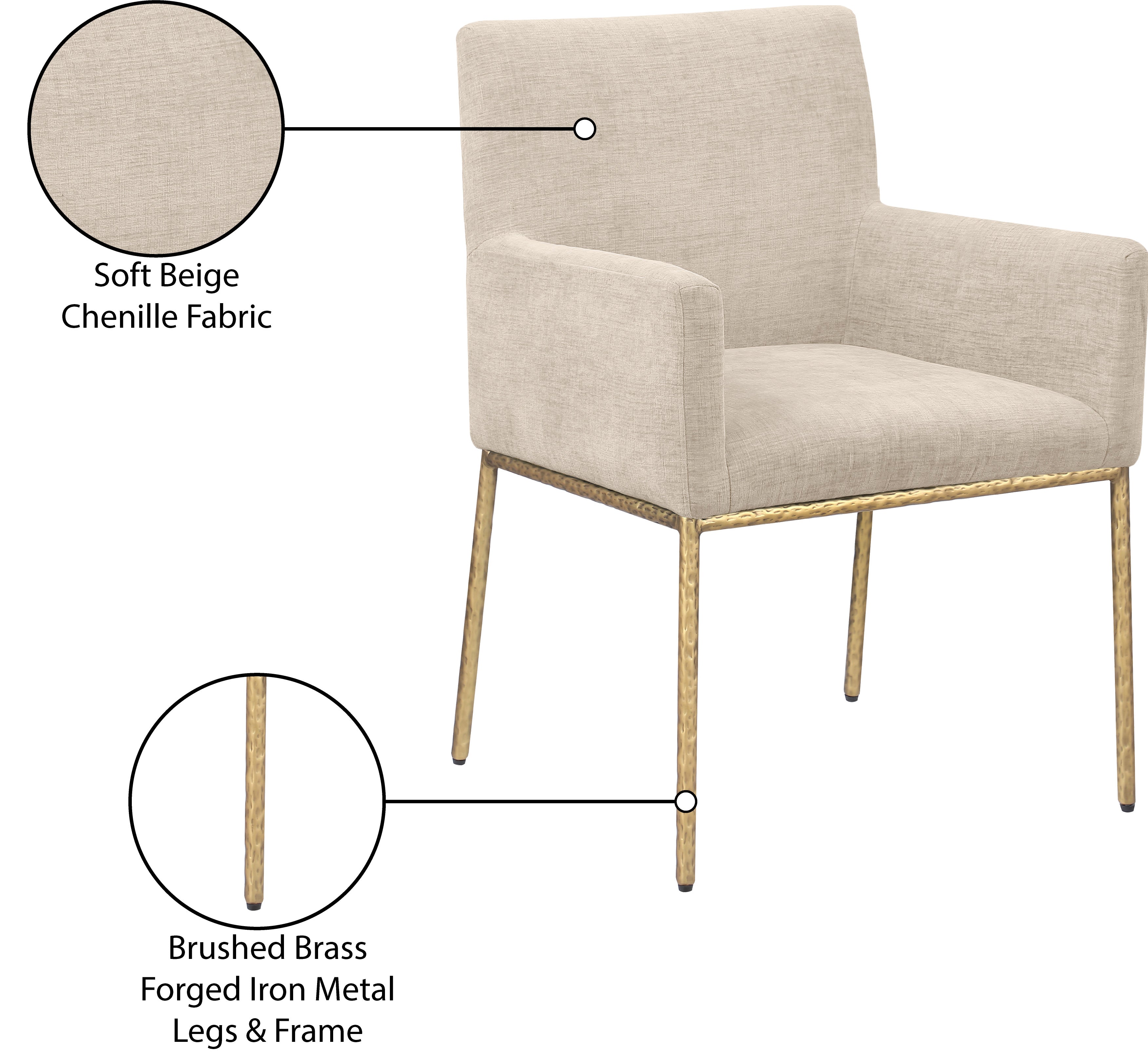 Casual comfort is the order of the day when dinner guests relax from the cozy confines of this Reeves soft beige chenille fabric dining chair. Sumptuously padded arms, back, and seat ensure total comfort from appetizers through dessert, and the neutral, solid-colored upholstered makes it easy to pair this dining chair with the table of your choice. An all-metal brushed brass frame and legs lend a contemporary finish and impeccable sturdiness and strength for long-term enjoyment.