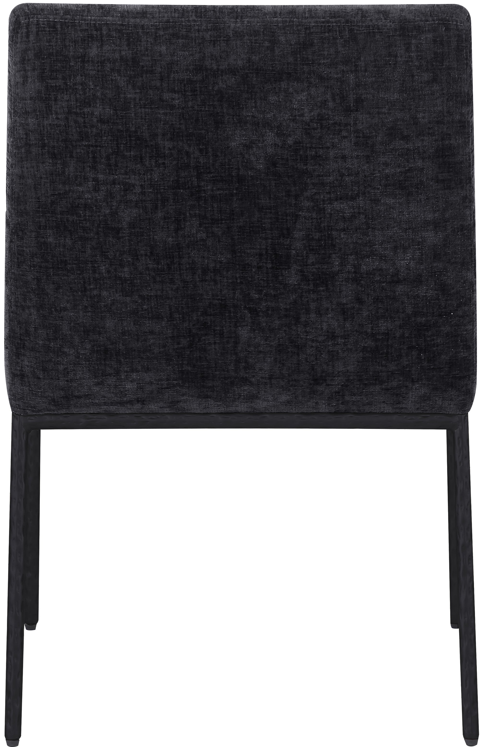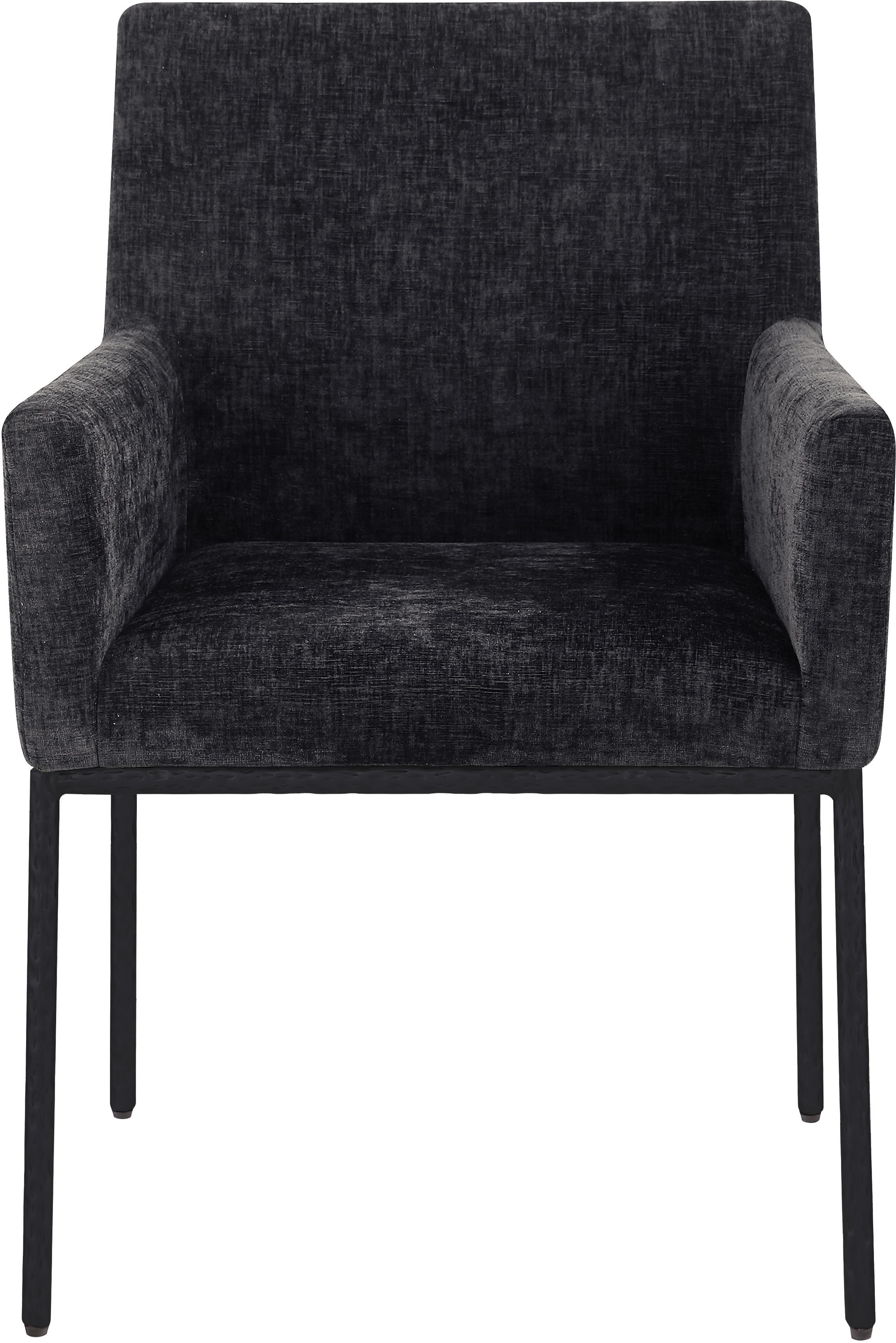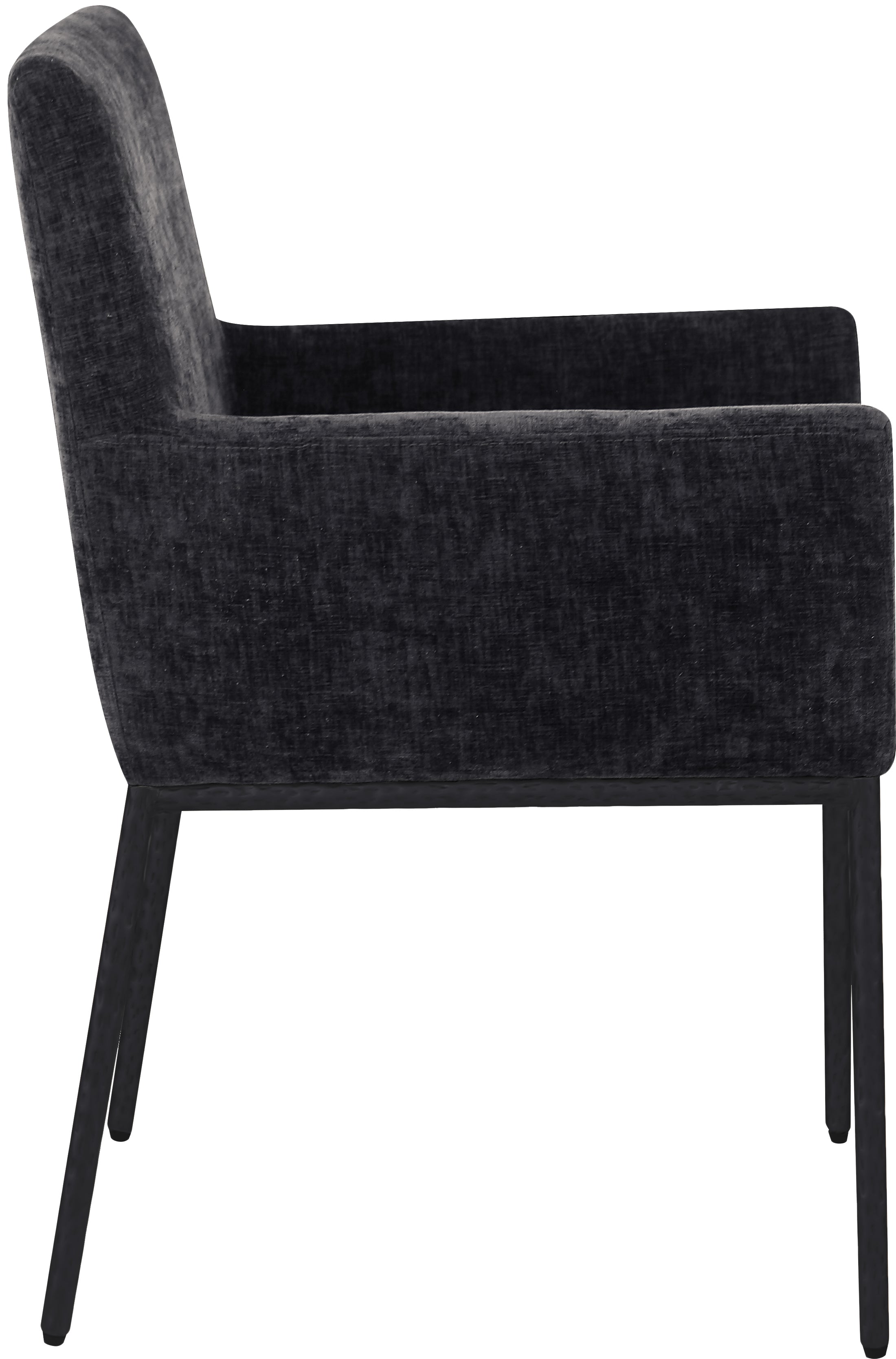 Casual comfort is the order of the day when dinner guests relax from the cozy confines of this Reeves soft black chenille fabric dining chair. Sumptuously padded arms, back, and seat ensure total comfort from appetizers through dessert, and the neutral, solid-colored upholstered makes it easy to pair this dining chair with the table of your choice. An all-metal matte black frame and legs lend a contemporary finish and impeccable sturdiness and strength for long-term enjoyment.