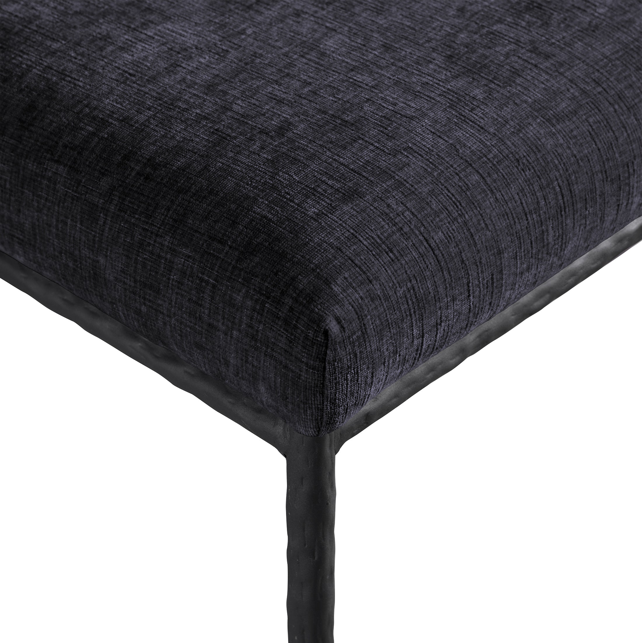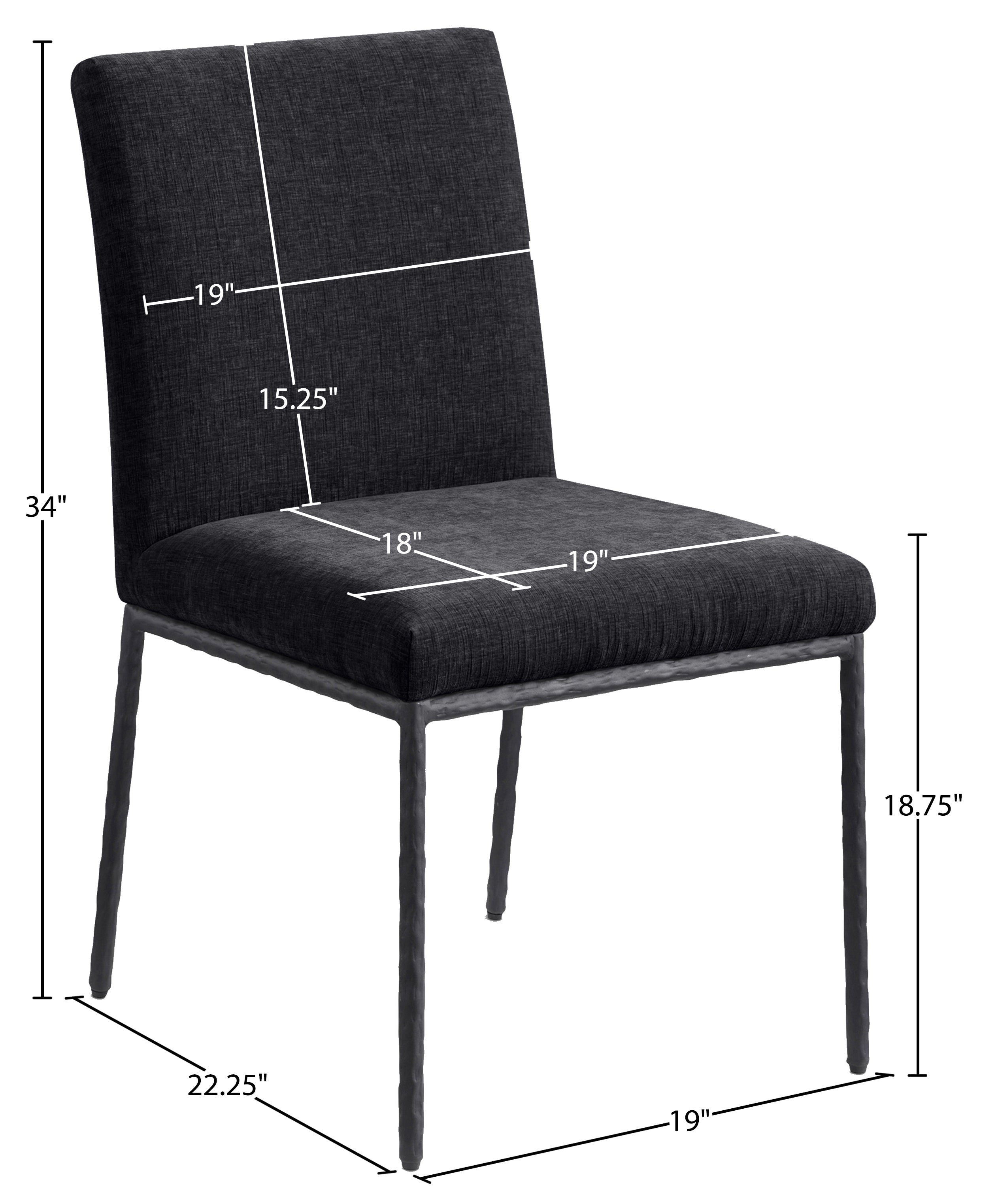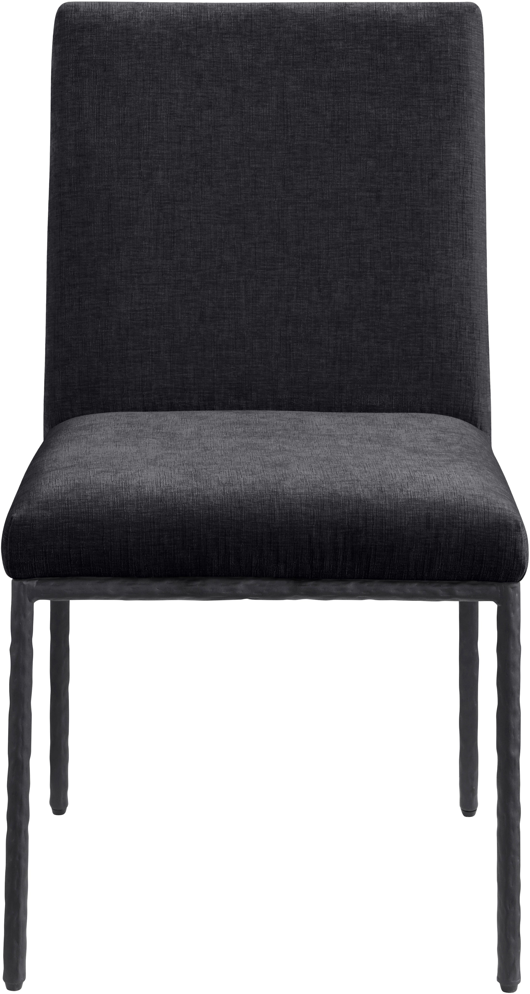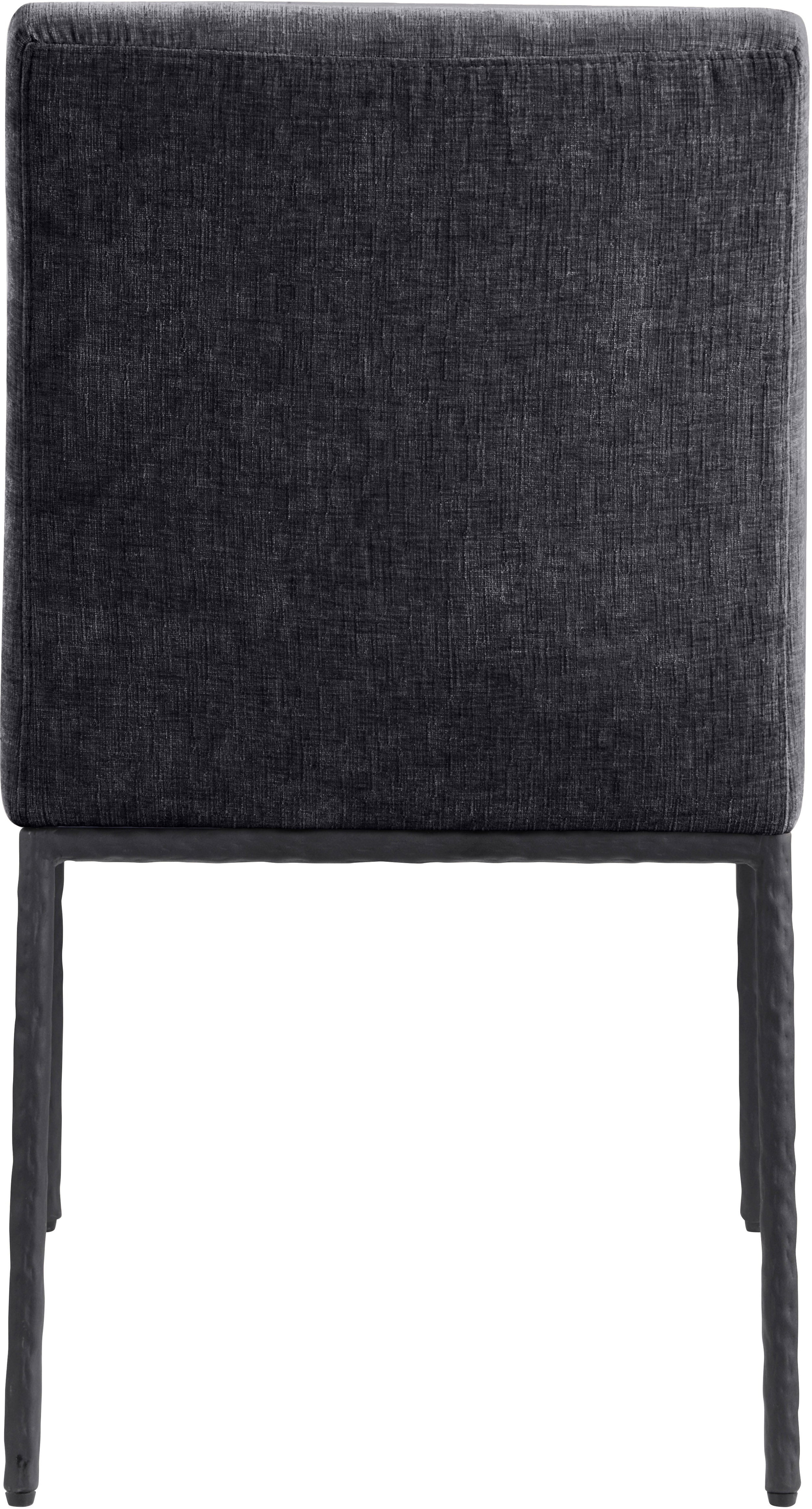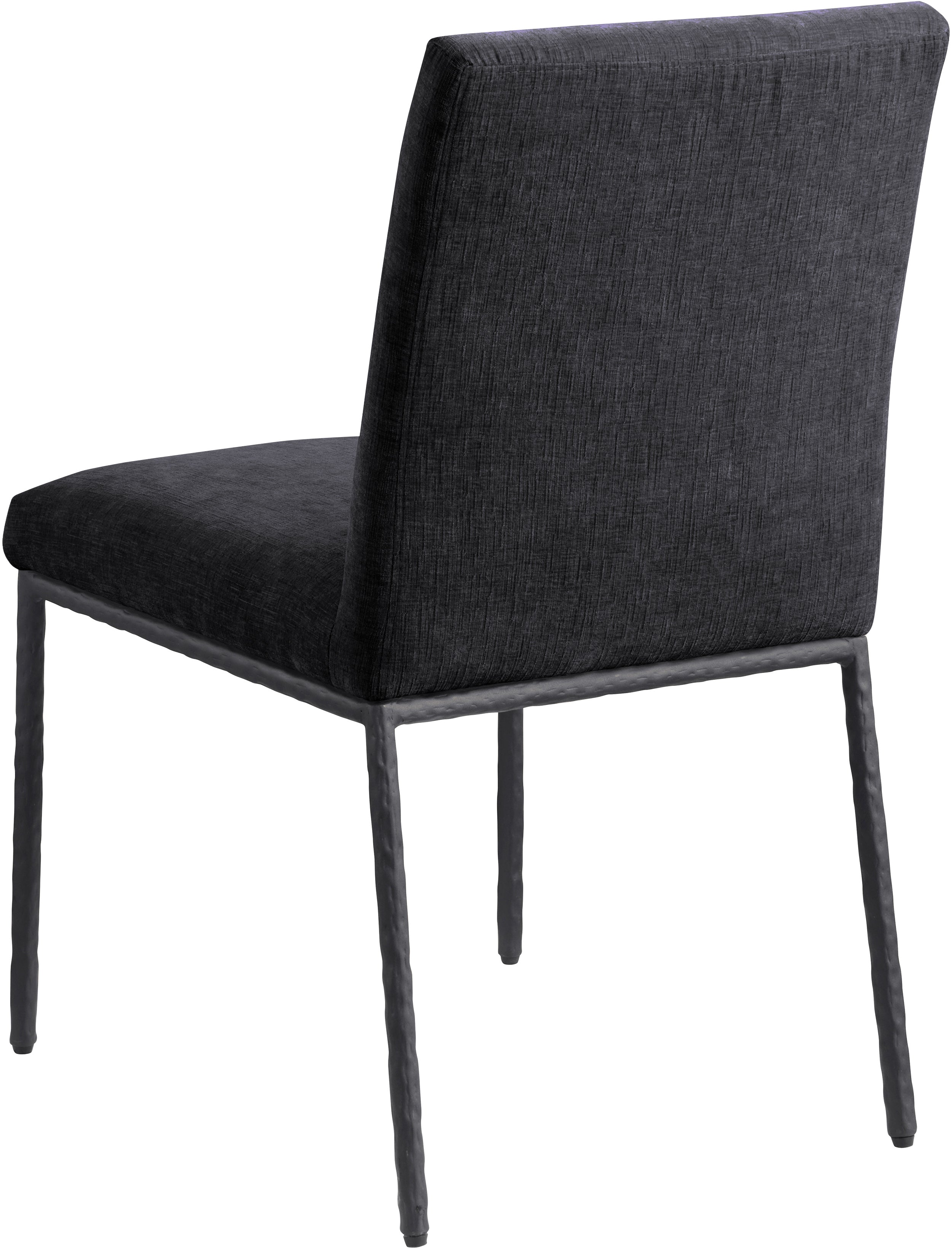 With an effortless sophistication, the Reeves black chenille fabric upholstered dining side chair elevates your dining space with its soft fabric and elegantly textured design. Supported by sturdy, hand-forged matte black metal legs, this chair blends refined comfort with artisanal craftsmanship. Its clean silhouette and plush upholstery make it a perfect addition to modern and transitional interiors, offering both style and everyday functionality.