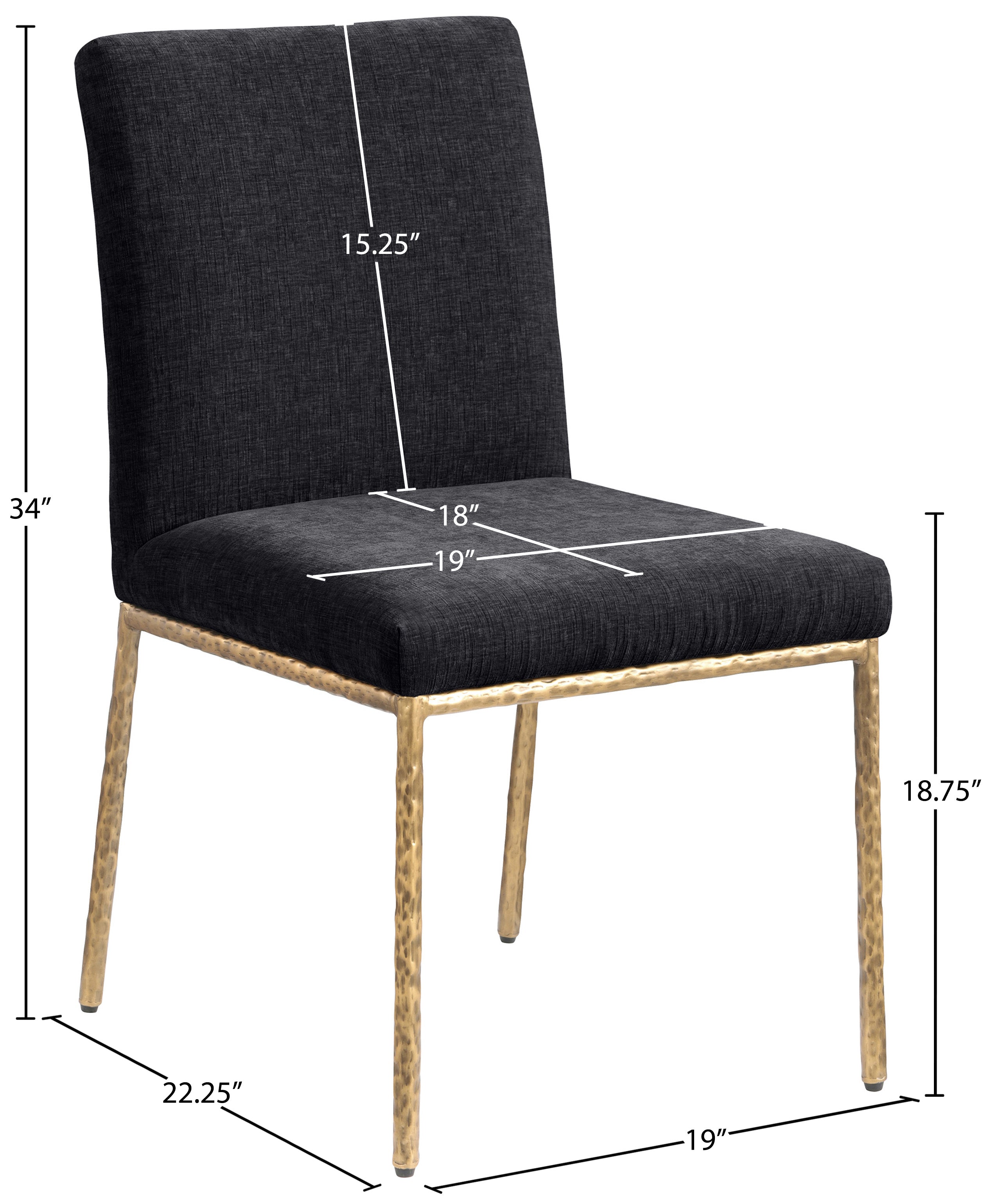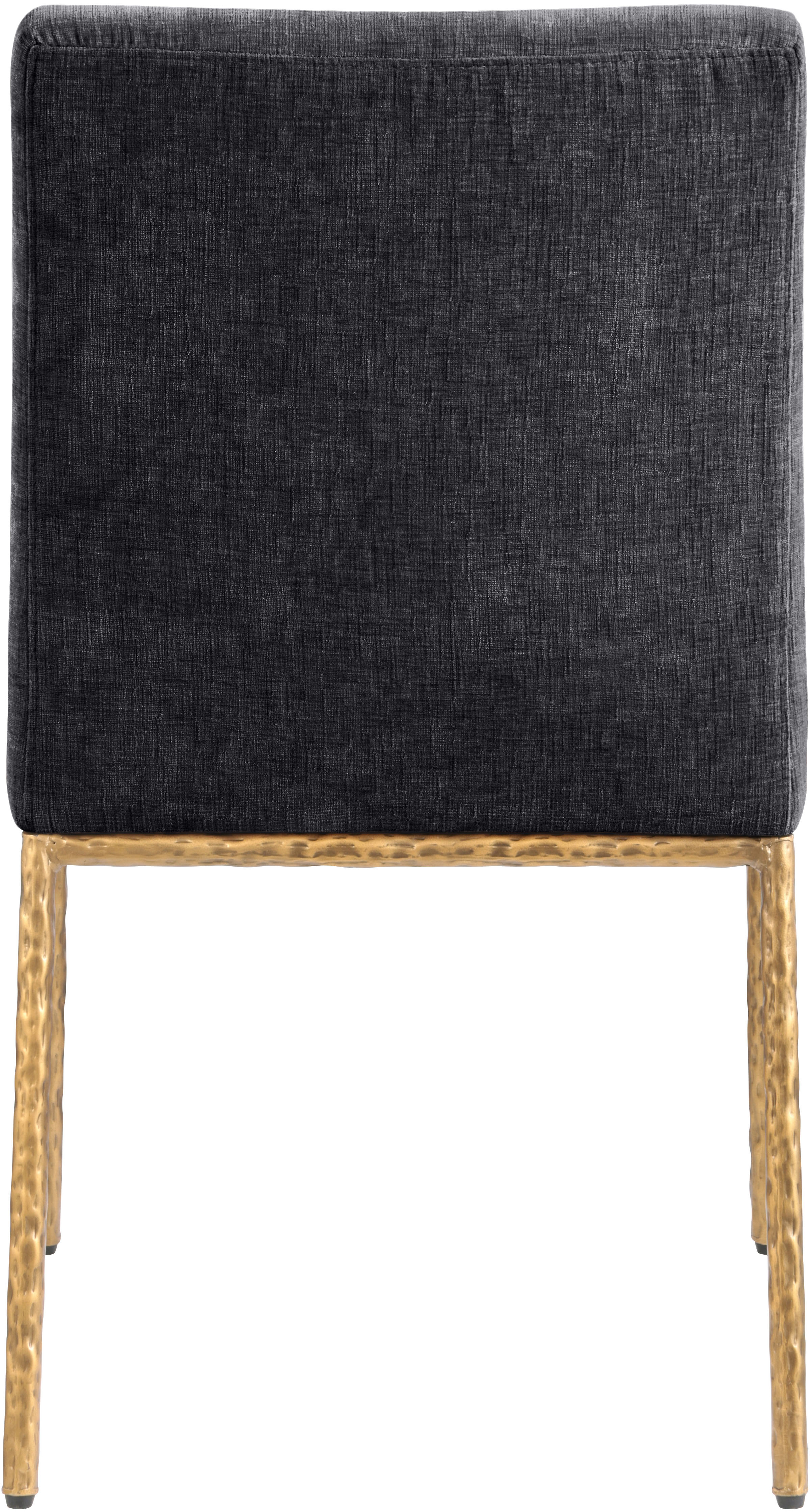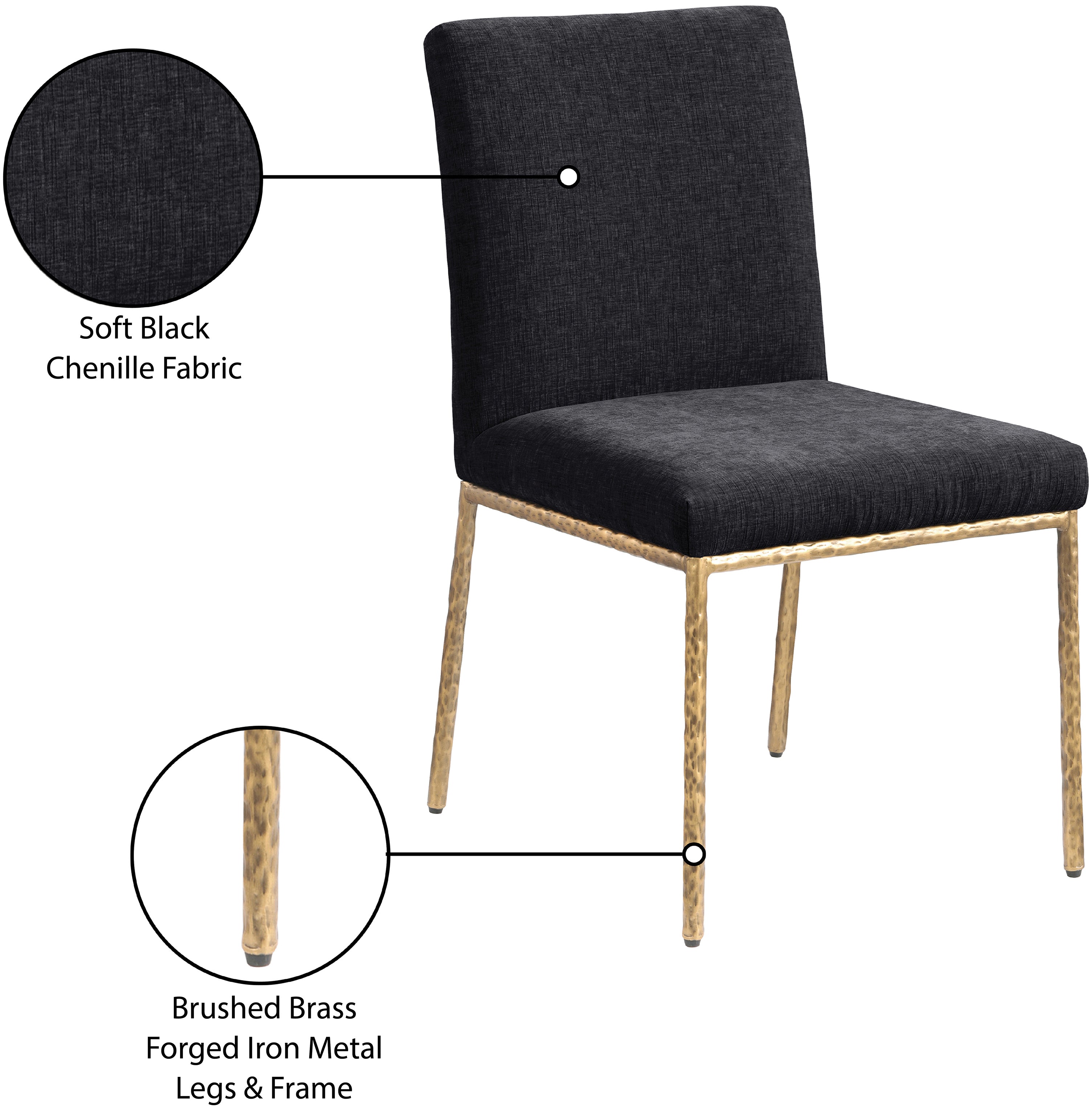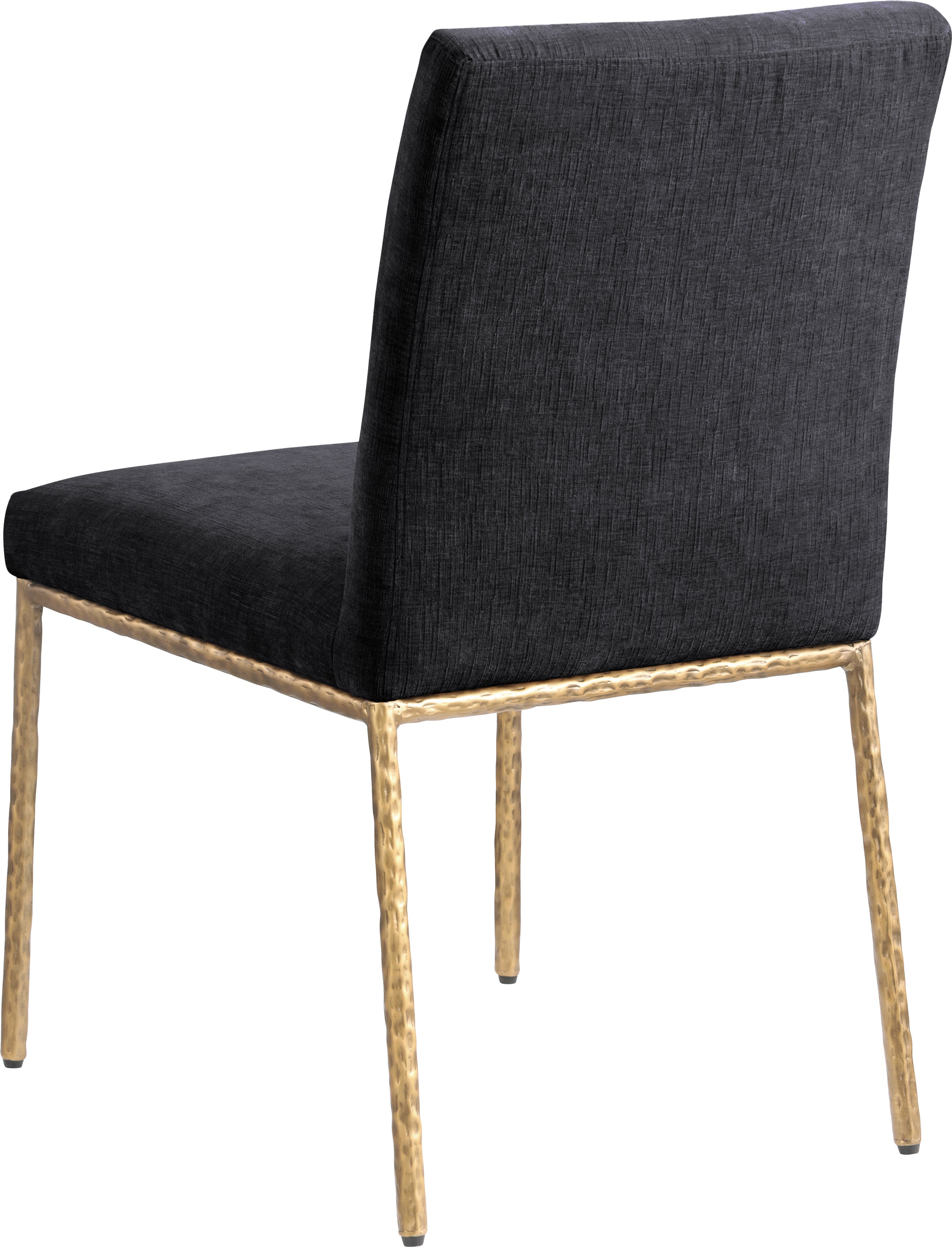 With an effortless sophistication, the Reeves black chenille fabric upholstered dining side chair elevates your dining space with its soft fabric and elegantly textured design. Supported by sturdy, hand-forged brushed brass metal legs, this chair blends refined comfort with artisanal craftsmanship. Its clean silhouette and plush upholstery make it a perfect addition to modern and transitional interiors, offering both style and everyday functionality.