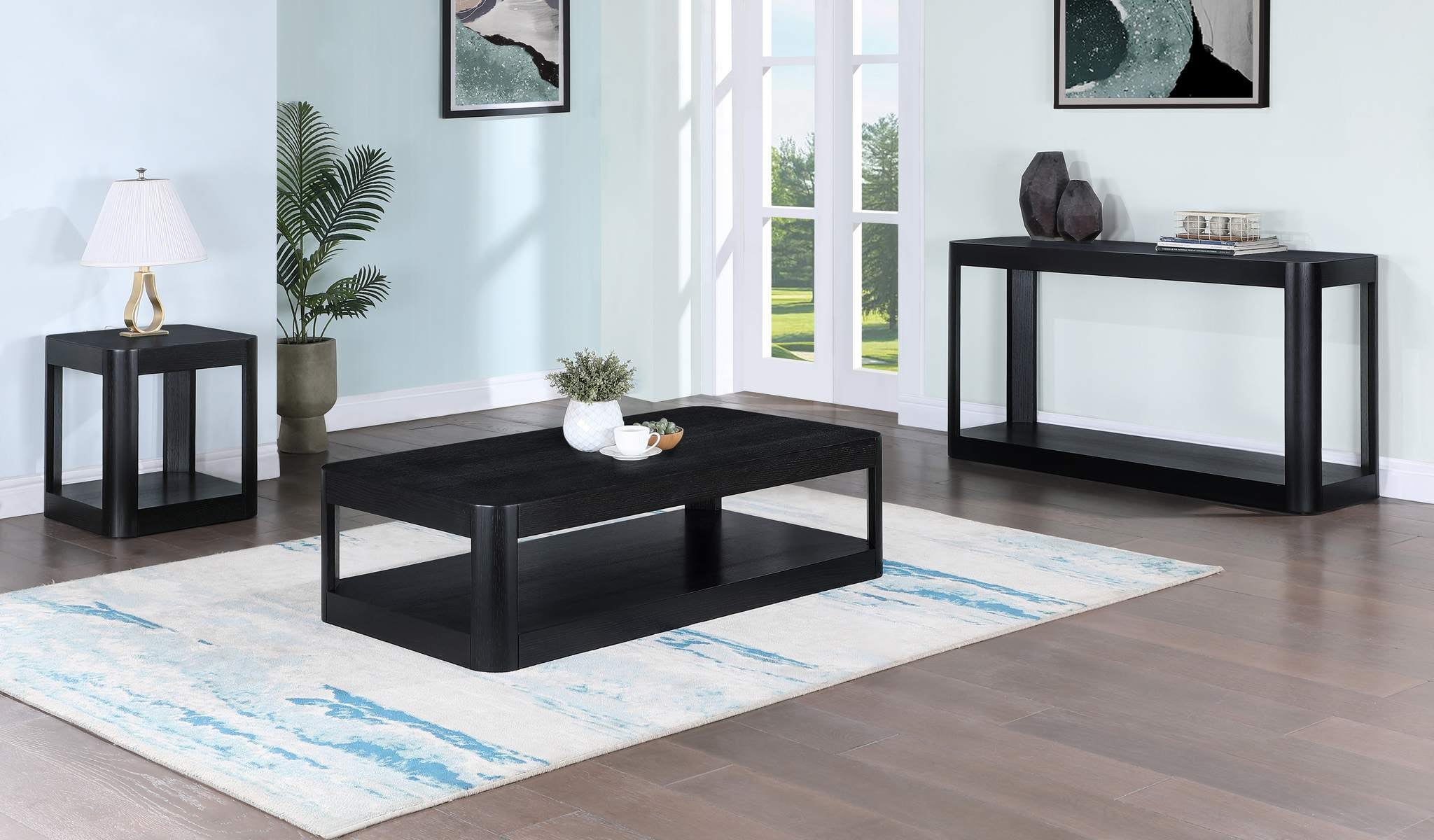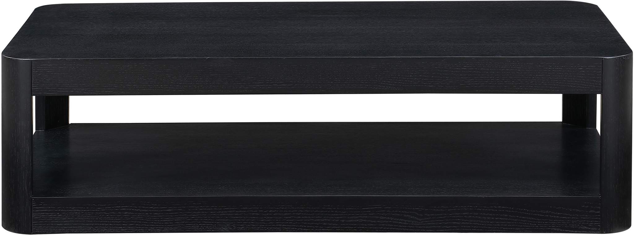 Bring home the Reeves Black Coffee Table to give your room a fresh new look. This art deco coffee table features a sleek design with rounded corners and a bottom shelf ideal for storing items you use most handily nearby. Oak veneer and solid wood with MDF construction give the table a sturdy demeanor, so it holds up to use by your busy family. A chic black finish and natural wood grain variation ensures that this coffee table blends nicely with existing decor in your modern home.