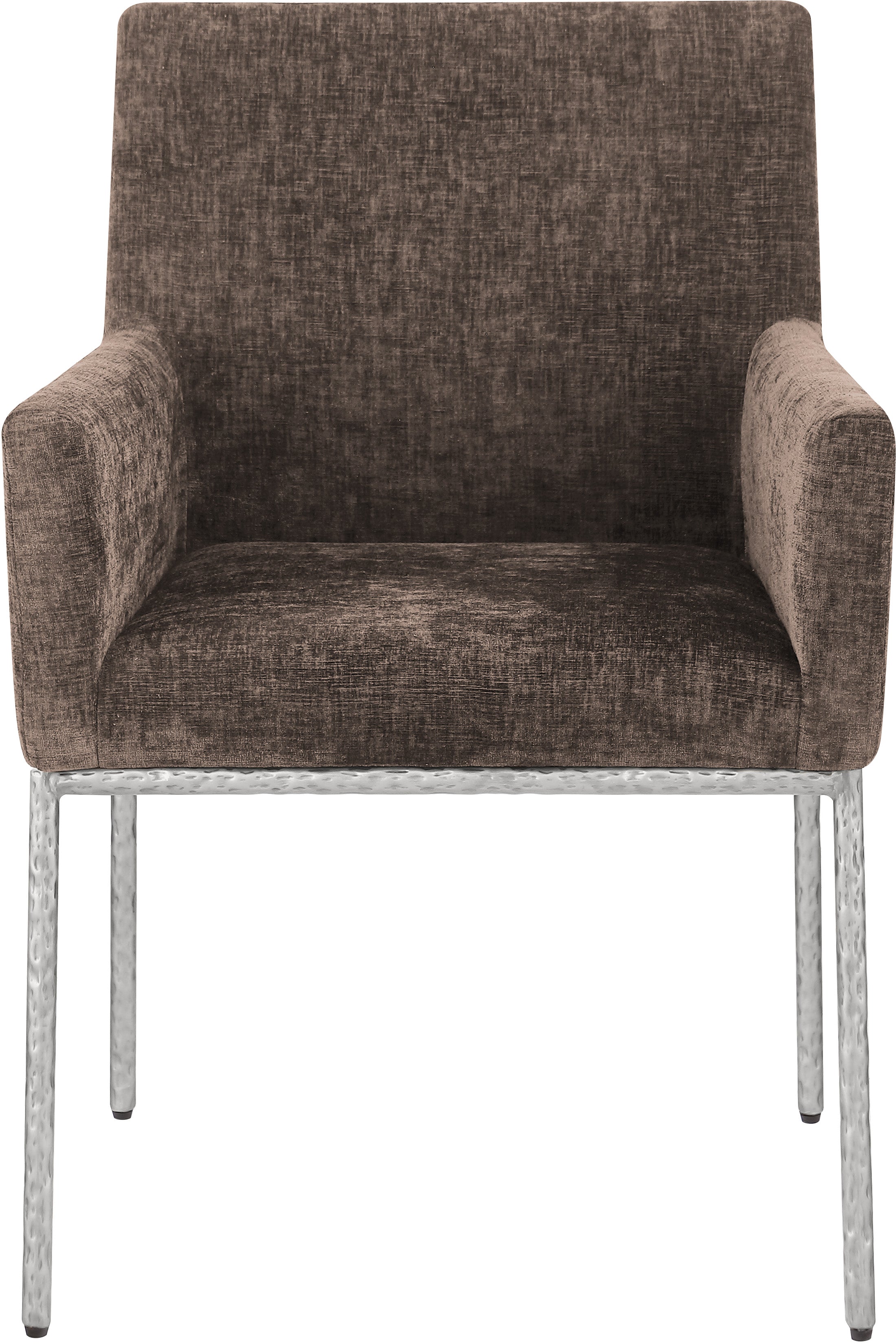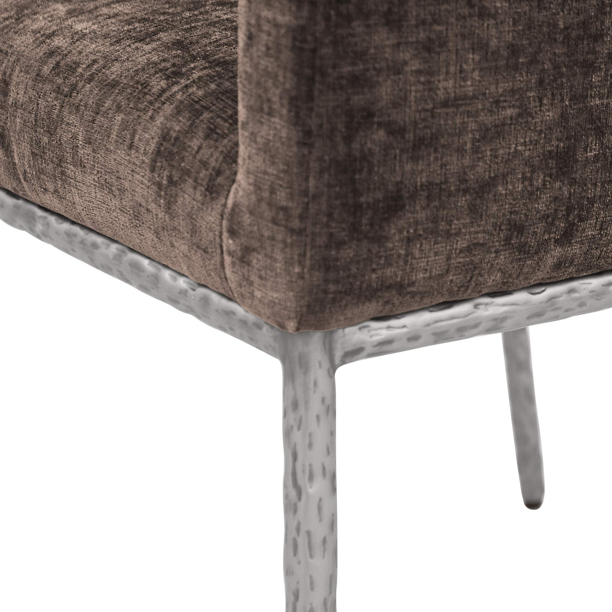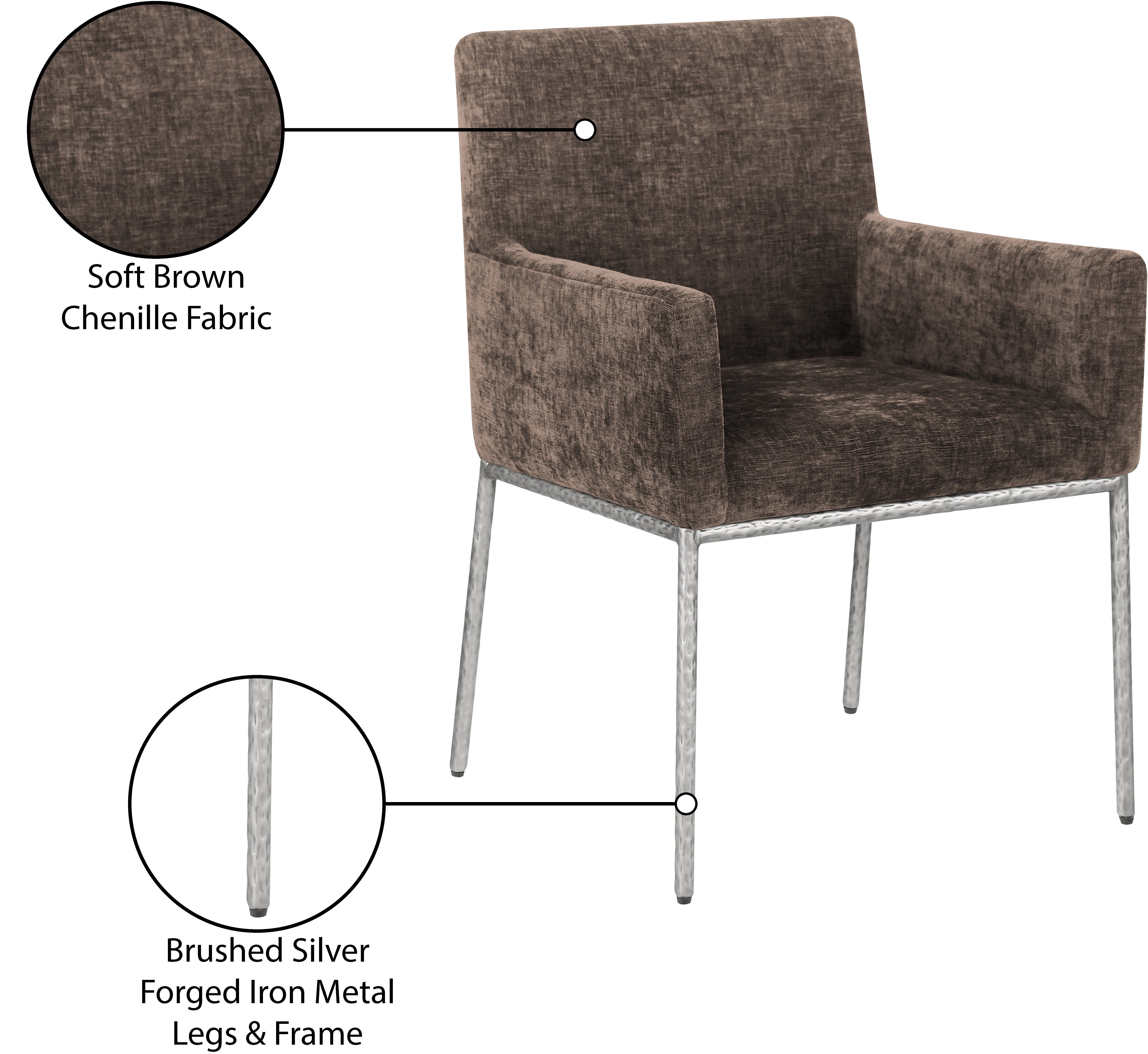 Casual comfort is the order of the day when dinner guests relax from the cozy confines of this Reeves soft brown chenille fabric dining chair. Sumptuously padded arms, back, and seat ensure total comfort from appetizers through dessert, and the neutral, solid-colored upholstered makes it easy to pair this dining chair with the table of your choice. An all-metal brushed silver frame and legs lend a contemporary finish and impeccable sturdiness and strength for long-term enjoyment.
