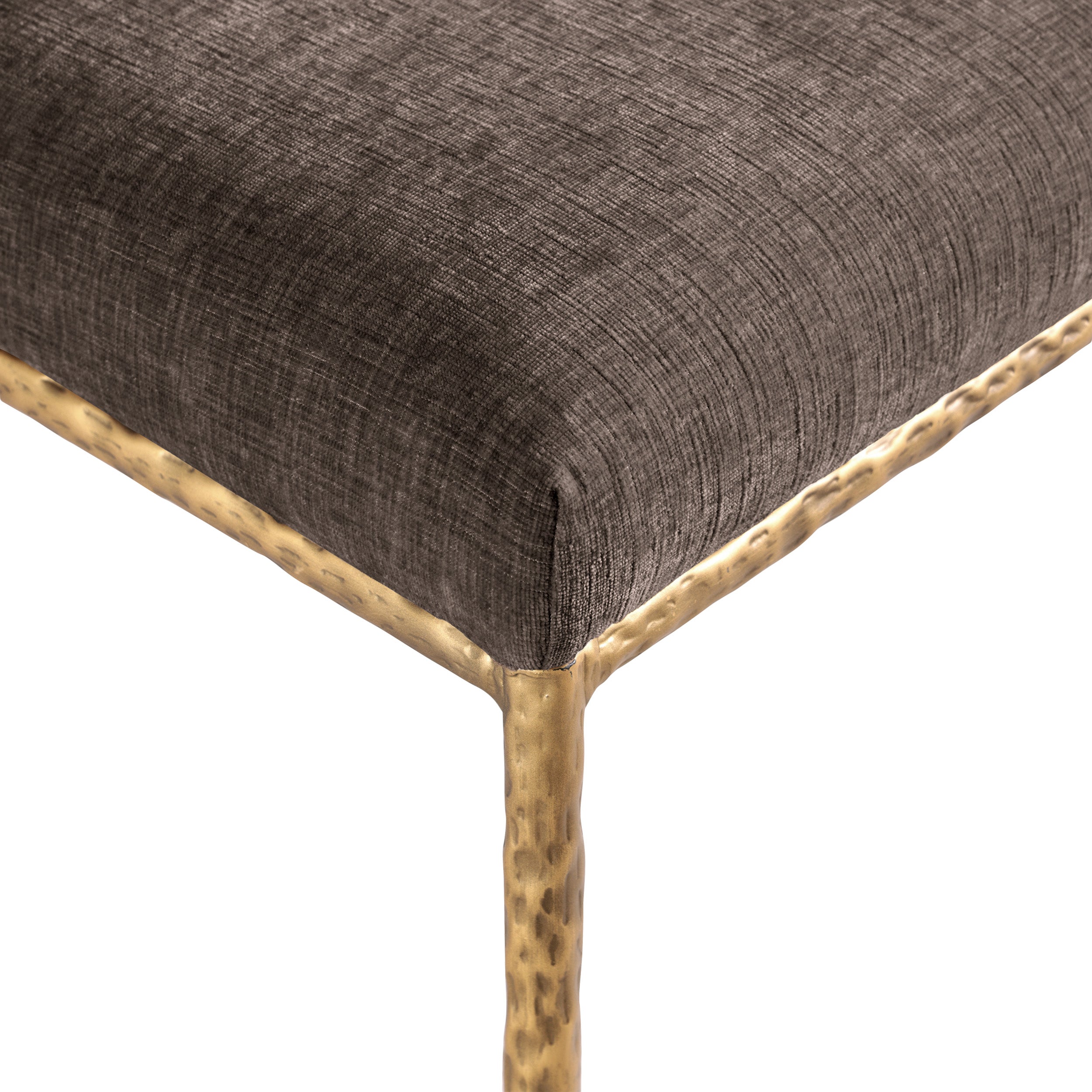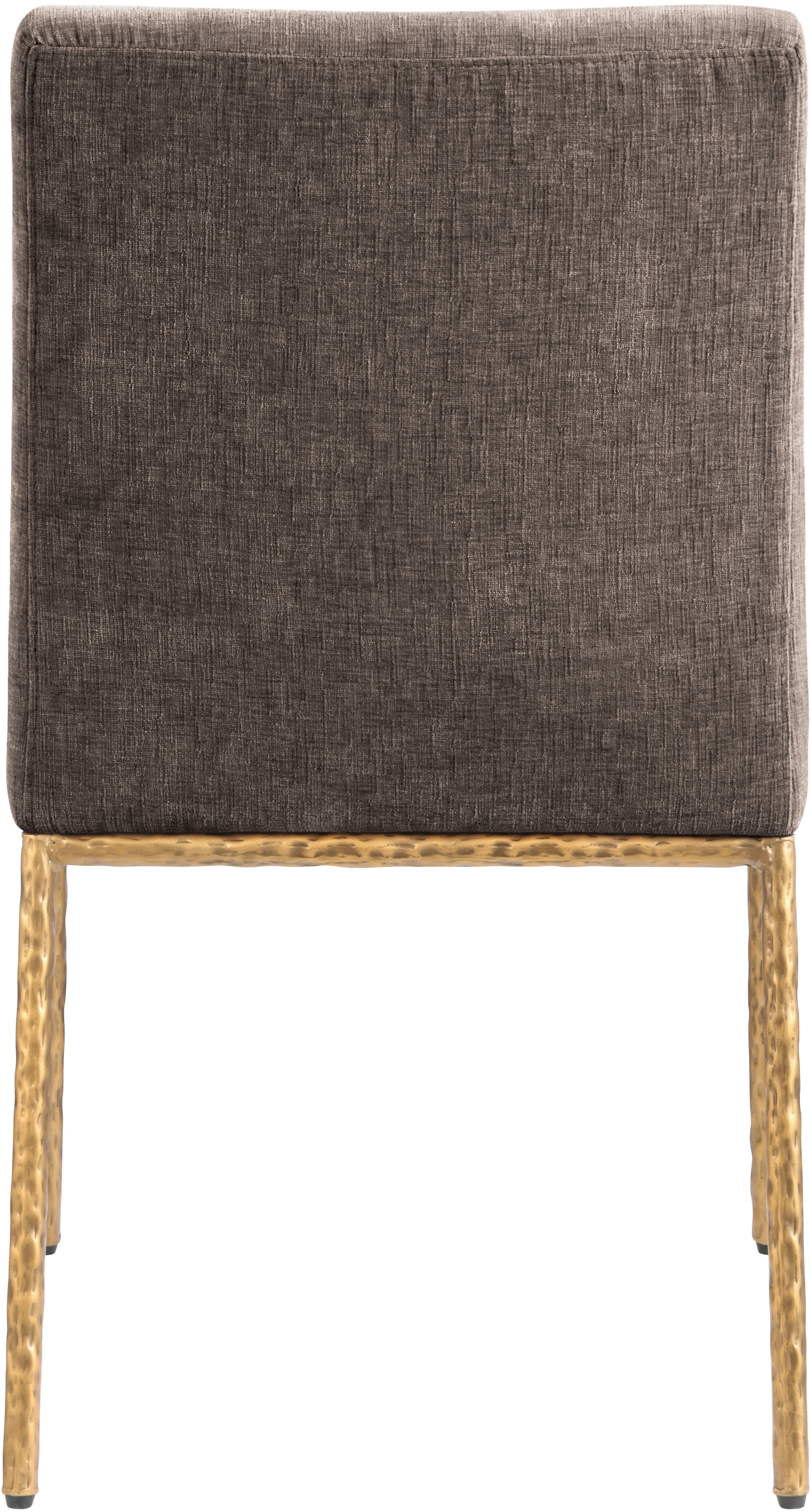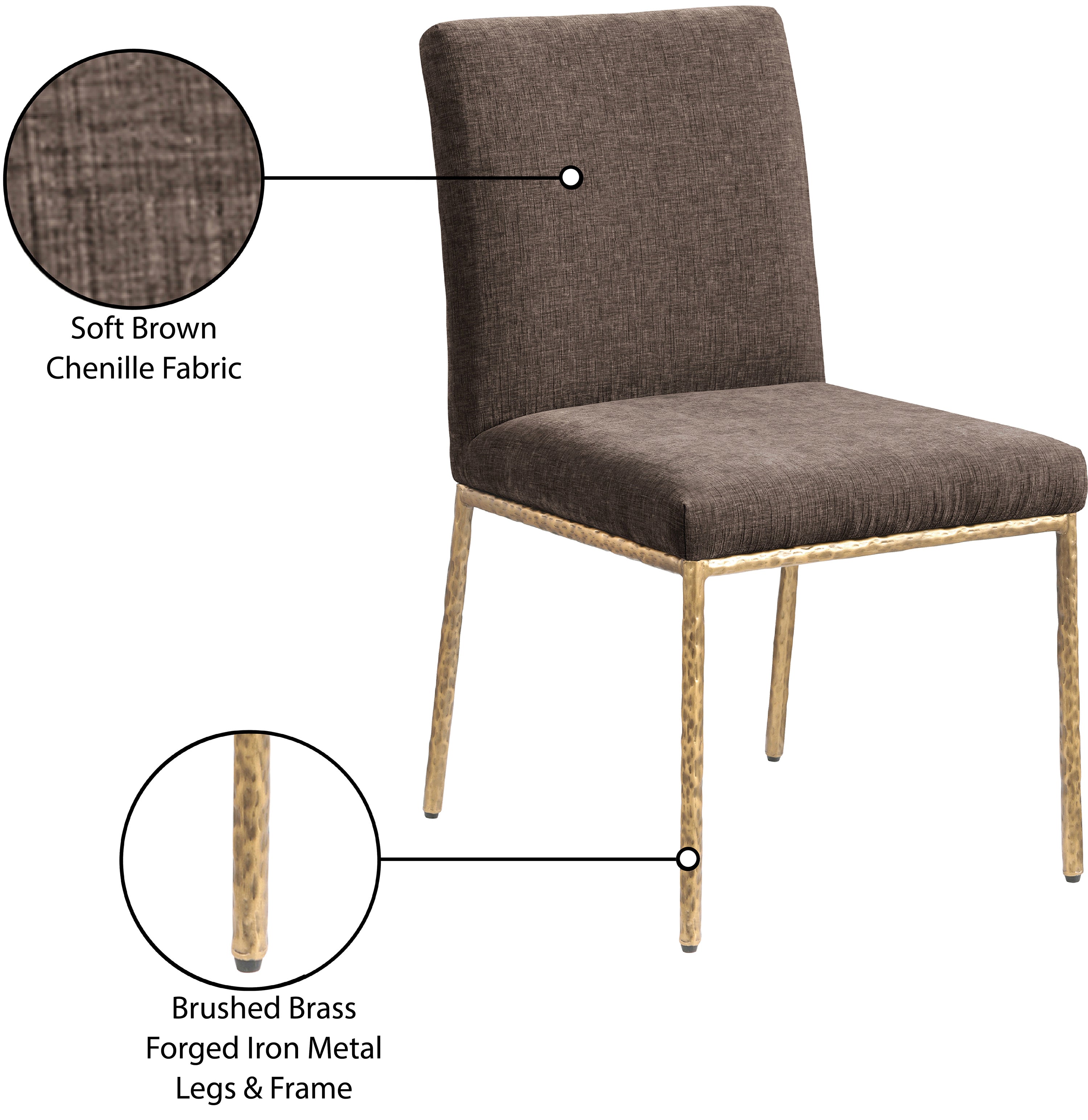 With an effortless sophistication, the Reeves brown chenille fabric upholstered dining side chair elevates your dining space with its soft fabric and elegantly textured design. Supported by sturdy, hand-forged brushed brass metal legs, this chair blends refined comfort with artisanal craftsmanship. Its clean silhouette and plush upholstery make it a perfect addition to modern and transitional interiors, offering both style and everyday functionality.