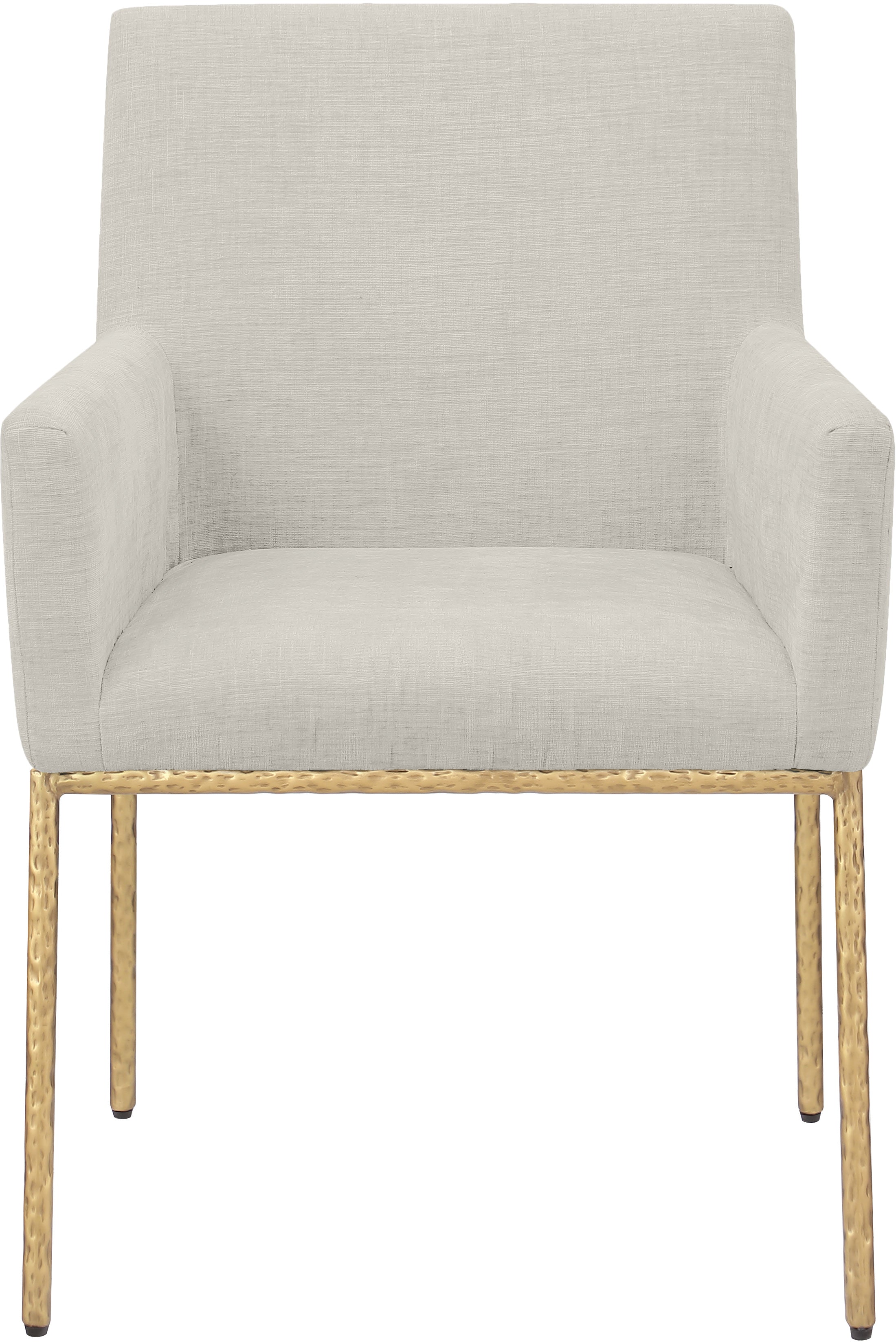 Casual comfort is the order of the day when dinner guests relax from the cozy confines of this Reeves soft cream chenille fabric dining chair. Sumptuously padded arms, back, and seat ensure total comfort from appetizers through dessert, and the neutral, solid-colored upholstered makes it easy to pair this dining chair with the table of your choice. An all-metal brushed brass frame and legs lend a contemporary finish and impeccable sturdiness and strength for long-term enjoyment.