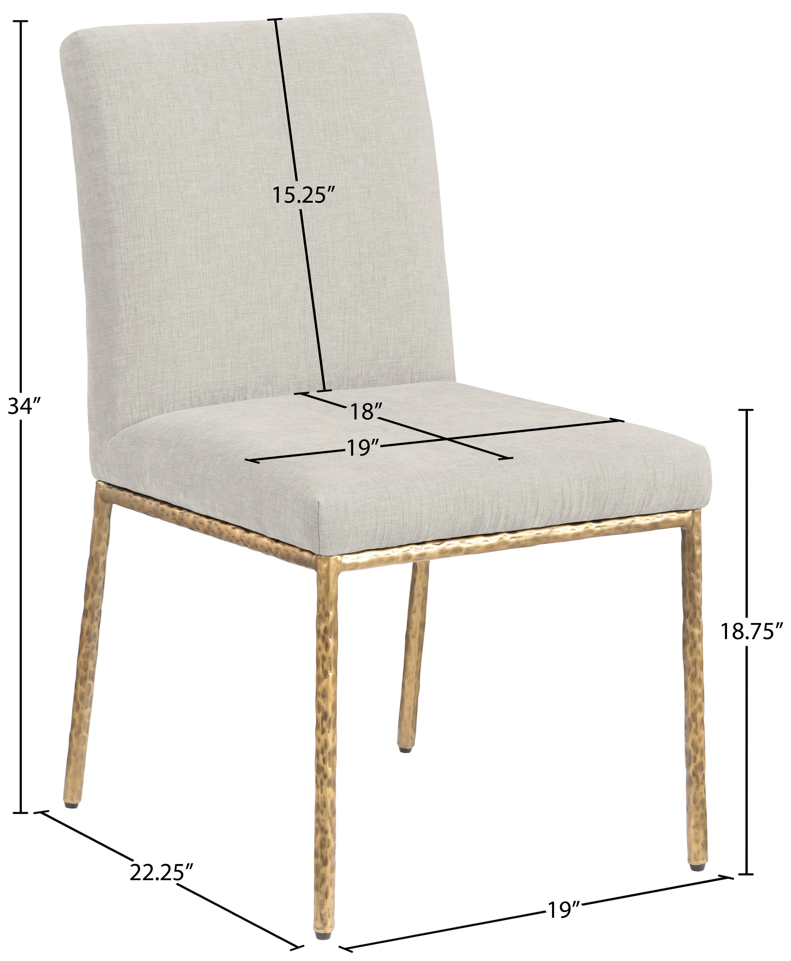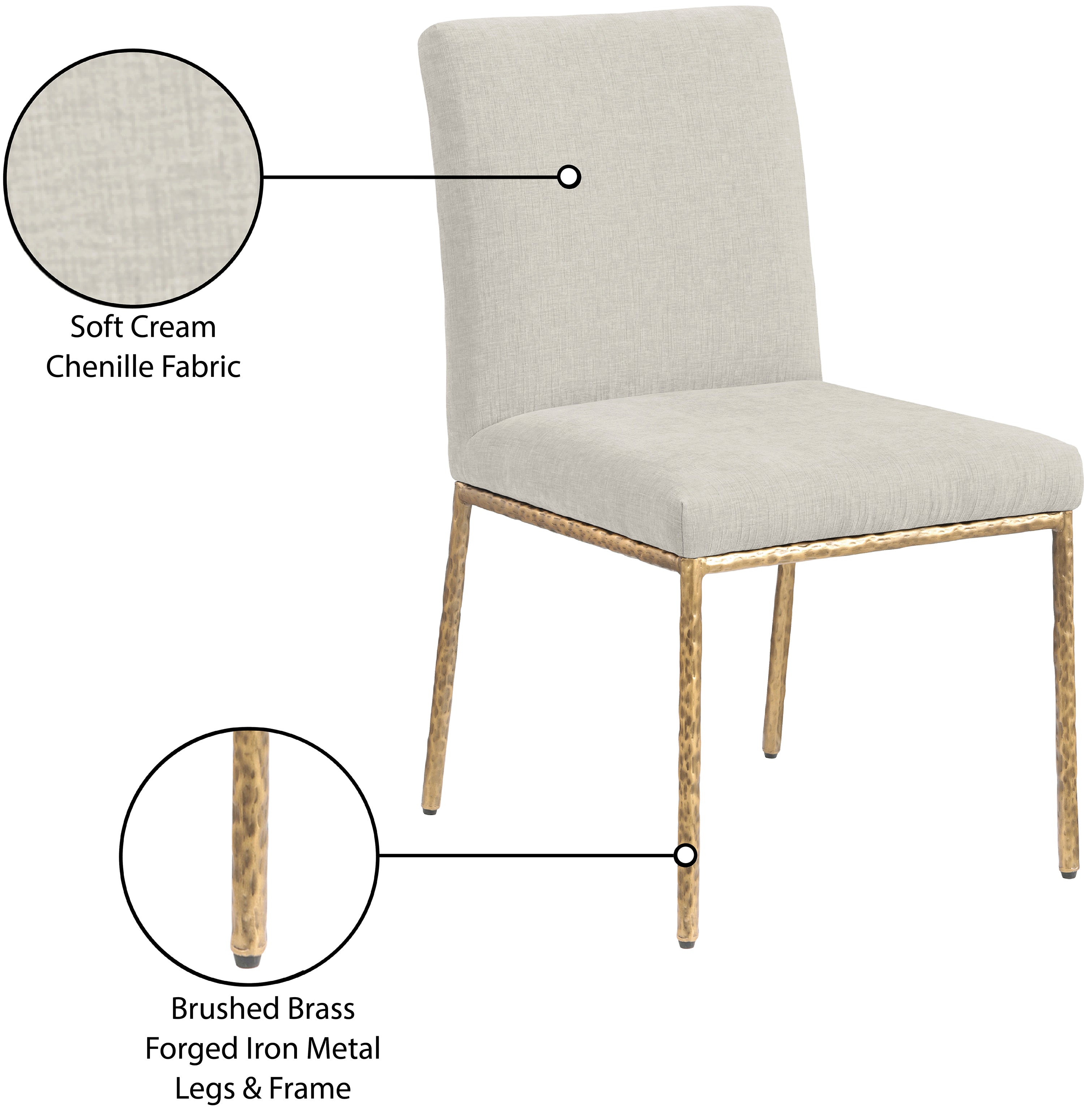 With an effortless sophistication, the Reeves cream chenille fabric upholstered dining side chair elevates your dining space with its soft fabric and elegantly textured design. Supported by sturdy, hand-forged brushed brass metal legs, this chair blends refined comfort with artisanal craftsmanship. Its clean silhouette and plush upholstery make it a perfect addition to modern and transitional interiors, offering both style and everyday functionality.