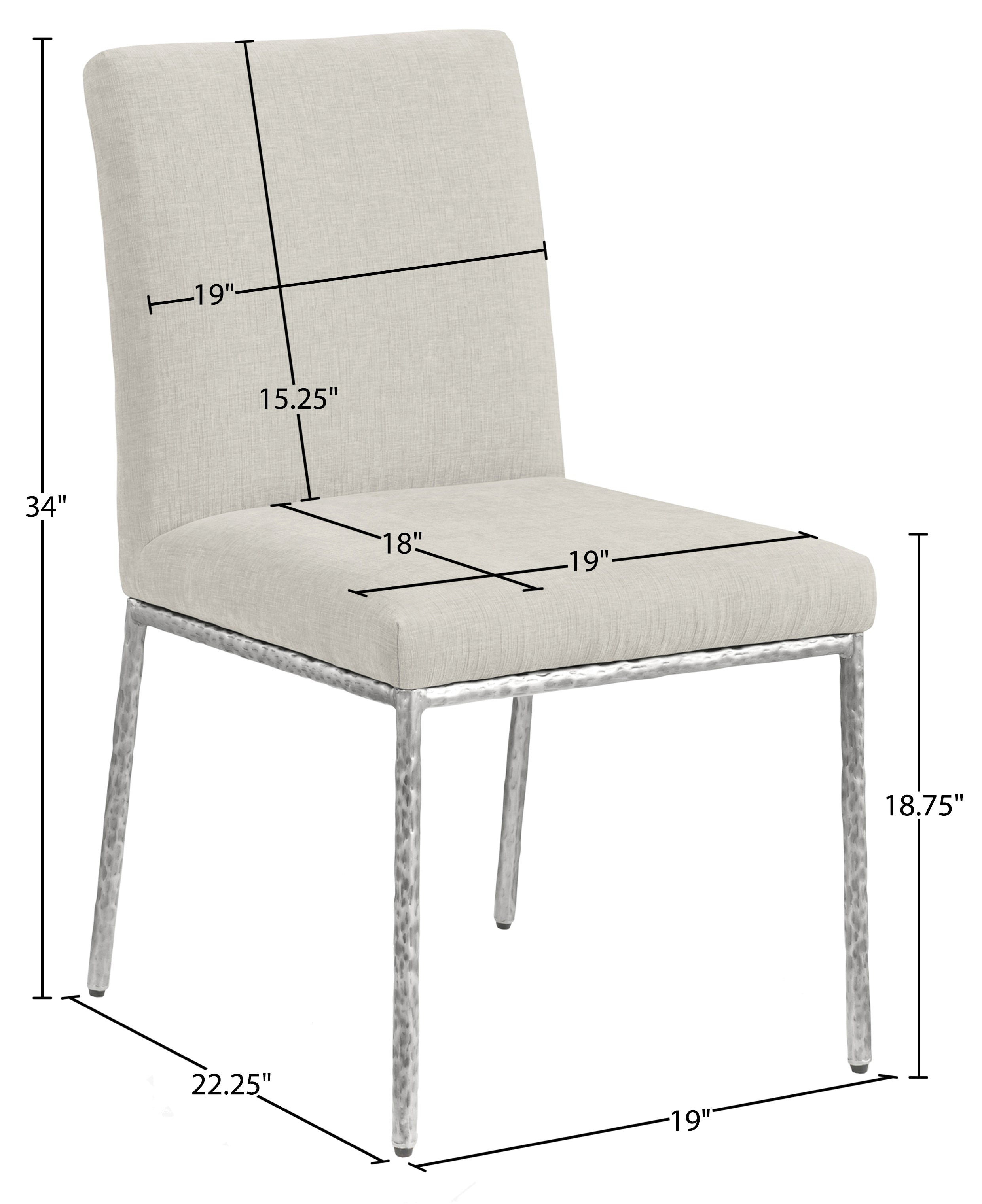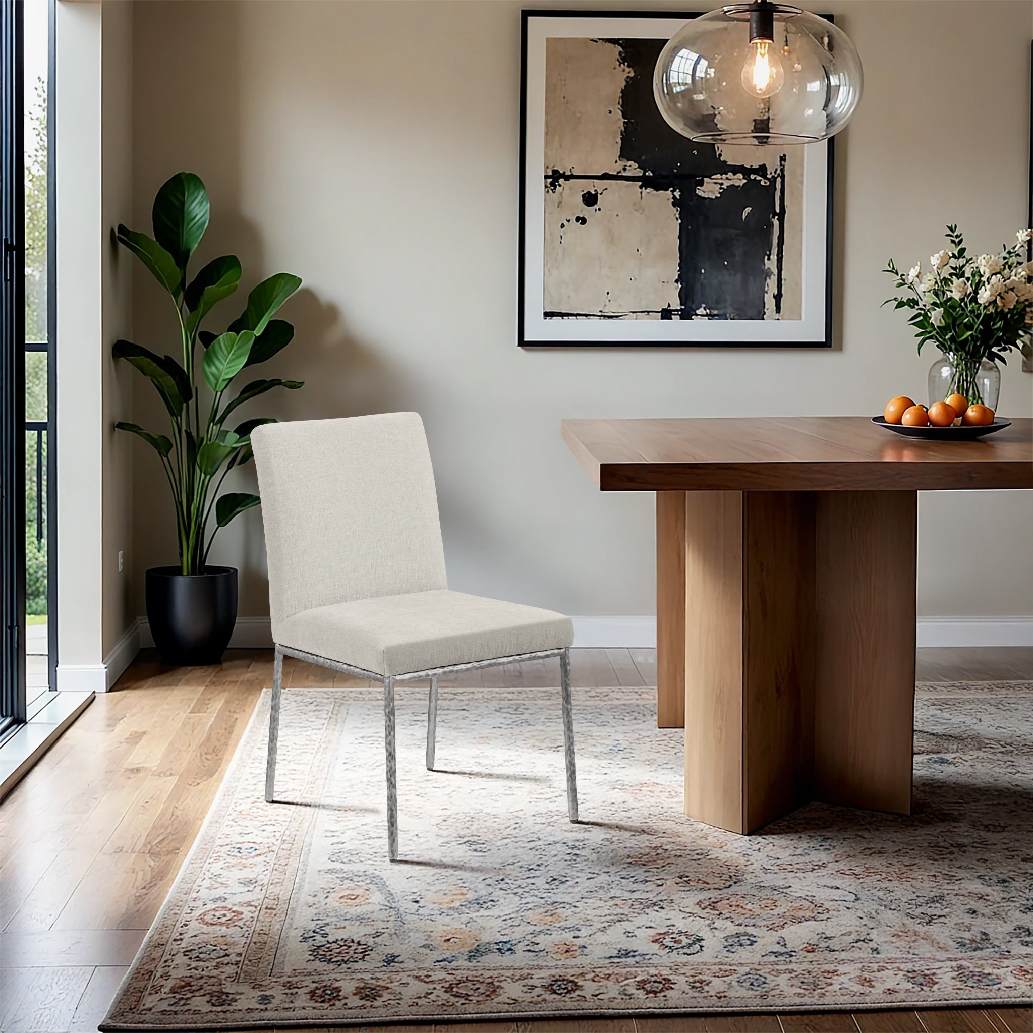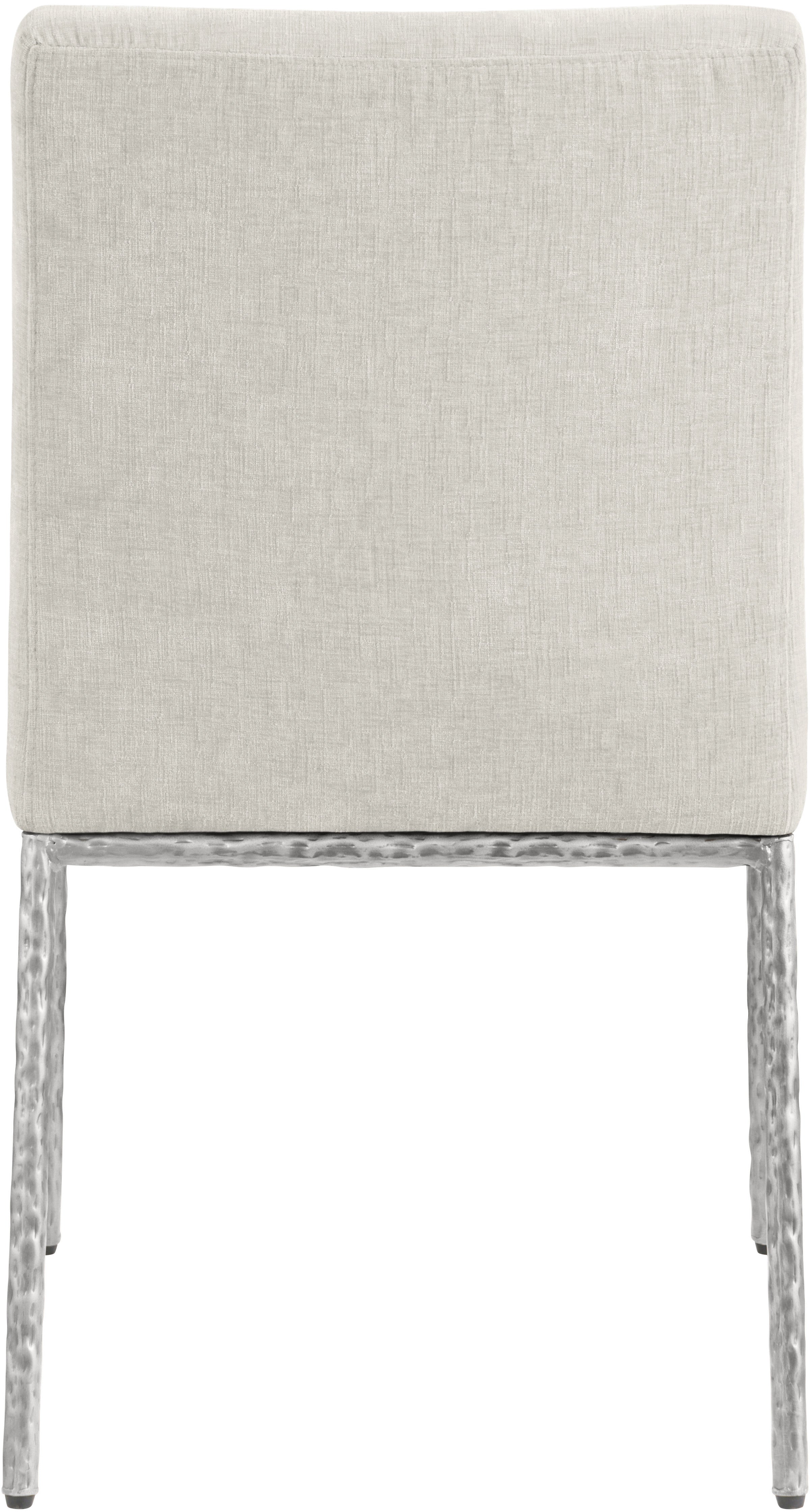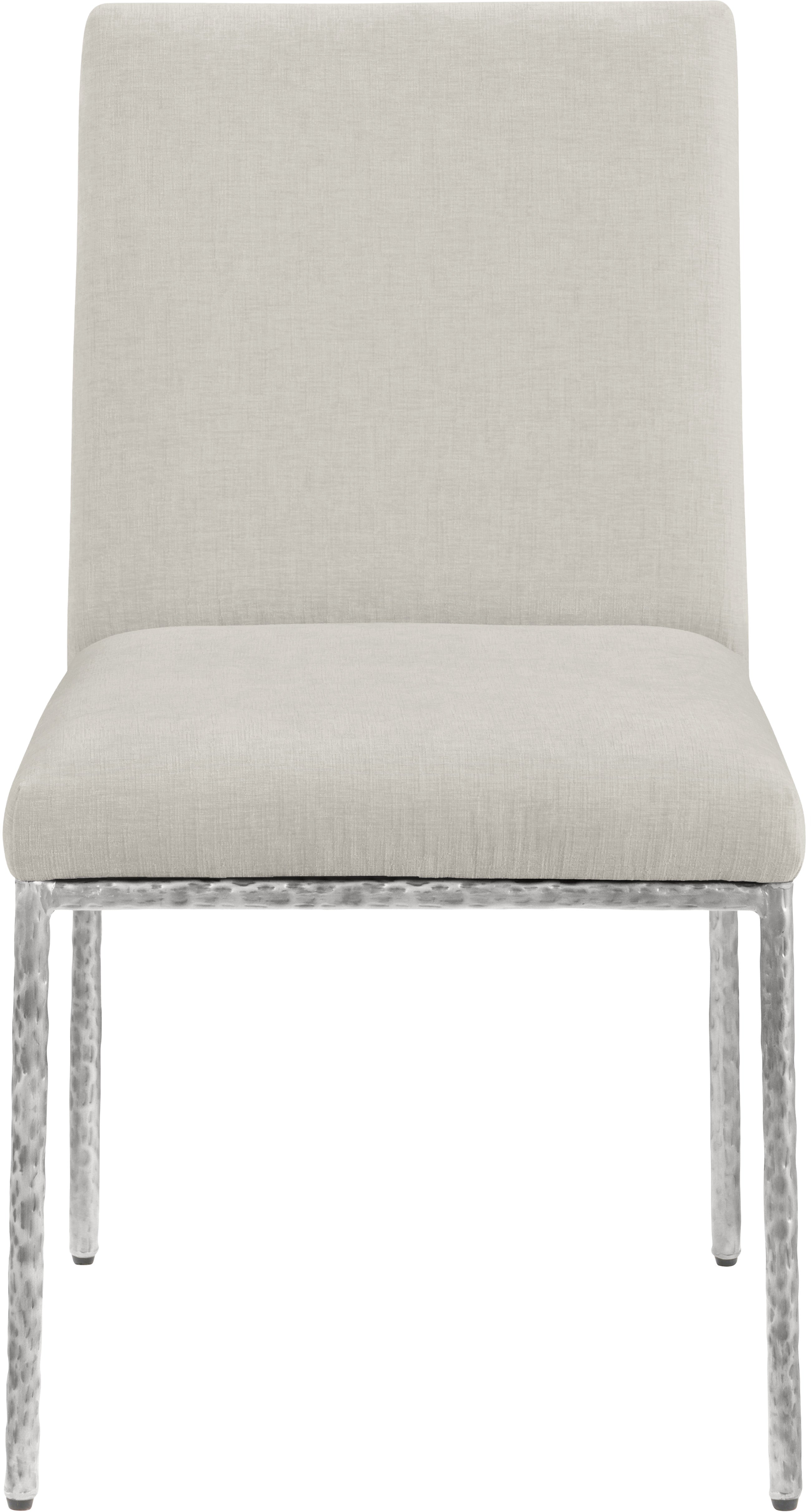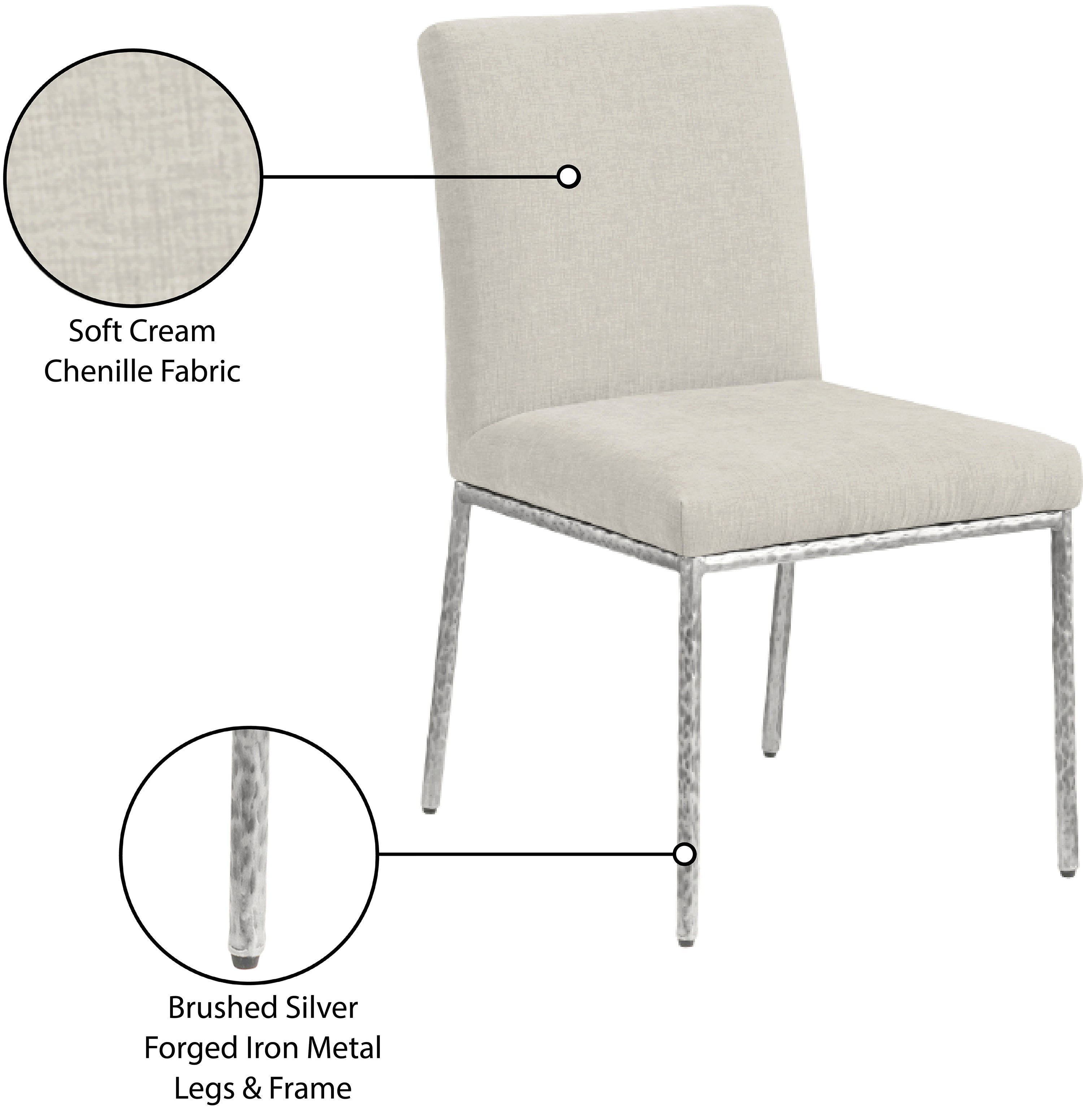 With an effortless sophistication, the Reeves cream chenille fabric upholstered dining side chair elevates your dining space with its soft fabric and elegantly textured design. Supported by sturdy, hand-forged brushed silver metal legs, this chair blends refined comfort with artisanal craftsmanship. Its clean silhouette and plush upholstery make it a perfect addition to modern and transitional interiors, offering both style and everyday functionality.