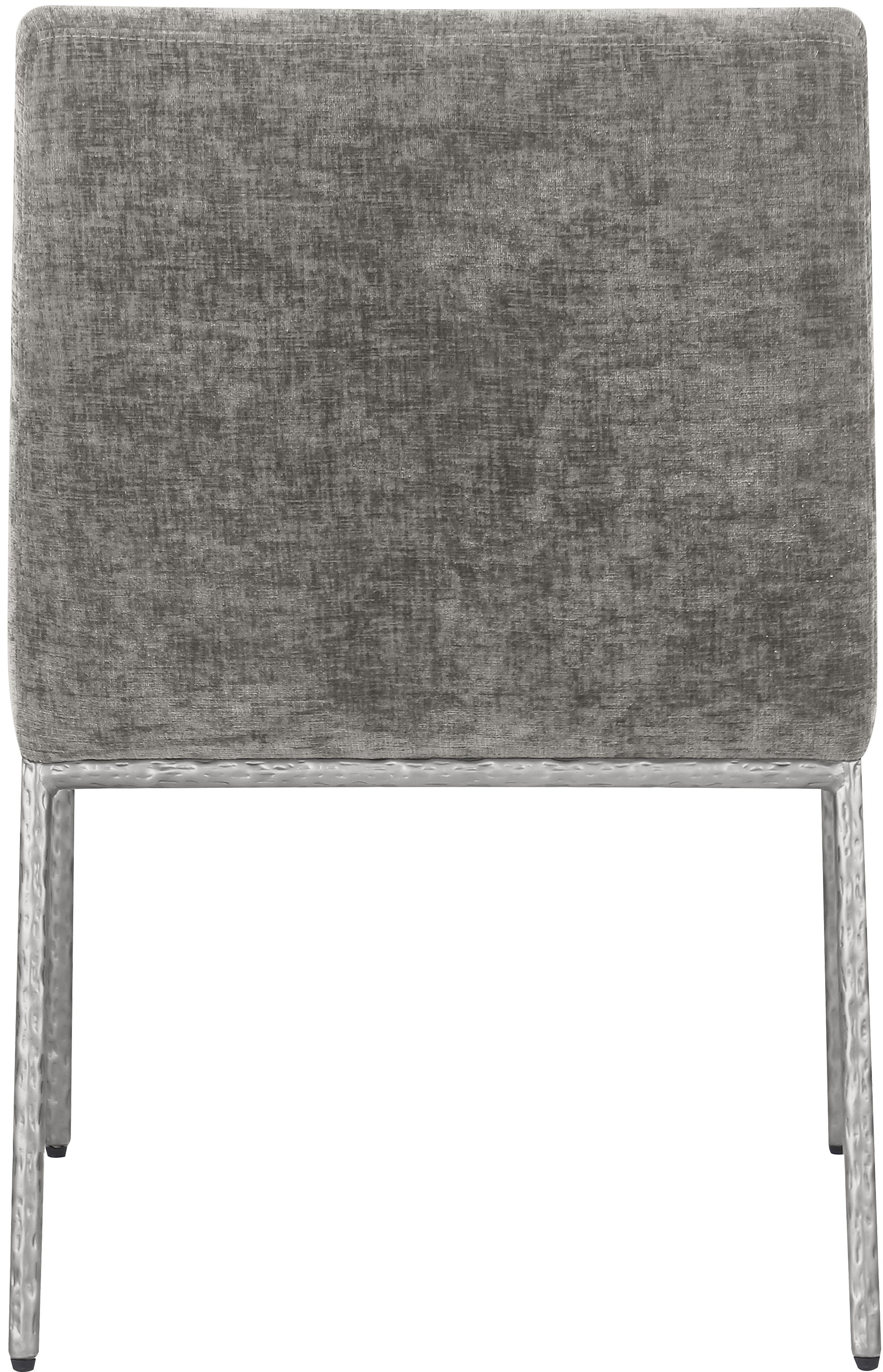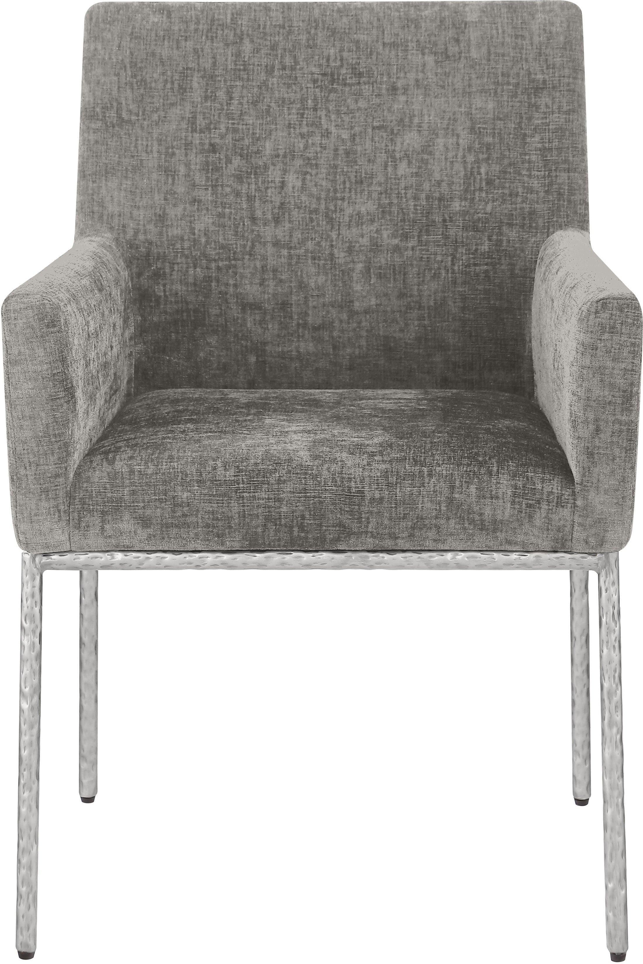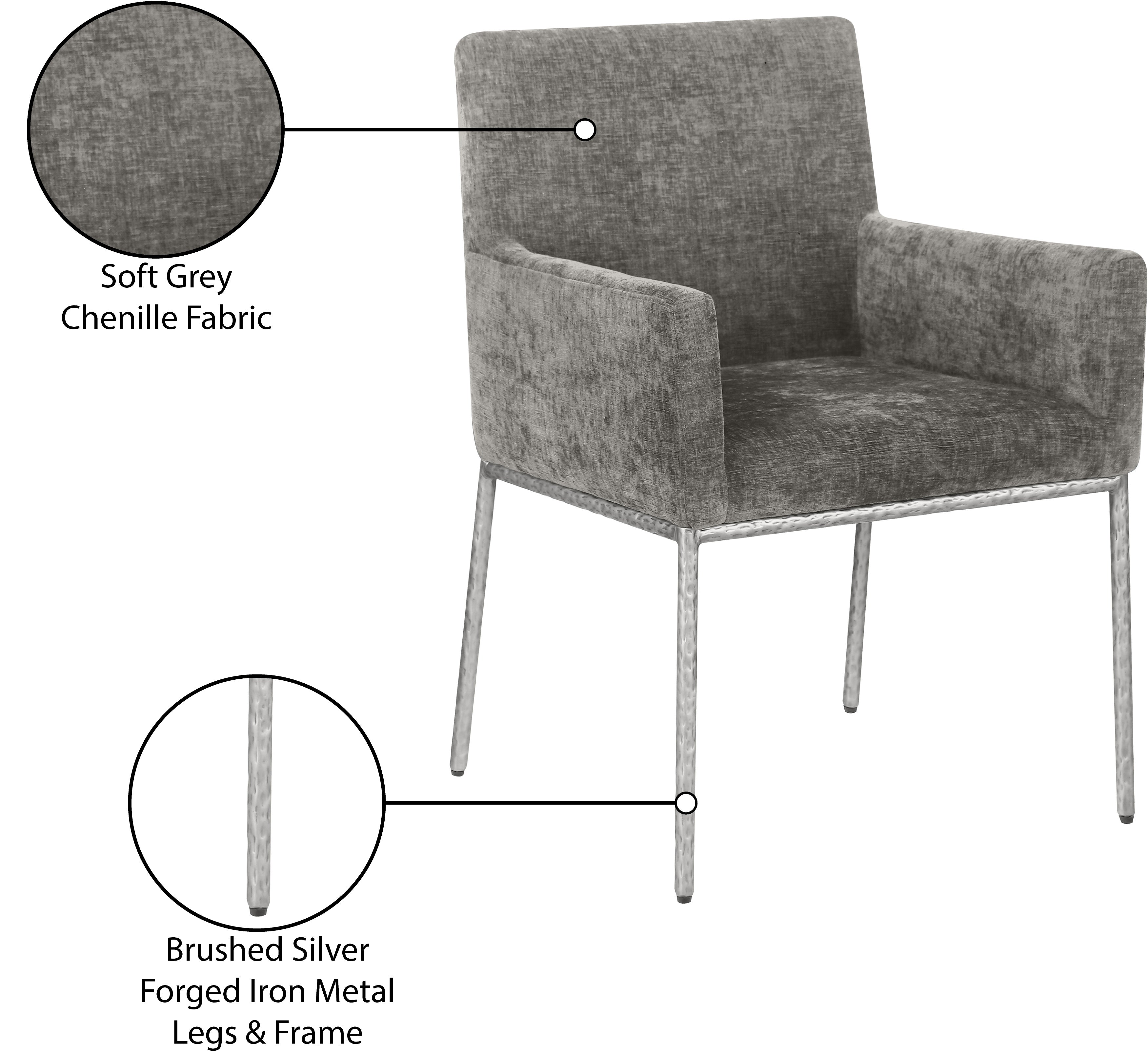 Casual comfort is the order of the day when dinner guests relax from the cozy confines of this Reeves soft grey chenille fabric dining chair. Sumptuously padded arms, back, and seat ensure total comfort from appetizers through dessert, and the neutral, solid-colored upholstered makes it easy to pair this dining chair with the table of your choice. An all-metal brushed silver frame and legs lend a contemporary finish and impeccable sturdiness and strength for long-term enjoyment.